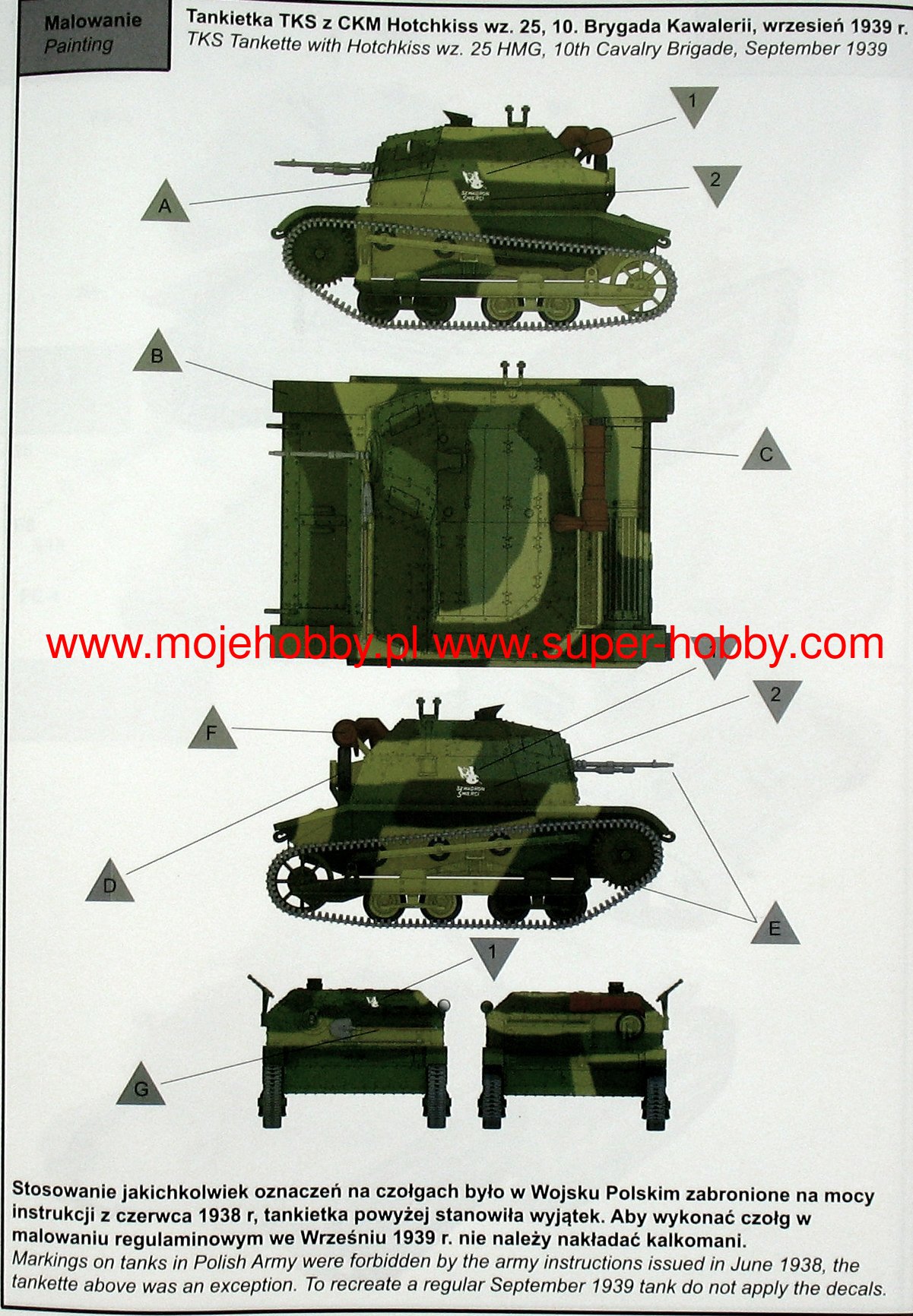 TKS is a Polish light tank (tankette) from the Second World War. The first prototypes of the vehicle were made in 1933, and serial production continued in the period 1934-1936, ending with the production of 280 copies of this vehicle. The TKS was powered by an engine Polish Fiat 122B with 46 HP. The vehicle was armed with one 7.92 mm Hotchkiss wz.25 machine gun or one of the heaviest wz. 38 FK-A with a caliber of 20 mm. TKS was created as a modernization and development of the TK-3 vehicles. Compared to the original, the front part of the fuselage has been changed, a new engine with a little more power has been added, the armor has been strengthened - especially in the front part of the car, the running gear and electrical system have been modernized. The changes led to a virtually completely new vehicle. However, the existing weaponry, i.e. a single machine gun, was retained, and it was planned to be replaced with a 20 mm caliber weapon. However, the outbreak of war in 1939 thwarted these plans and only about 20-30 TKS were modernized in this way. Due to the large number of TKS produced by Polish standards, they were the basic element of the Polish armored forces during the September campaign in 1939. TKS tankettes were also exported to Estonia, and the copies obtained in 1939 were used by both the German and Soviet armies.