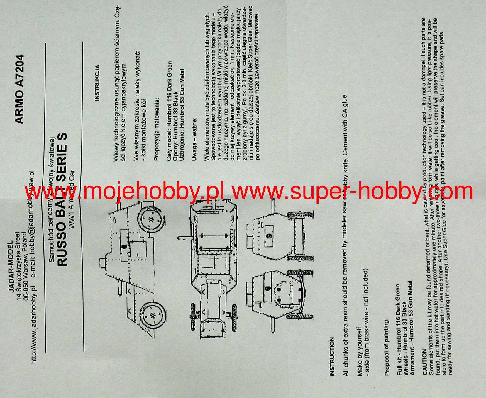 Russo Bałt Typ S (albo Typ C) to rosyjski samochód pancerny z okresu I wojny światowej. Długość wozu wynosiła 4,46 metra, przy szerokości rzędu 1,98 metra. Napęd zapewniał pojedynczy silnik Russo-Bałt C o mocy 61 KM. Zasięg działania nie przekraczał 100 kilometrów. Uzbrojenie pojazdu składało się z 3-4 karabinów maszynowych kal. 7,62 mm. Przyjmuje się, że w sumie wyprodukowano jedynie od 8 do 15 wozów tego typu. Samochód pancerny Russo Bałt Typ S/C był pierwszym w dziejach Rosji pojazdem tego typu wyprodukowanym w pełni siłami rodzimego przemysłu. W celu skrócenia prac w nowym pojeździe zastosowano podwozie samochodu Bałt C 24/40. Samochód posiadał pancerz złożony z płyt pancernych o grubości do 6,5 milimetra, a jego uzbrojenie nie było umieszczone w obrotowej wieży, a w przedziale załogowym pojazdu. Wozy Russo Bałt wzięły aktywny udział w I wojnie światowej, ale też w wojnie polsko-bolszewickiej (1919-1921) oraz w wojnie domowej w Rosji. Co oprócz modelu będę potrzebować do jego sklejenia?