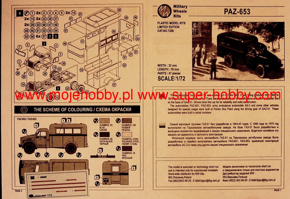 PAZ-653 is a Soviet sanitary truck from the post-war period. The first copies of the PAZ-651 vehicle family (to which the PAZ-653 also belonged) appeared in the late 1940s, and their serial production continued in 1950-1973. The drive was provided by a single 70 HP 6-cylinder engine. The power transmission was provided by a 4-speed manual and unsynchronized gearbox. The bus offered up to 20 seats, with a total of 23 seats. The PAZ-651 family of buses was developed based on the chassis and engine used in the GAZ-51 truck. Besides, the GAZ plants supplied the chassis for the production of these buses. The front of this family of vehicles also did not differ significantly from the GAZ-51. On the other hand, in the middle and rear part there is a passenger compartment, connected, however, with the driver's cabin. On the basis of the basic version of the PAZ-651 bus, the PAZ-653 model was quickly developed, which was produced in 1950-1956. It was a sanitary vehicle, capable of transporting 4 stretchers with a medical staff member. In this version, the sanitary compartment was not connected to the driver's cabin.