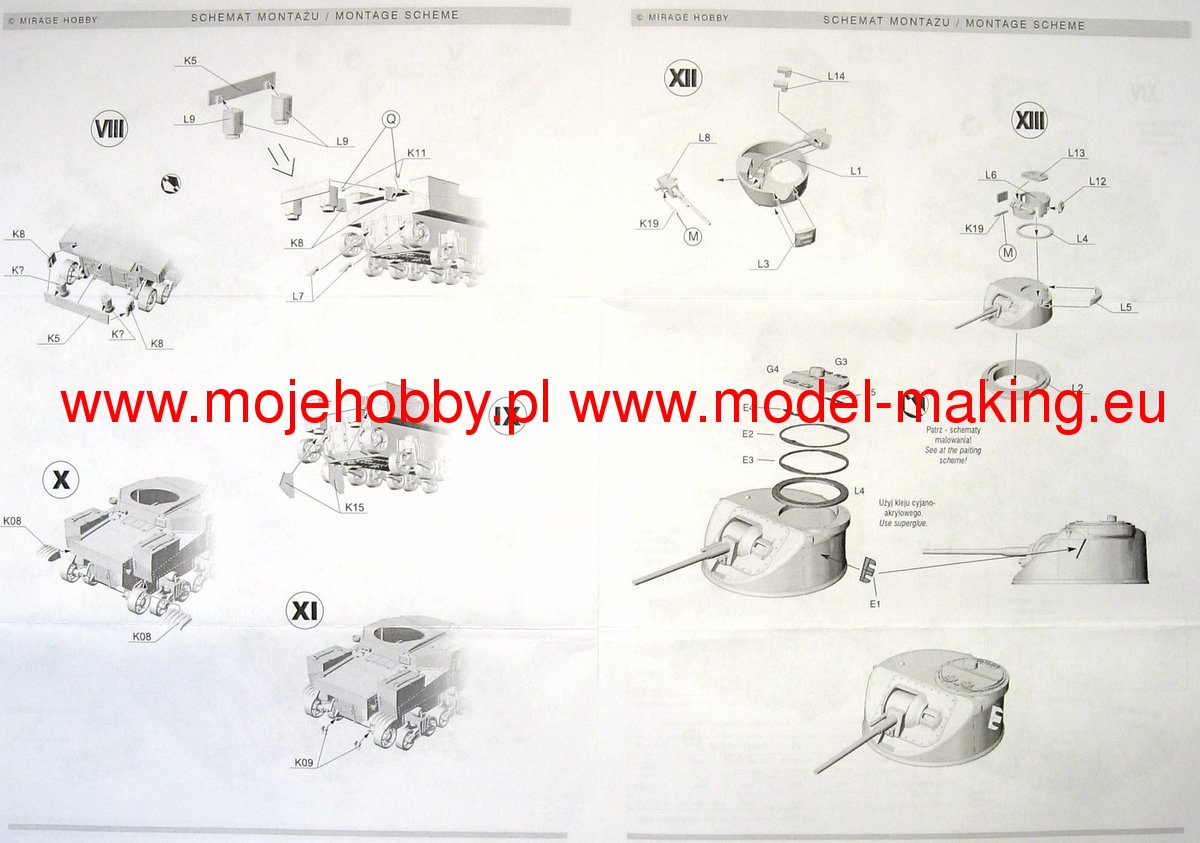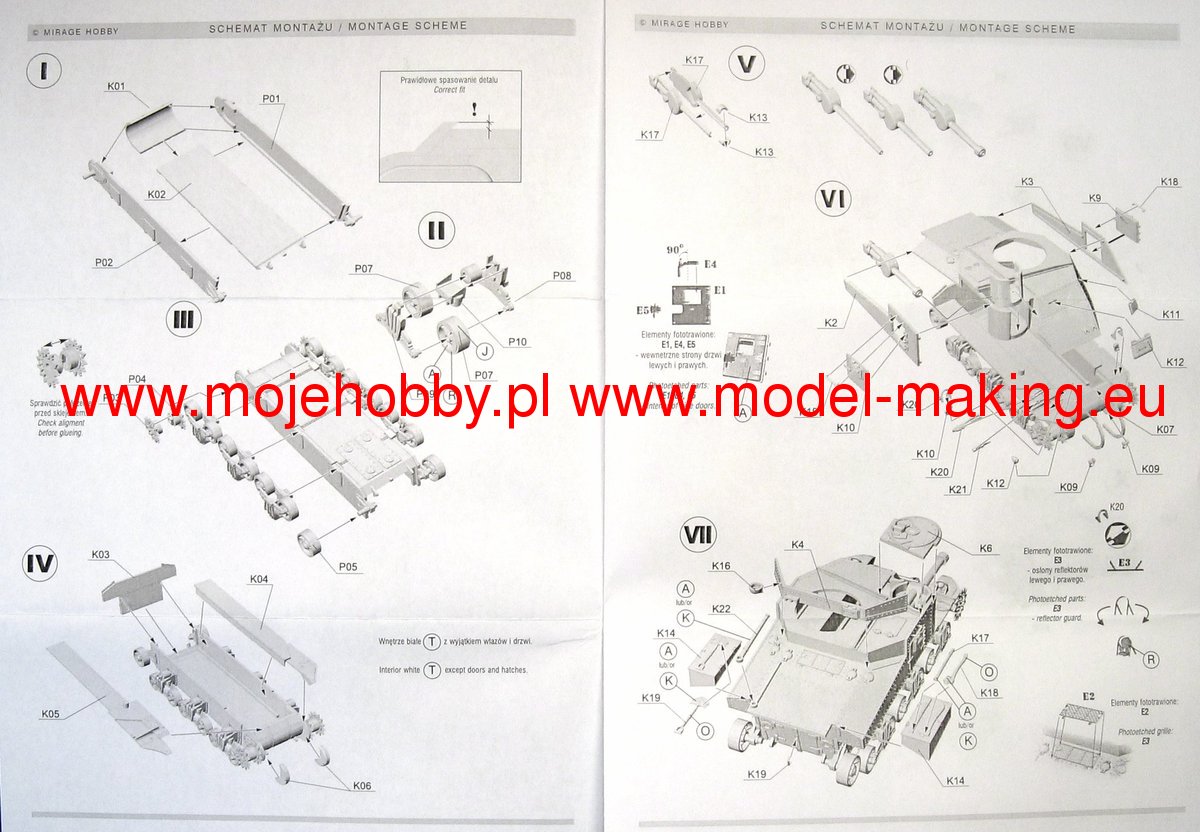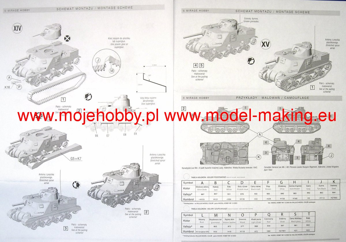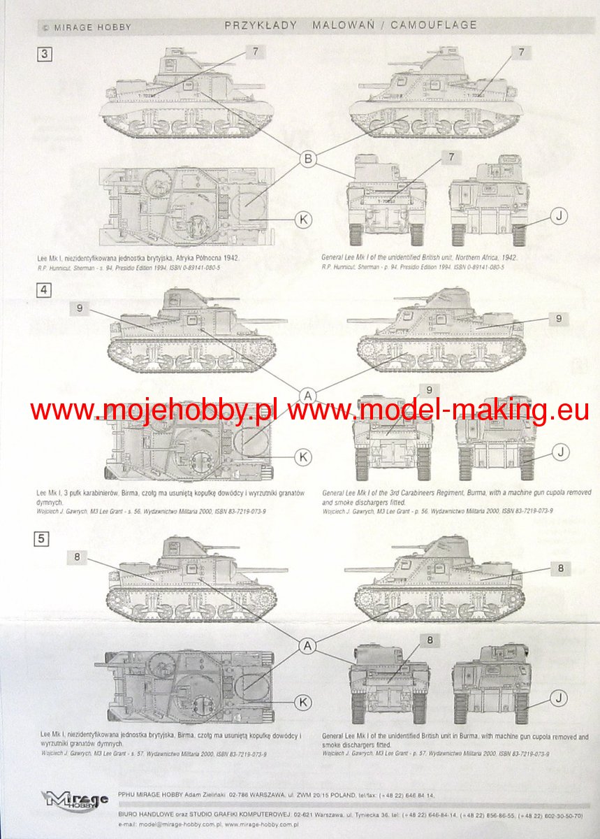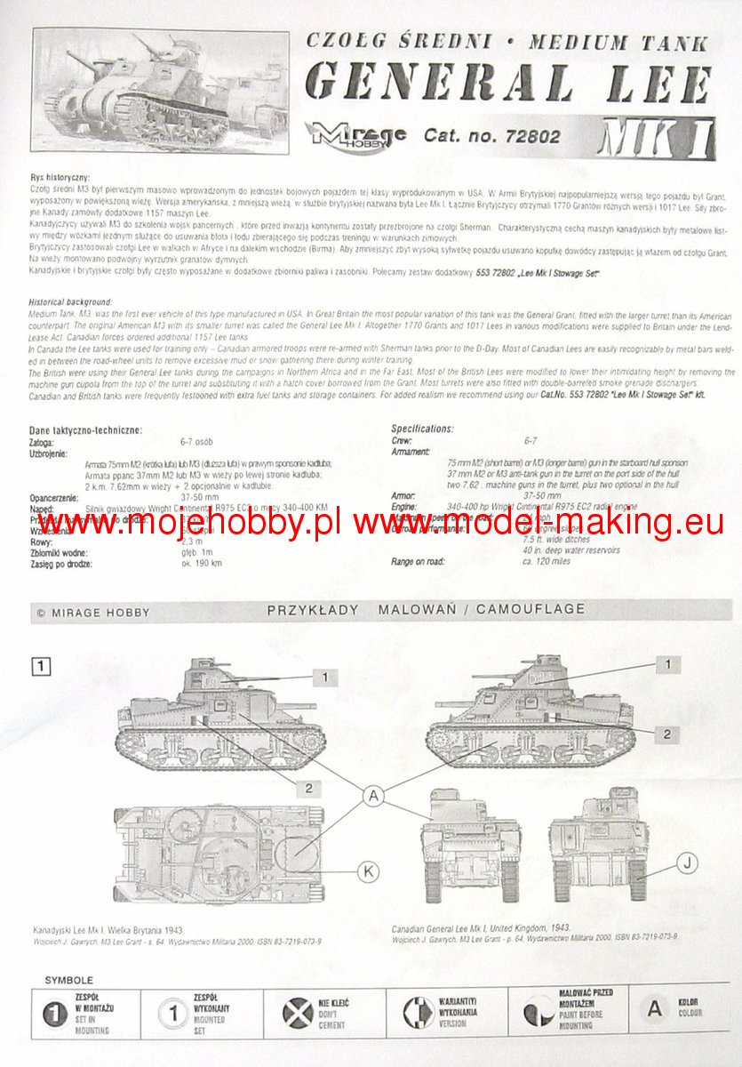 Download Mirage Hobby PDF catalogueThe M3 Lee or Grant was an American heavyweight medium of the Second World War. The first prototypes were built in 1941, and serial production was carried out in the period 1941-1942. In total, about 6,300 copies of this tank of all versions were built. The M3 Lee was powered by a single engine Continental R 975 EC2 340 HP or two engines General Motors 6-71 with a total power of 375 HP. It was armed with a single 75mm M2 or M3 gun in the hull, a single M5 or M6 37 gun mounted in the turret, and two or three 7.62mm Browning1919A machine guns. The French campaign of 1940 made a great impression on the command of the US Army and made them realize that the M2 tank being put into production at that time did not meet the requirements of the battlefield. While waiting for the target structure, which turned out to be the M 4 Sherman, the project was commissioned to develop a transitional structure that would enable fairly equal combat with the Pz.Kpfw III and Pz.Kpfw IV vehicles. Yes, in 1941, the first prototype of the M3 Lee tank - called the Grant by the British - was created. The new tank had several advantages (nice armor when introduced to the line, high reliability and strong armament), but it had many disadvantages: low ability to negotiate obstacles, a very high silhouette that made camouflage difficult - especially in desert conditions - and low susceptibility to modernization. As a result of this, from 1943 it was systematically withdrawn from the linear units in favor of the M4 Sherman. However, it was used after 1943 by the Red Army in secondary combat directions and during the fighting in the Pacific by the Americans. Several versions of the car were created in the course of serial production M3 Lee. Chronologically, the first one was marked as M3 and still had riveted armor. A cast-armor version of the M3A1 followed shortly after, followed by the M3A2 with a welded armor. The last version was the M3A5 with riveted armor, but an elongated 37mm barrel.