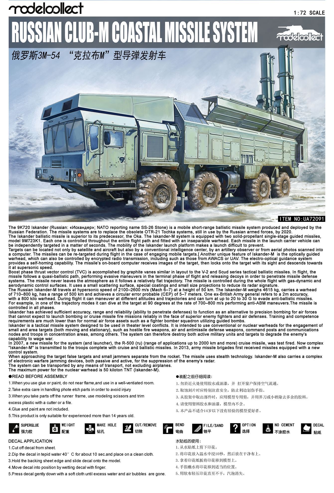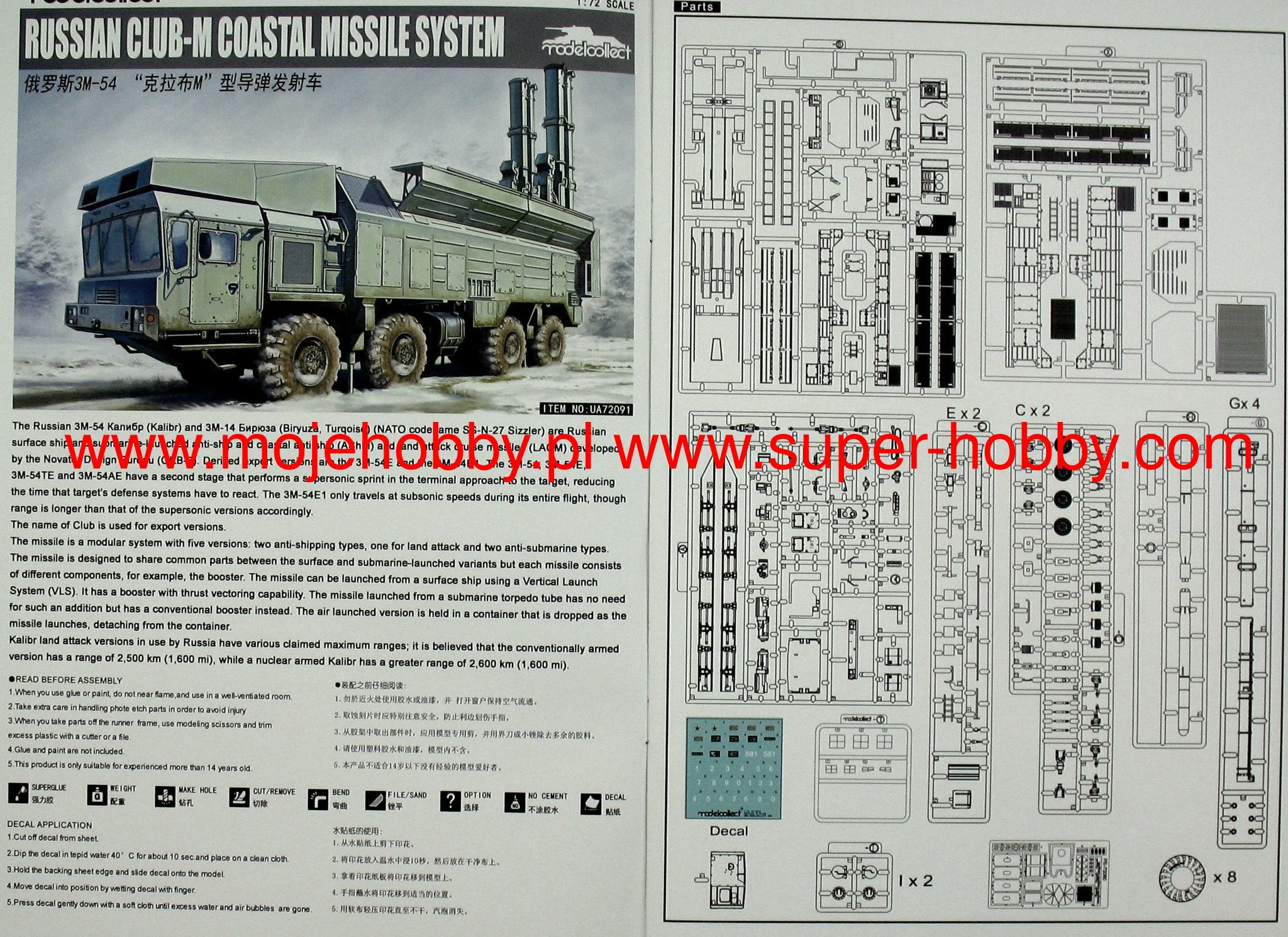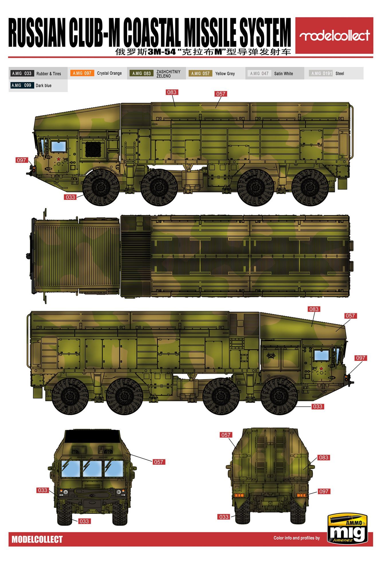 3M-54 Klub-M (albo: Club-M) to oznaczenie mobilnego systemu rakietowej obrony wybrzeża produkcji rosyjskiej z czasów współczesnych. Po raz pierwszy zaprezentowano go publicznie w 2006 roku. System jest lokowany na 8-kołowym podwozu o długości ok. 13,25 m oraz szerokości ok. 3,51 metra. Wysokość kompleksu z rakietami w pozycji marszowej wynosi ok. 3,94 metra. Wóz jest napędzany pojedynczym silnikiem YaMZ-846 o mocy maksymalnej do 500 KM. Prędkość maksymalna nie przekracza 70 km/h. System 3M-54 Klub-M został opracowany początkowo przede wszystkim na potrzeby sił zbrojnych Federacji Rosyjskiej, ale stosunkowo szybko zaczął też oferowany na rynkach eksportowych. System służy przede wszystkim do zwalczania jednostek nawodnych nieprzyjaciela, ale posiada też zdolności do zwalczania celów podwodnych i lądowych. System wykorzystuje między innymi rakiety przeciwokrętowe 3M-54E o długości 8,22 m i zasięgu ok. 220 kilometrów. Pojedyncza rakieta tego typu jest w stanie przenieść głowicę bojową o masie do 200 kilogramów. Warto dodać, że system Kalibr-M jest w swej istocie modernizacją prezentowanego wyżej systemu rakietowego. Co oprócz modelu będę potrzebować do jego sklejenia?