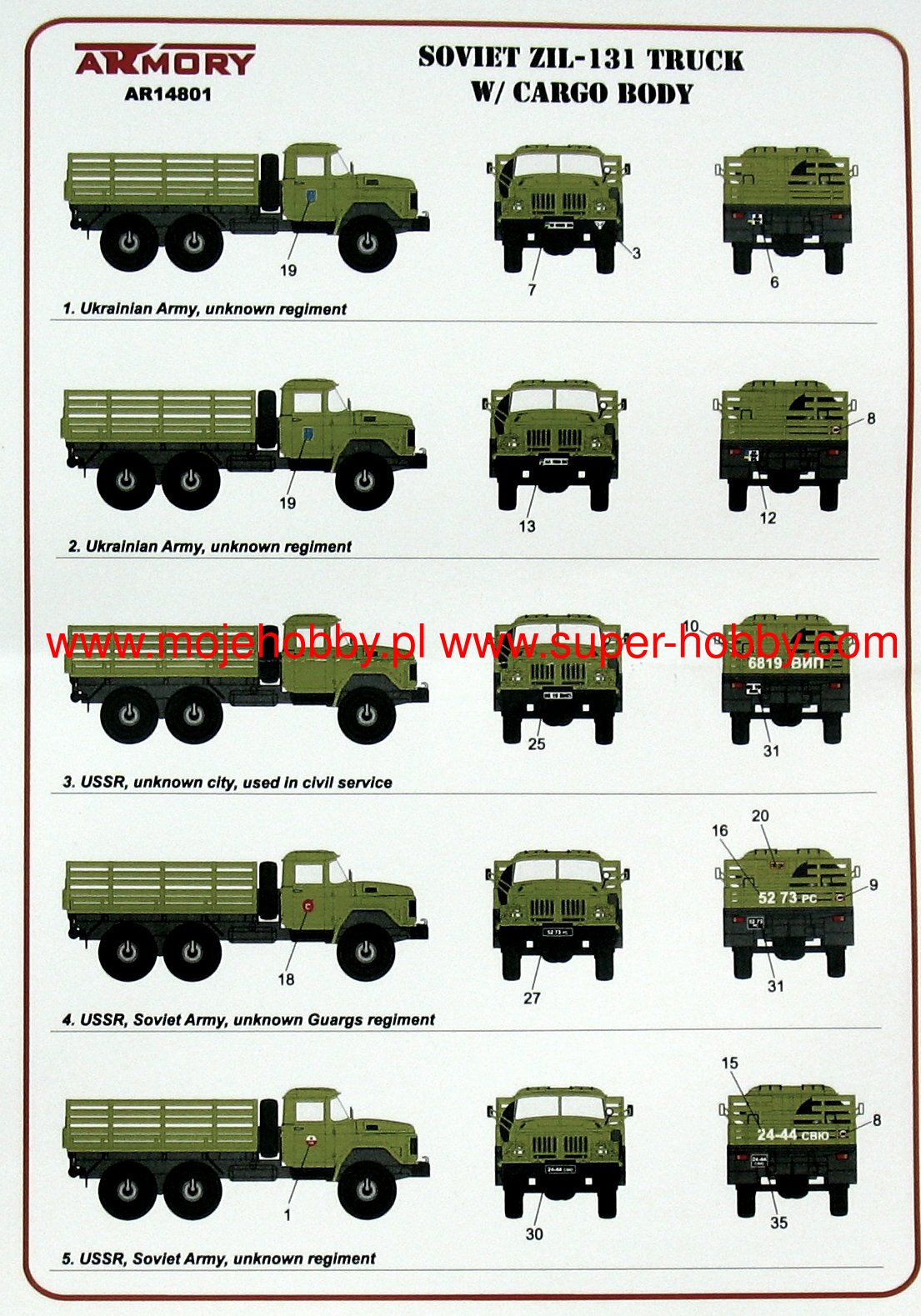 The ZiŁ-131 is a Soviet / Russian off-road truck, the first prototypes of which appeared in the early 1960s. Serial production lasted from 1966 to 2002 and was concentrated at the Ził plant in Moscow. The ZiŁ-131 was developed and put into production as a supplement and successor to the ZiŁ-157 car. Compared to its predecessor, it received primarily an engine generating much greater maximum power (150 HP compared to 109 HP), which translated into significantly better performance and a load capacity, which increased from 4500 kg to 5000 kg. In addition, a fully loaded Model 131 can also tow a 5-tonne trailer. The ZiŁ-131 has an all-wheel drive (6x6) and is characterized by good off-road ability. However, it is not very economical, because on the road it consumes up to 65 liters of fuel per 100 km, and off-road fuel consumption increases to at least 150 liters per 100 kilometers! Many specialized versions were created on the ZiŁ-a-131 chassis, such as: a garbage truck, a tanker or a truck tractor. The BM-21 Grad unguided missile launcher is also mounted on this car.