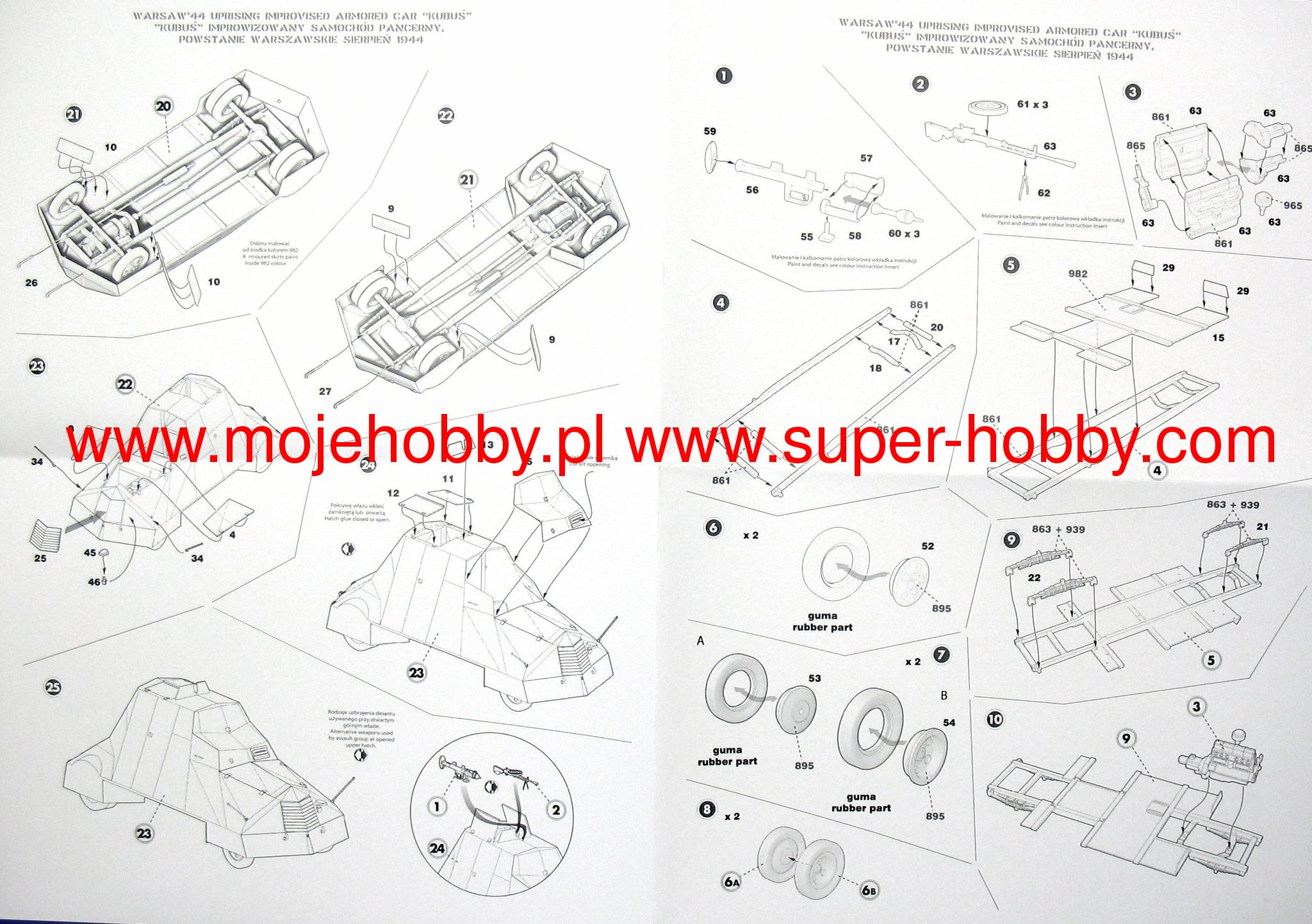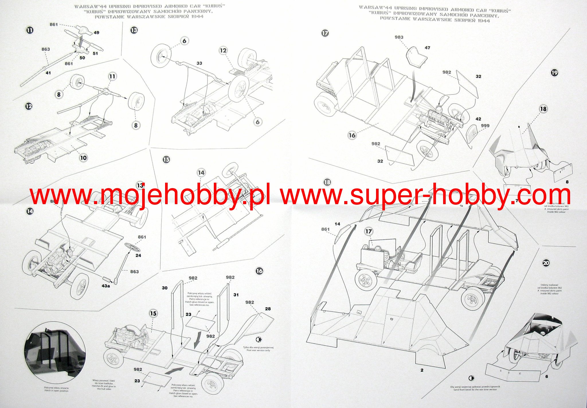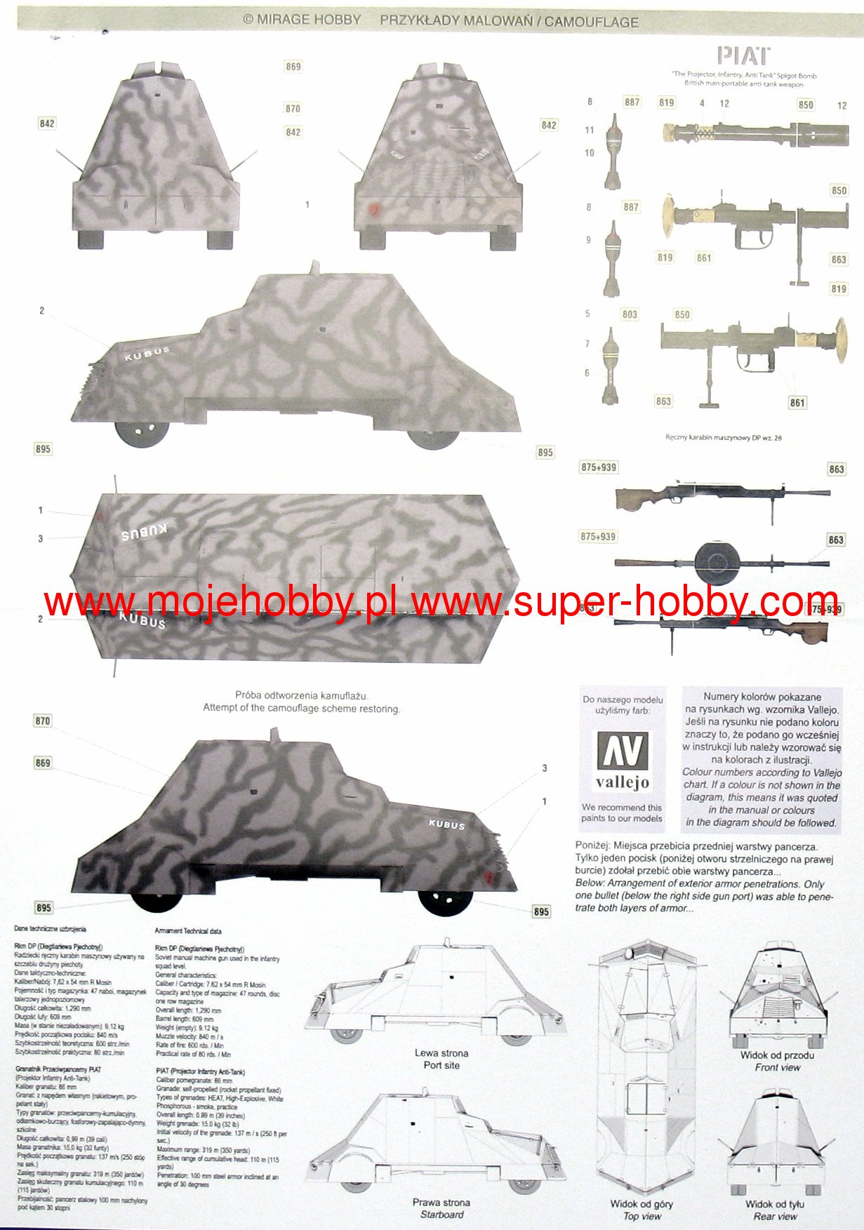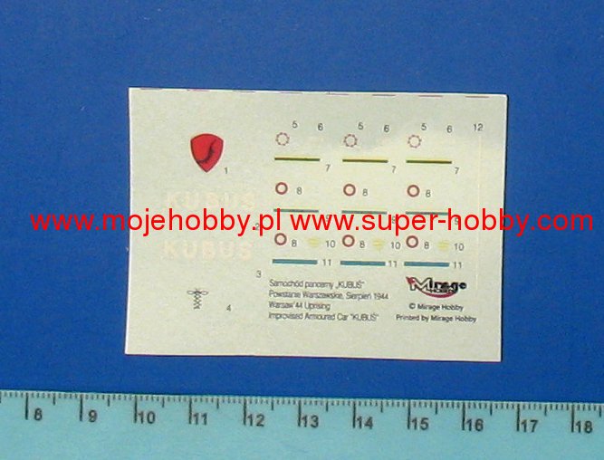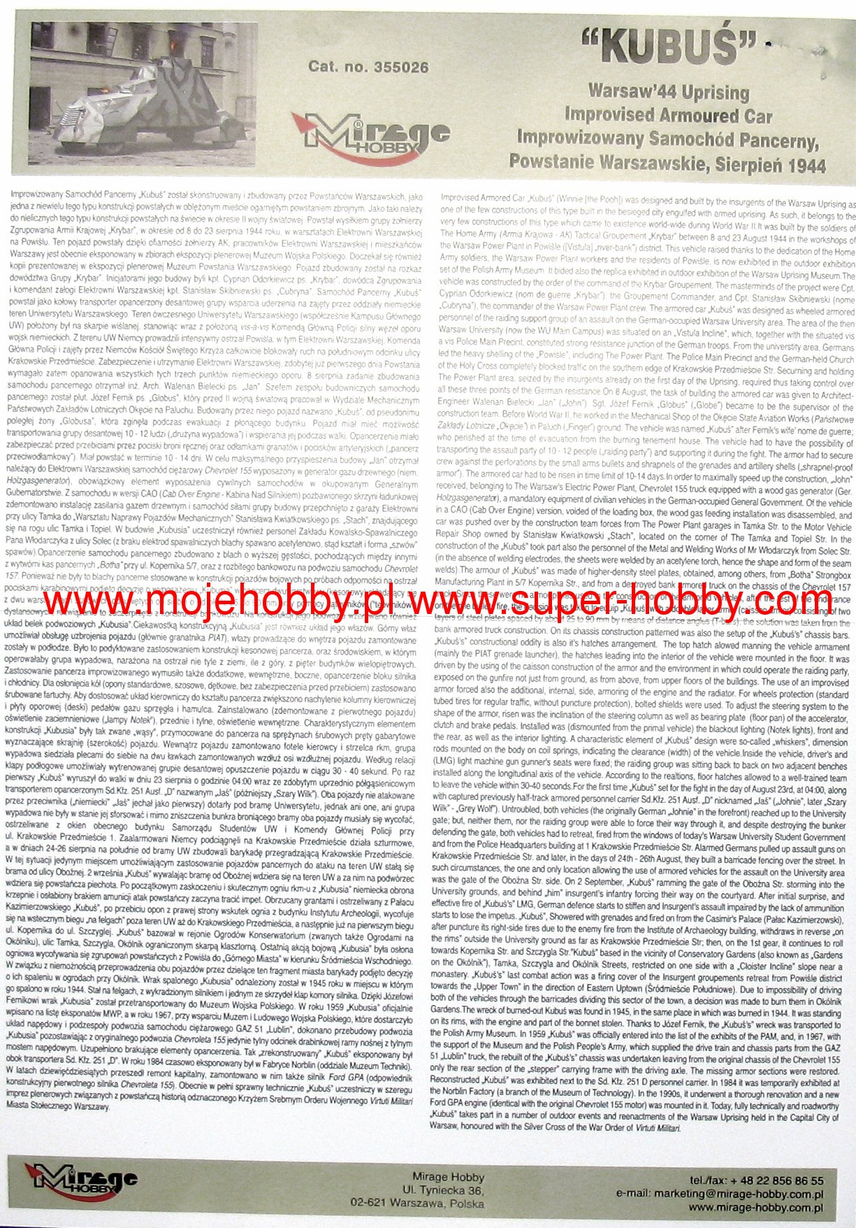 Download Mirage Hobby PDF catalogueKubuś was a Polish light armored car (armored personnel carrier) from the Second World War that served during the Warsaw Uprising in 1944. Only one copy of this vehicle was built. The armament of the car consisted of a single 7.62 mm DP machinegun or wz. K. The decision to build Kuba was made at the beginning of the fighting in Warsaw, probably on August 8, 1944. Its originator is considered to be Captain Cyprian Odorkiewicz, pseud. Krybar. The structure of the car was based on the frame of a Chevrolet model 157 truck with a capacity of 3 tons, which was licensed in Warsaw before the outbreak of World War II. In conditions of material shortages and in the course of combat, the vehicle was built - from scratch - in 13 days! The car was ready on August 23, 1944, when it also underwent its baptism of fire during the fighting at the University of Warsaw building. The vehicle was immobilized and excluded from fighting on September 6. Kubuś was probably the only armored car made independently by the underground in occupied Europe. The vehicle has survived and today it can be seen at the Polish Army Museum in Warsaw - its replica is on display at the Warsaw Uprising Museum.