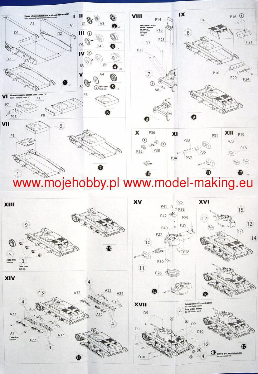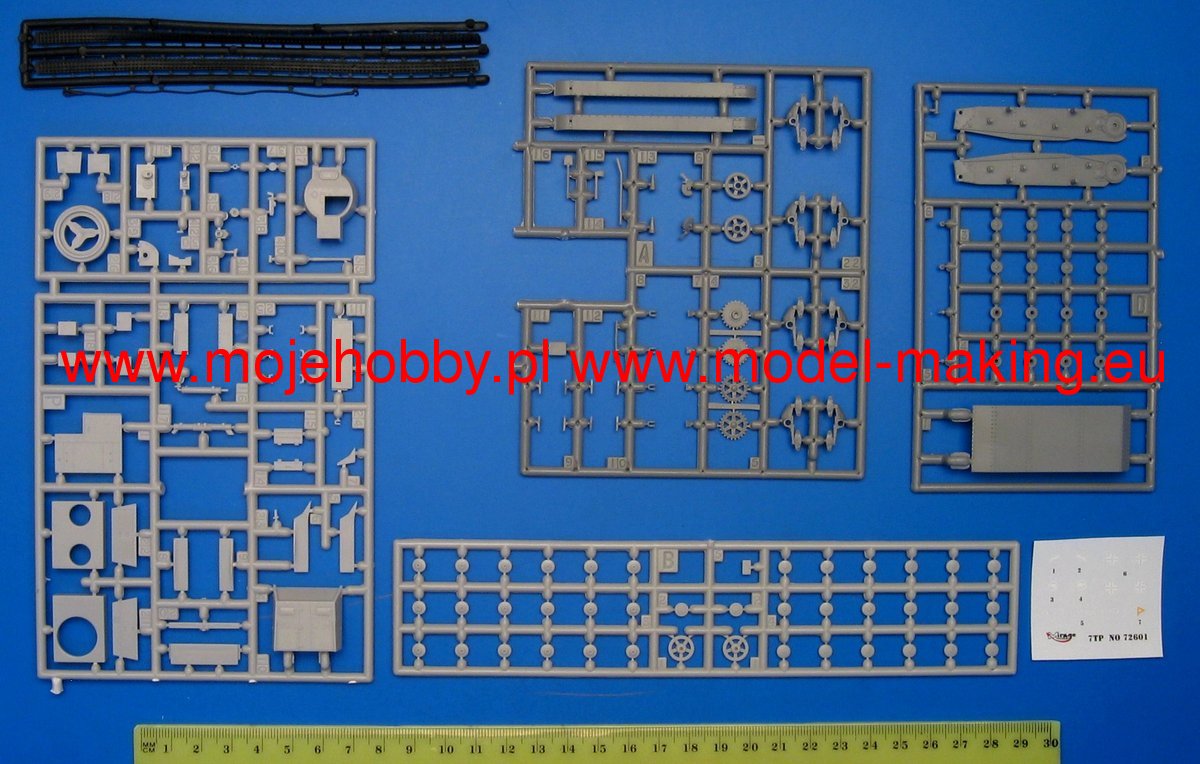 Polish light tank from the beginning of World War II. The 7TP tank, along with the tankettes (e.g. TKS), was the basic element of the Polish armored forces in 1939. 7 TP was designed at Państwowe Zakłady Inżynierii in Ursus, where it was also produced since 1935. The tank is a development of the British Vickers E, the license of which was acquired by Poland in the early 1930s. The first 24 examples of the 7TP were twin-turret vehicles, the next serial ones (built from 1937) already had one turret, and the main armament was the anti-tank gun. 37mm by Bofors. The 7TP tank was a technically advanced design for its time. It was one of the first in the world to have a diesel engine, a reversible periscope, and in some copies also radio stations (RKBc 2N / C) with a range of up to 25 km. During the September campaign, around 130 tanks of this type of all variants were used. The 7TP proved itself on the battlefields of September 1939 as an opponent towering over the German Pz.Kpfw I and II, and at least equal to the Pz.Kpfw III and IV. Technical data: weight 9.4-9.9t, engine power: 110HP, speed: 37km / h, armament (single turret version): 1 Bofors 37mm cannon, 1 machine gun wz. 30 cal. 7.92mm.Download Mirage Hobby PDF catalogue
