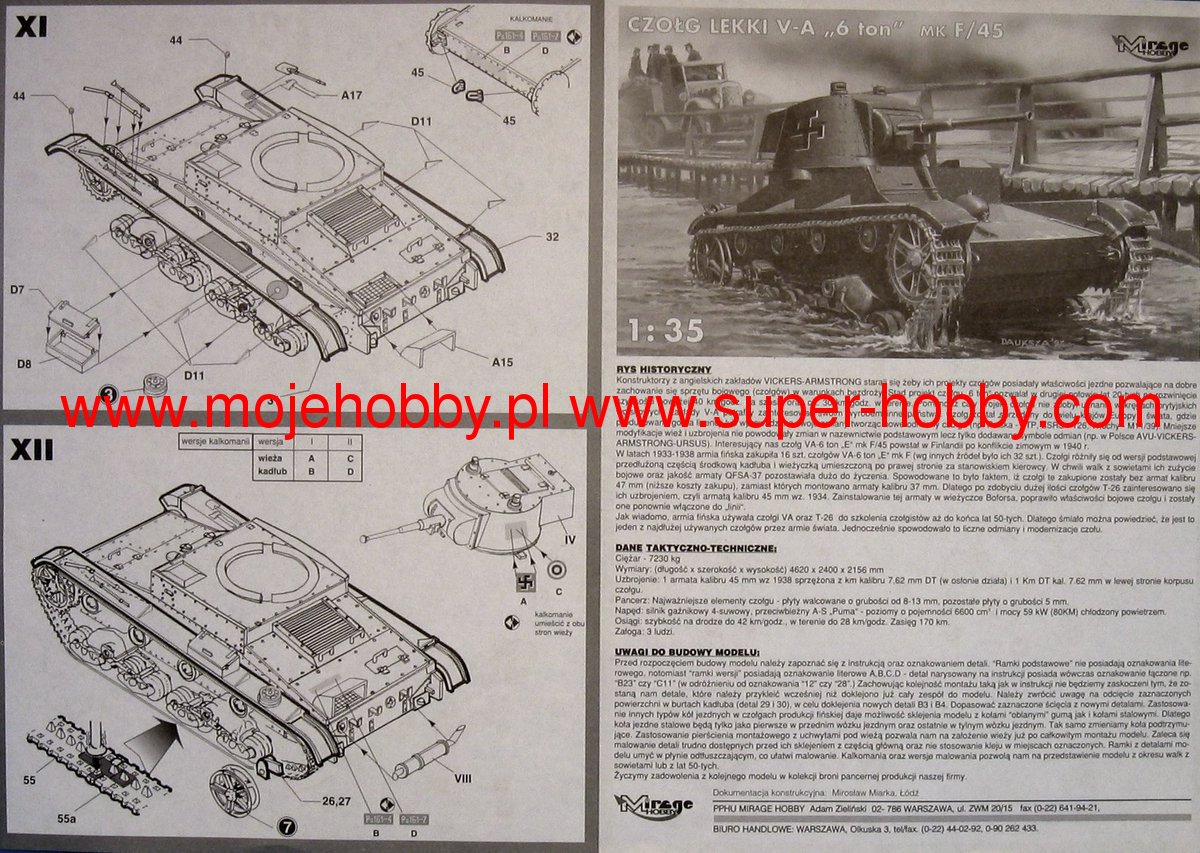 Download Mirage Hobby PDF catalogueThe Vickers E tank (Mark E or Vickers 6-ton) became an export hit to countries where the armaments industry did not produce its tanks. The prototype was built in 1928. It was originally offered to the British Army but rejected it. The tank was built in a twin-turret version as type A and in a single-turret version as type B. For the export version, the turret with the 47 mm gun was moved to the left side (which relieved the driver) and the middle part of the hull was shortened. Countries that purchased the Vickers E could also purchase a license for the tank components that were manufactured at Vickers-Armstrong. Poland managed to obtain such licenses without a special surcharge. The tank was used in the armies of Afghanistan, Bolivia, Estonia, Finland, the USSR, and even Greece, Siam or Japan. On the basis of this design, the Polish 7TP tank and the Soviet T-26 were created. Technical data (version B): length (with a barrel): 4.88m, width: 2.41m, height: 2.16m, engine power: 80-98KM, range: 160km, maximum speed (on the road): 35 km / h, armament: 1 Vickers-Amstrong Mk. E cal. 47 mm, 1 Vickers machine gun cal. 7.7 mm.