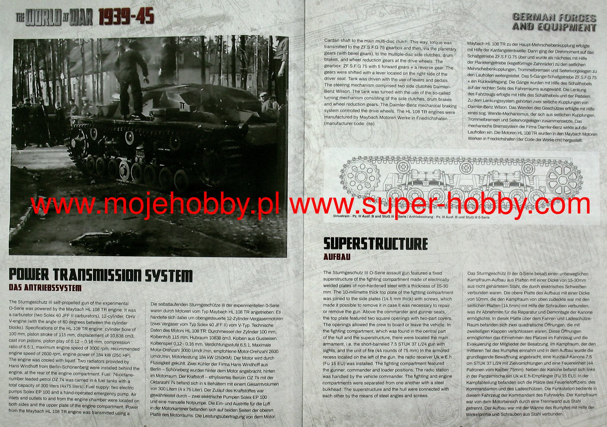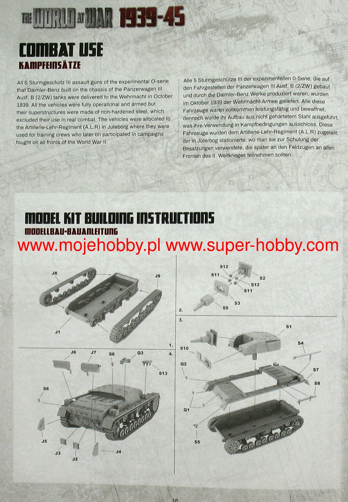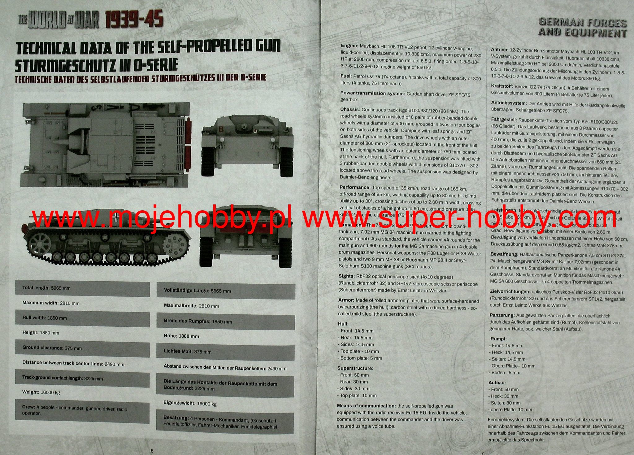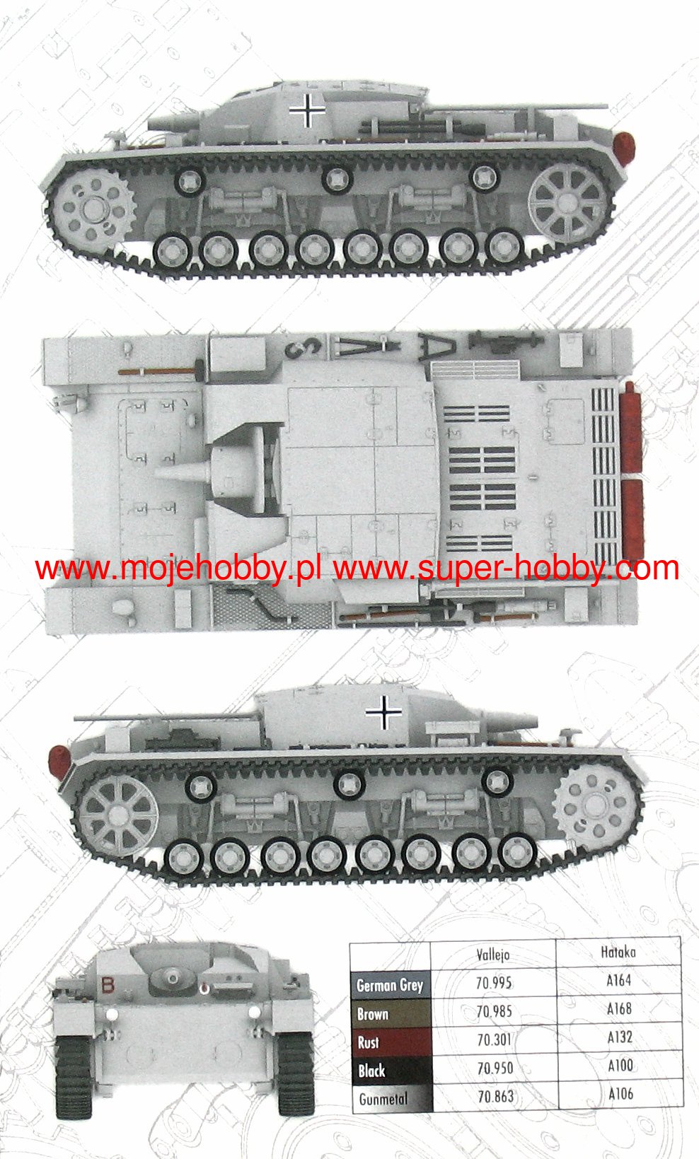 The StuG III (Sturmgeschutz III) was a German armored gun from the Second World War. The first prototypes of the vehicle were built in 1937, and serial production continued in the period 1940-1945, ending with the production of about 10,300 vehicles. The StuG III in the E version was powered by a single Maybach HL 120 TRM engine with 300 hp. It was armed (version E) with a 75mm short-barreled cannon. and 1 MG34 machine gun cal. 7.92 mm. The StuG III was created as a result of an initiative undertaken by Erich von Manstein, who in a letter to General Beck in 1935 signaled the need to create assault artillery for the advancing infantry within the mechanized units of the Wehrmacht. Ultimately, the order to design a new vehicle was commissioned to Daimler-Benz, which in turn used the chassis of the PzKpfw III Ausf. B. Several versions of the StuG III gun were produced during series production. Chronologically, the first was the A version, armed with the 75mm Stuk 37 L / 24 gun and based on the chassis of the PzKpfw III Ausf tanks. F and G and produced from the beginning of 1940. Soon after, version B was created - the first one to be produced on a large scale, which differed only slightly from the version A. In 1941, version D, which had better armor and sights, entered the production. The E version was quickly created, which was the first to receive additional armament in the form of the MG34 machine gun. At the beginning of 1942, the StuG III underwent a major modification to become actually a tank destroyer by installing a long-barreled 75mm StuK 40 L / 48 gun. The designation of the car was also changed to StuG 40. In the period 1940-1945, the StuG III served on almost all fronts on which the German army fought. It turned out to be a very useful weapon, cheap to produce and, most importantly, effective. It is estimated that different versions of the StuG were responsible for the destruction of approximately 20,000 Soviet tanks and armored vehicles in 1941-1945.