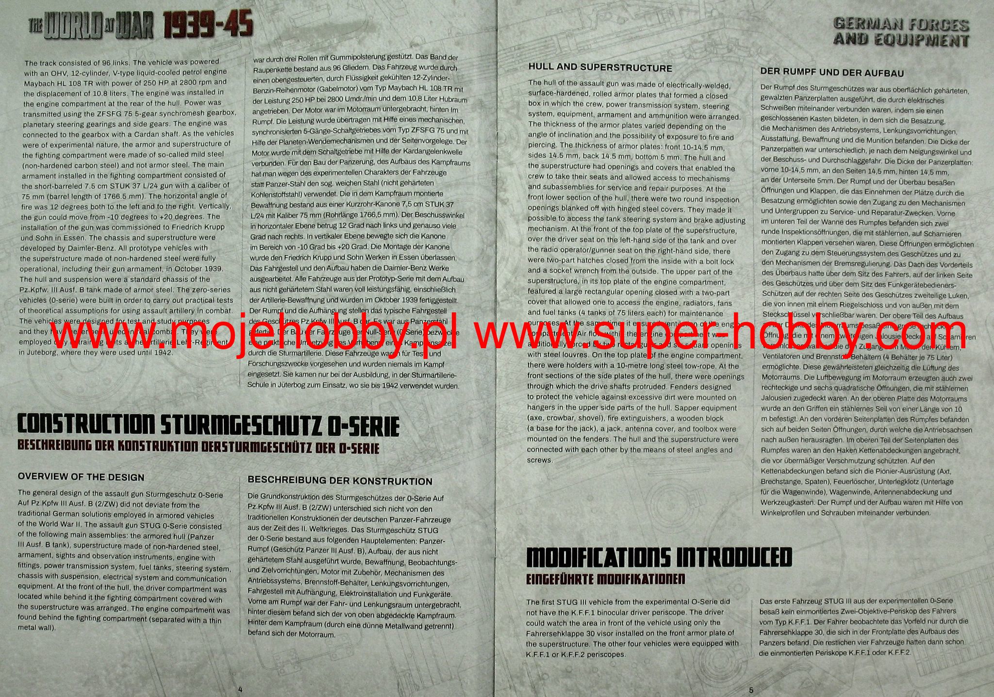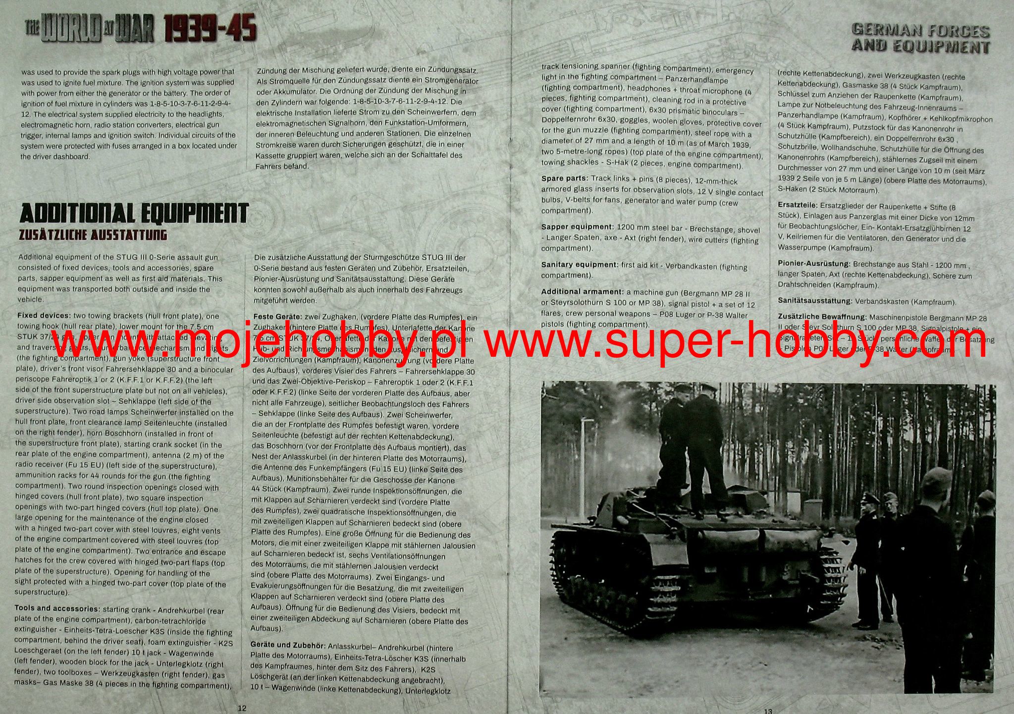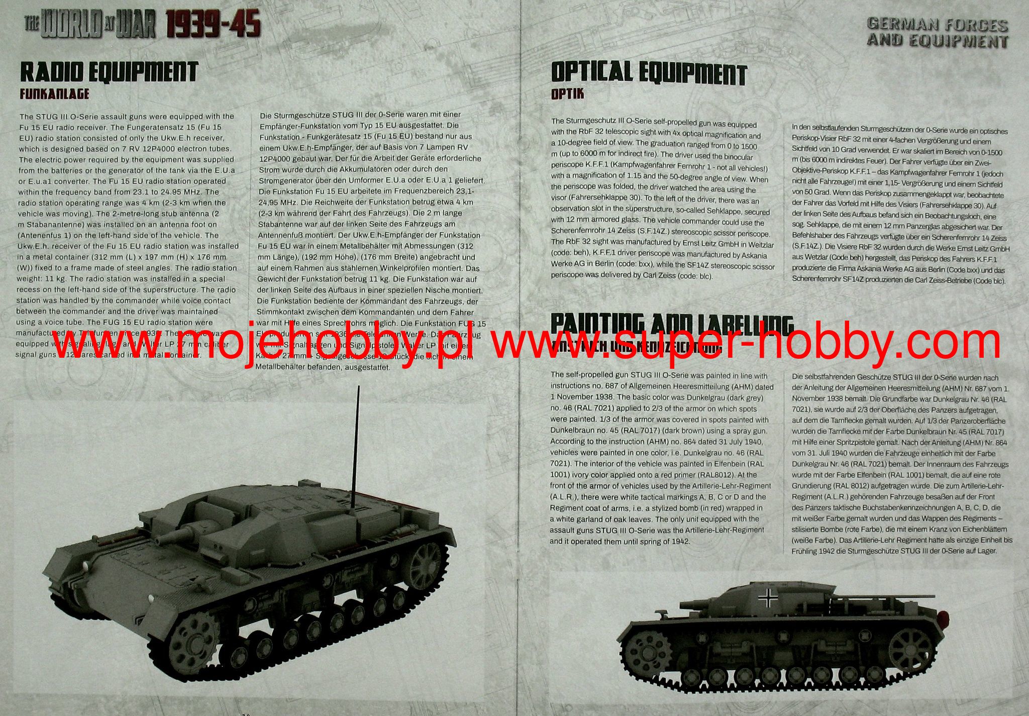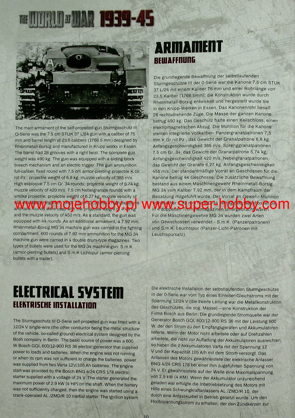 The StuG III (Sturmgeschutz III) was a German armored gun from the Second World War. The first prototypes of the vehicle were built in 1937, and serial production continued in the period 1940-1945, ending with the production of about 10,300 vehicles. The StuG III in the E version was powered by a single Maybach HL 120 TRM engine with 300 hp. It was armed (version E) with a 75mm short-barreled cannon. and 1 MG34 machine gun cal. 7.92 mm. The StuG III was created as a result of an initiative undertaken by Erich von Manstein, who in a letter to General Beck in 1935 signaled the need to create assault artillery for the advancing infantry within the mechanized units of the Wehrmacht. Ultimately, the order to design a new vehicle was commissioned to Daimler-Benz, which in turn used the chassis of the PzKpfw III Ausf. B. Several versions of the StuG III gun were produced during series production. Chronologically, the first was the A version, armed with the 75mm Stuk 37 L / 24 gun and based on the chassis of the PzKpfw III Ausf tanks. F and G and produced from the beginning of 1940. Soon after, version B was created - the first one to be produced on a large scale, which differed only slightly from the version A. In 1941, version D, which had better armor and sights, entered the production. The E version was quickly created, which was the first to receive additional armament in the form of the MG34 machine gun. At the beginning of 1942, the StuG III underwent a major modification to become actually a tank destroyer by installing a long-barreled 75mm StuK 40 L / 48 gun. The designation of the car was also changed to StuG 40. In the period 1940-1945, the StuG III served on almost all fronts on which the German army fought. It turned out to be a very useful weapon, cheap to produce and, most importantly, effective. It is estimated that different versions of the StuG were responsible for the destruction of approximately 20,000 Soviet tanks and armored vehicles in 1941-1945.