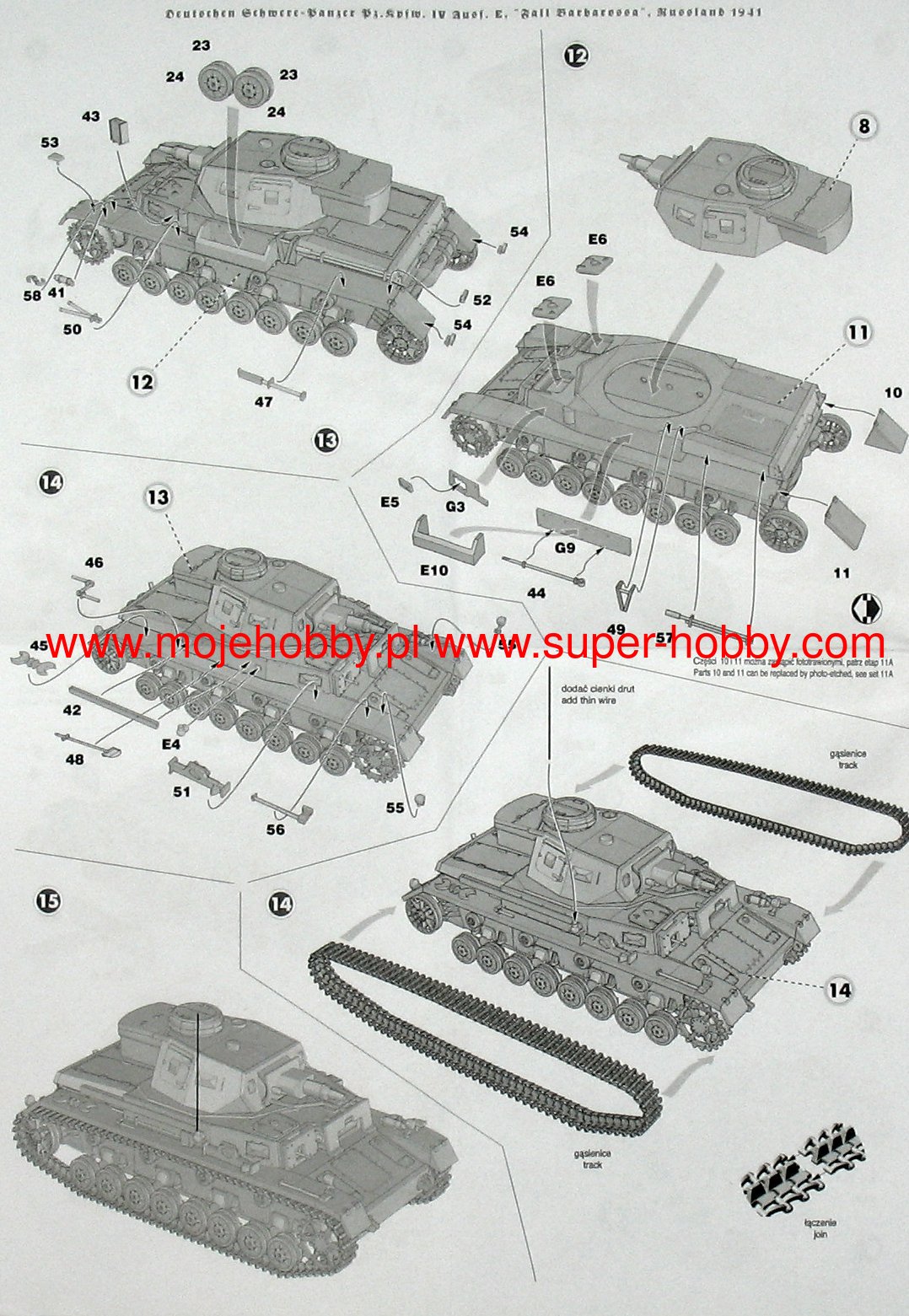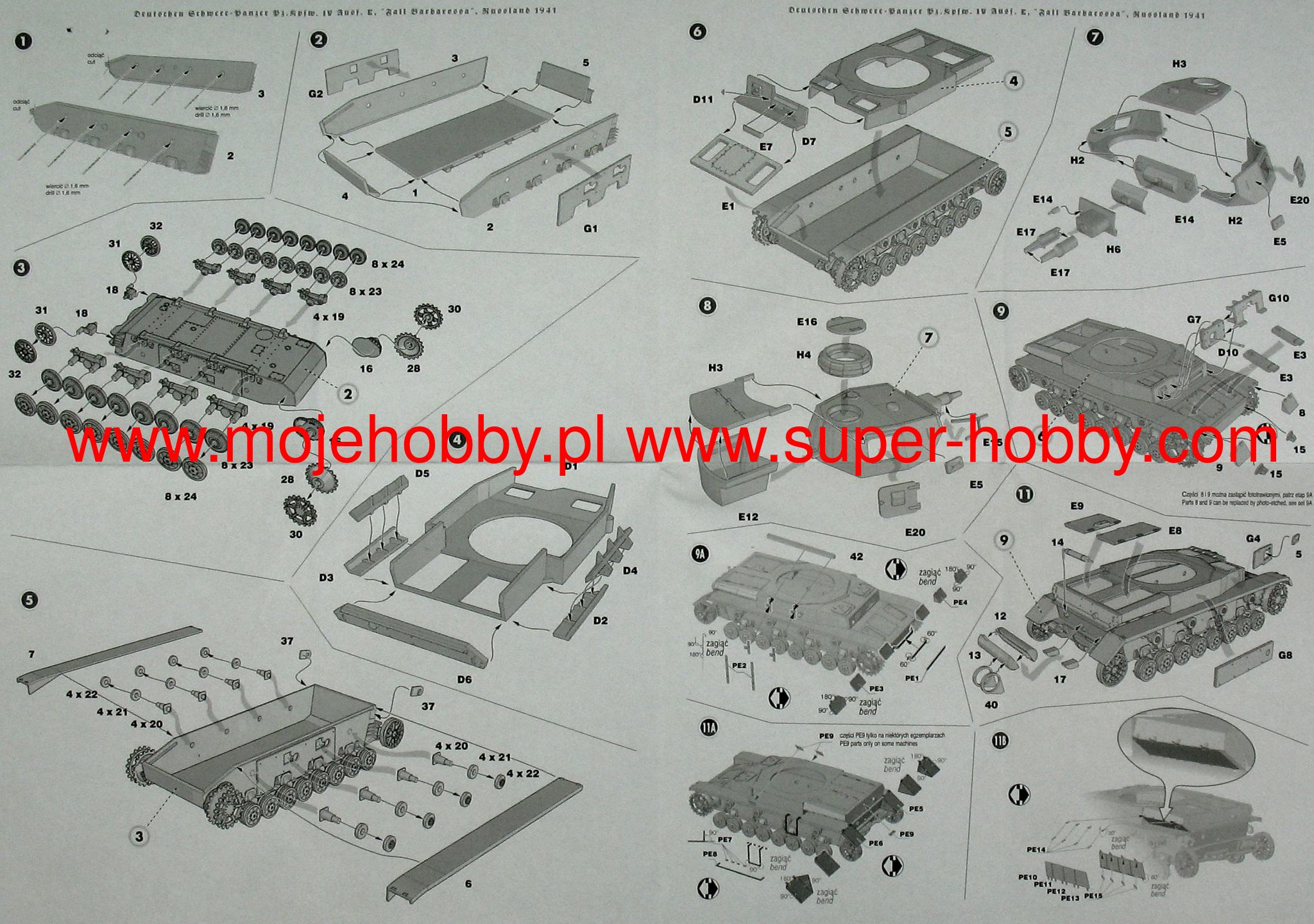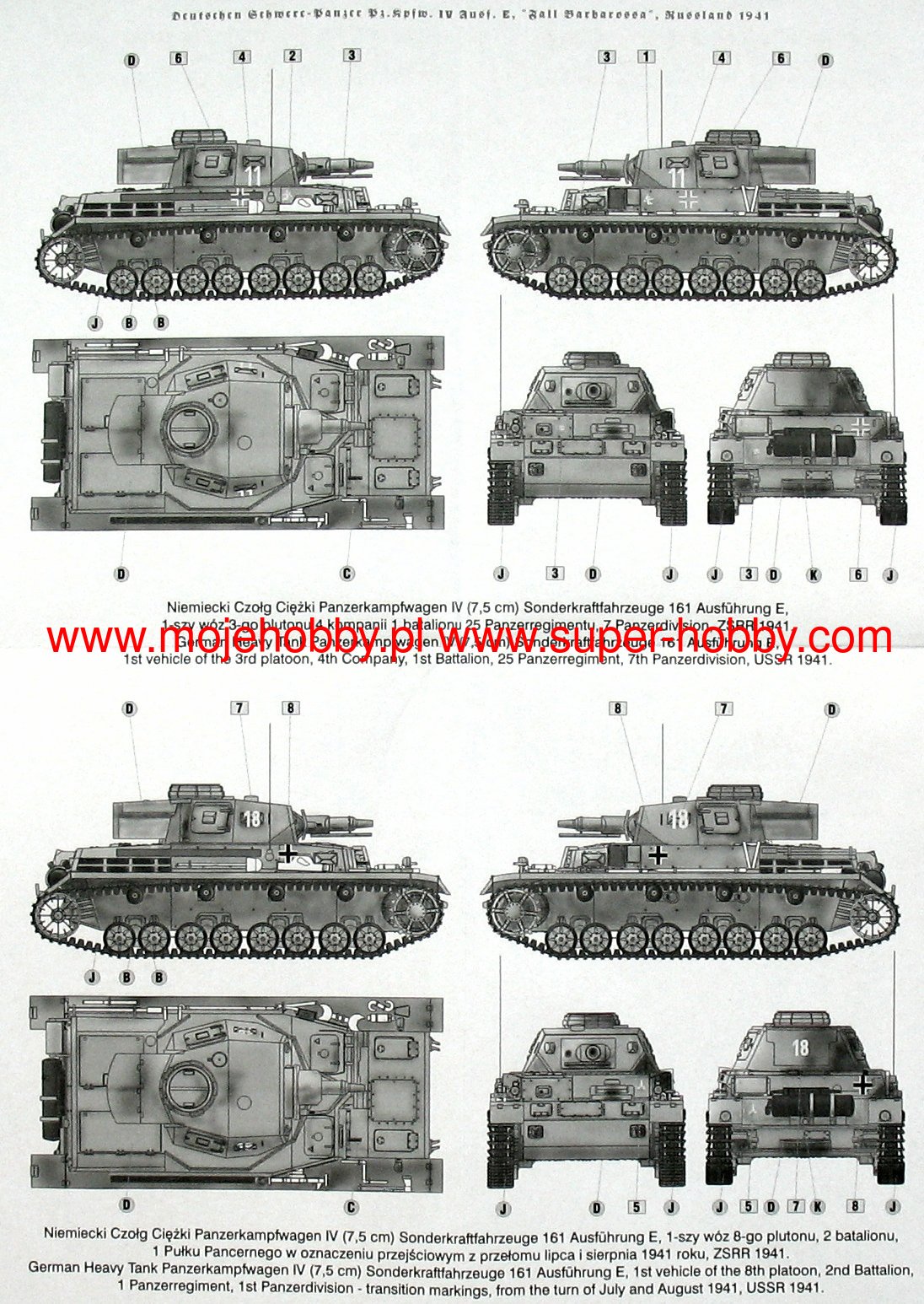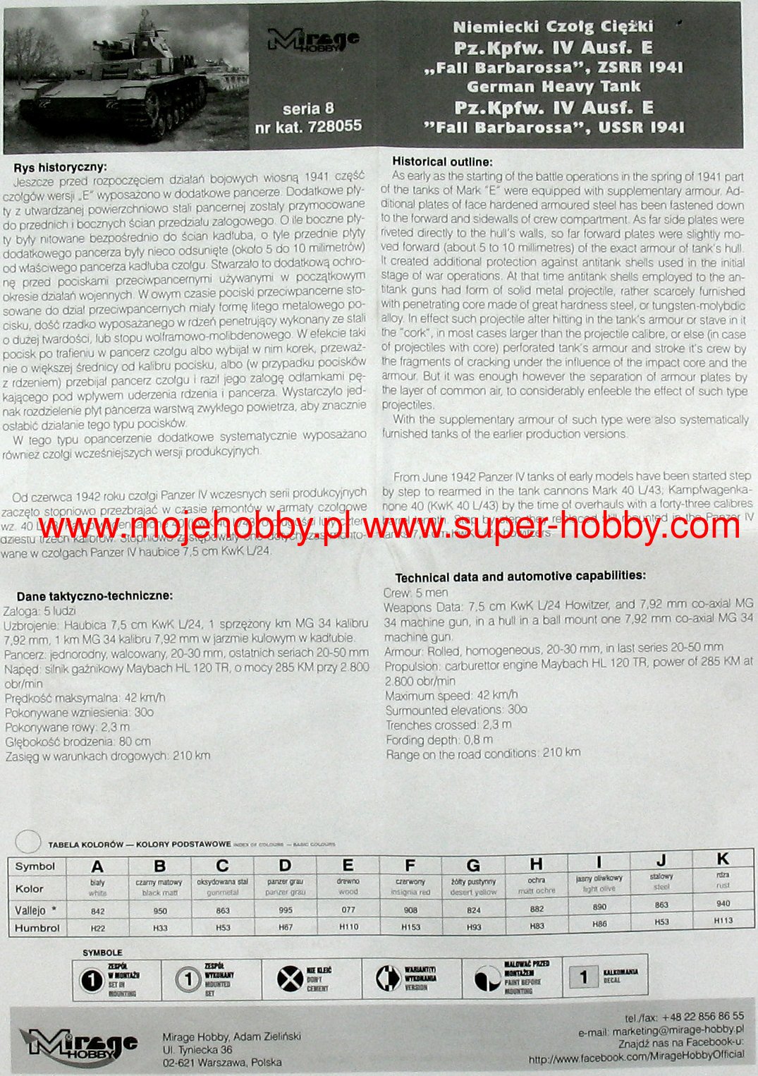 Download Mirage Hobby PDF cataloguePzKpfw IV (Panzerkampfwagen IV) was a German medium tank from the Second World War. The first prototypes of the vehicle were created in 1936, and serial production continued in the period 1938-1945, ending with the production of about 8,600 vehicles. The D version of the tank was powered by a single Maybach HL 120 TRM engine with a capacity of 300 HP. It was armed with 1 75mm KwK 37 L / 24 gun and 2 7.92mm MG 34 machine guns. The PzKpfw IV was created as a result of a competition announced at the end of 1934 by the German Armaments Department for a medium tank weighing up to 18 tons and armed with a 75 mm gun. The competition was won by the Krupp company, whose vehicle was put into mass production - as it turned out, it was a vehicle that can be safely called the "workhorse" of German armored forces during World War II and one of the most intensively developed and modernized Wehrmacht tanks. Numerous variants of the PzKpfw IV were created in the course of production. Chronologically, the first was the A version, armed with a 75mm short-barreled gun and a 230hp engine. However, versions B and C appeared quickly, in which several significant changes were made: first of all, more powerful engines (265 HP in version B and Maybach HL 120 TRM with 300 HP in C version - which were installed in PzKpfw IV until 1945 year), and the armor of the entire car was improved. The F1 and F2 versions turned out to be a real revolution, in which the frontal armor was increased to 60 mm, and the main armament was changed to the great, long-barreled 75mm KwK 40 L / 43 cannon, which in 1942 and 1943 allowed them to fight any Allied or soviet. The most frequently produced versions of the PzKpfw IV were the G, H and J versions, which were very similar to the F1 and F2 versions. The main armament has not changed significantly (it was still the KwK 40 cannon), as well as the engine and chassis. On the other hand, the armor was slightly strengthened, and from the beginning of 1943 armored screens (Schurzen) were installed on them. Numerous other vehicles were built on the chassis of the PzKpfw IV, such as the StuG IV assault gun, the Nashorn tank destroyer or the Wirbelwind self-propelled anti-aircraft gun. PzKpfw IV tanks were used on almost all fronts of World War II - from the September campaign in 1939, through the campaign in France in 1940, the Barbarossa and Typhoon operations in 1941, the Battle of Kursk in 1943, to the last operations of the German army against The USSR and the Western Allies in 1944-1945.Operation Barbarossa (Ger. Unternehmen Barbarossa) is a German attack on the Soviet Union that began on June 22, 1941. This operation started the German-Soviet war and also began military operations on the Eastern Front in World War II. The original plan of the attack was ready in December 1940 and assumed the attack in May 1941, but due to the need to take action in the Balkans, its date was postponed. On the Axis side, a total of over 4.5 million soldiers, about 3,600 tanks and about 2,900 aircraft were engaged for this operation. These forces were divided into three large groups, Army Groups: North, Middle and South. The first of them was aimed at conquering Leningrad, the second was to hit Moscow, and the third - to capture the entire territory of Ukraine and reach the Dnieper River. Their actions were to lead to the defeat of the Soviet Union within a few weeks! At the time of the start of the German attack, the Red Army had about 2.5-3 million people in the western part of the USSR, who had much more tanks and planes than their opponents. Operation Barbarossa is quite widely recognized as the largest German offensive operation of World War II. As a result, the Wehrmacht achieved enormous successes on a tactical and operational scale, destroying, by November-December 1941, probably about 150% of the Red Army's manpower in June of the same year! However, despite this, the USSR was not eliminated from the fight, and the operation - strategically - turned out to be a great failure for Germany.