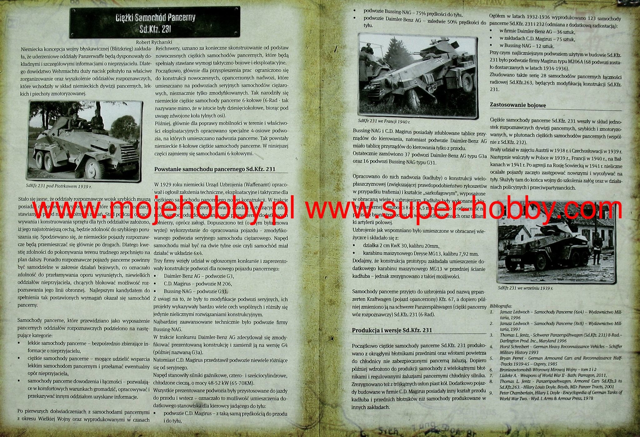 Sd.Kfz 231/232/233 (8-Rad) were German heavy armored cars of the Second World War. The first prototypes of the vehicle were created in 1935, and serial production continued in the period 1936-1942, ending with the production of about 600 cars. The Sd.Kfz 231/232/233 series was powered by a Bussing-NAG V8 engine with 150 HP, and later with a Bussing-NAG L8V-GS engine with a capacity of 180 HP. The armament of the Sd.Kfz 231 20mm KwK 30 cannon and a single 7.92mm MG34 machine gun. The Sd.Kfz 231/232/233 (8-Rad) series of vehicles was created to replace the non-mobile Sd.Kfz 231 (6-Rad) vehicles produced in 1929-1935. They have four-axle and eight-wheeled undercarriages and armor plates at a large angle. As a result, a series of cars was created with very good off-road characteristics, high mobility, low failure rate of the entire structure and good resistance to small arms. The entire series consisted of several cars. Sd.Kfz 231 (8-Rad) was a reconnaissance vehicle with a crew of four. Shortly thereafter, it was modernized - Sd.Kfz 232, which was a radio communication vehicle armed only with a single MG34 machine gun. In the course of the war, it was decided to create the Sd.Kfz 233 vehicle, which instead of the KwK 30 cannon, had a 75 mm KwK L / 24 short-barreled cannon. This vehicle served primarily as a fire support. The Sd.Kfz 231/232/233 vehicles served on almost all fronts of World War II, taking a particularly intensive part (Sd.Kfz 231 and 232) in military operations in the period 1939-1943.