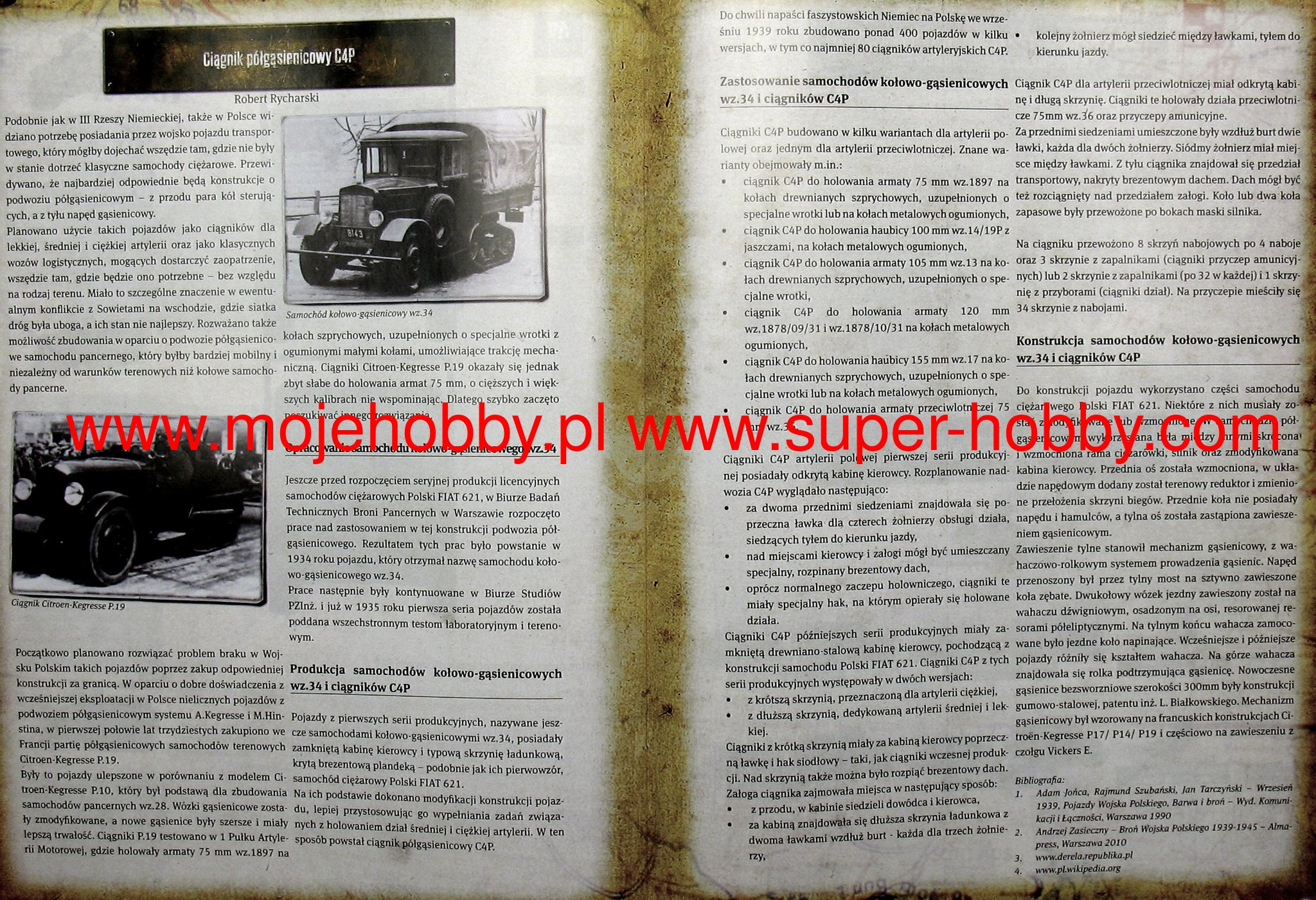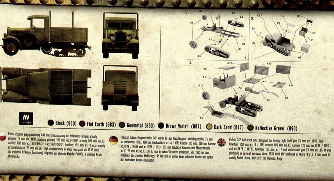 C4P is a Polish half-track artillery tractor from the interwar period and World War II. The first prototypes of the vehicle were made in 1934, and serial production continued in the period 1935-1939, ending with the production of about 400 examples. The C4P was powered by an engine FIAT-122B with 46 HP. The vehicle did not have any permanent weapons. Along with the slow motorization and mechanization of the Polish Army at the turn of the 1920s and 1930s, it was decided to increase the mobility of Polish artillery and to use newly developed half-track vehicles in some of its units. In the development of the new vehicle, many components of the Fiat 621 truck produced in Poland were used, and in the track machine, elements from the Vickers E tank and French designs by Citroen and Kegresse were used. Finally, a successful design with good mobility and maneuverability was created, but it is characterized by a lot of fuel chewing and a weak engine. Specialized versions were created on the C4P chassis: a truck, a workshop car and an ambulance. C4P vehicles were used in the September campaign in 1939, but probably none of them survived World War II.