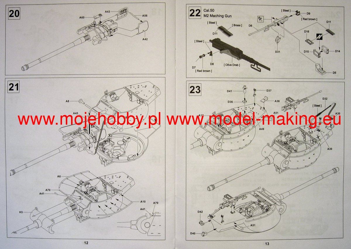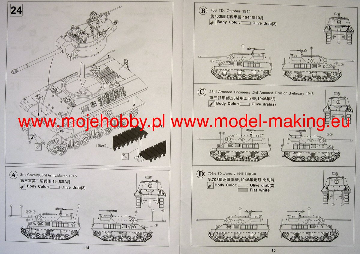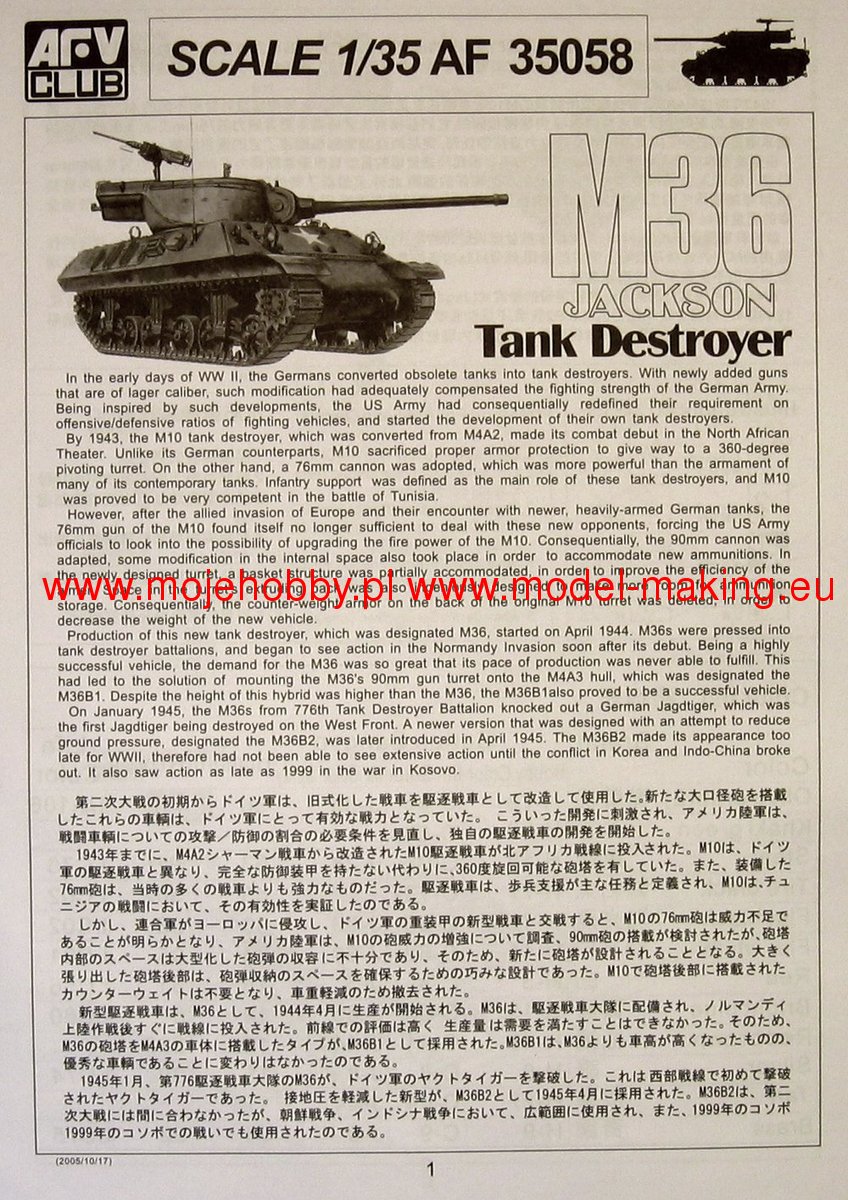 The M36 Jackson or Slugger is an American tank destroyer from the Second World War. The M36 entered combat in the second half of 1944. Despite such a late deadline, he managed to be famous for destroying a large number of enemy vehicles, especially during the German offensive in the Ardennes. Most of the design was based on the proven M10, but a typical turret was introduced that worked in conjunction with the best 90mm M3 anti-tank gun from the American arsenal of the time. Together with the newly introduced new HVAP missiles, it was able to penetrate all German armor without exception. In fact, the M36 Jackson was the only American armored vehicle capable of dealing with the German Tigers and Panthers on its own. The effect of effectiveness was high demand and production, which reached 1,400 units in less than a year. After World War II, M36 continued to be used in fighting in Korea, India's war with Pakistan, and even the Balkan conflicts. In addition to the basic version, two others were produced: M36B1 (turret mounted on the Sherman M4A3 body) and M36B2 (M10 with M36 turret and diesel engine). Technical data: length (with a barrel): 7.46m, width: 3.05m, height: 3.28m, weight 29t, engine power: 450KM, speed: 42km / h, armament: 1 90mm M3 cannon, 1 12.7mm Browning HB M2 machine gun.