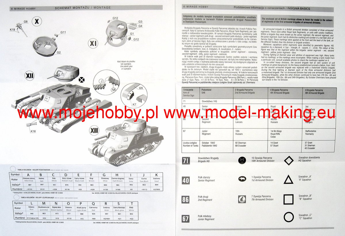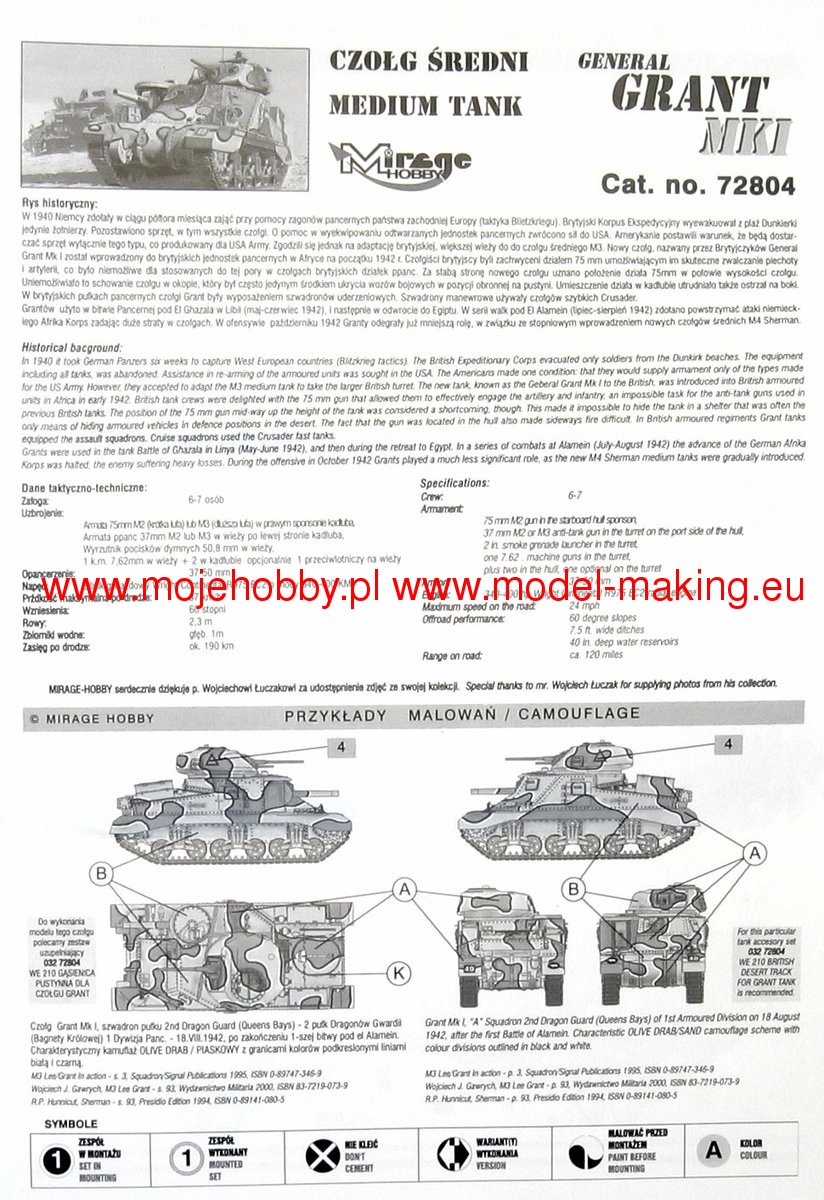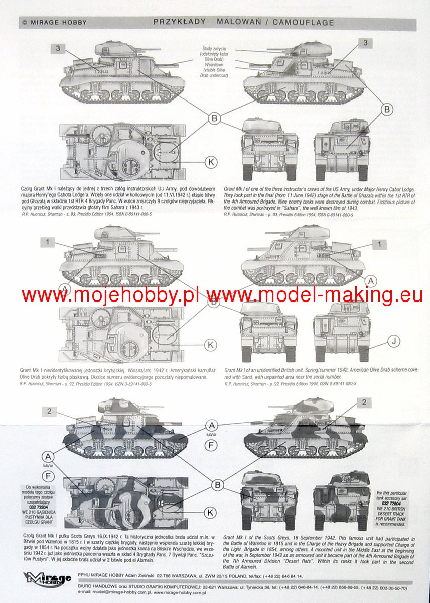 Download Mirage Hobby PDF catalogueThe M3 Lee or Grant was an American heavyweight medium of the Second World War. The first prototypes were built in 1941, and serial production was carried out in the period 1941-1942. In total, about 6,300 copies of this tank of all versions were built. The M3 Lee was powered by a single engine Continental R 975 EC2 340 HP or two engines General Motors 6-71 with a total power of 375 HP. It was armed with a single 75mm M2 or M3 gun in the hull, a single M5 or M6 37 gun mounted in the turret, and two or three 7.62mm Browning1919A machine guns. The French campaign of 1940 made a great impression on the command of the US Army and made them realize that the M2 tank being put into production at that time did not meet the requirements of the battlefield. While waiting for the target structure, which turned out to be the M 4 Sherman, the project was commissioned to develop a transitional structure that would enable fairly equal combat with the Pz.Kpfw III and Pz.Kpfw IV vehicles. Yes, in 1941, the first prototype of the M3 Lee tank - called the Grant by the British - was created. The new tank had several advantages (nice armor when introduced to the line, high reliability and strong armament), but it had many disadvantages: low ability to negotiate obstacles, a very high silhouette that made camouflage difficult - especially in desert conditions - and low susceptibility to modernization. As a result of this, from 1943 it was systematically withdrawn from the linear units in favor of the M4 Sherman. However, it was used after 1943 by the Red Army in secondary combat directions and during the fighting in the Pacific by the Americans. Several versions of the car were created in the course of serial production M3 Lee. Chronologically, the first one was marked as M3 and still had riveted armor. A cast-armor version of the M3A1 followed shortly after, followed by the M3A2 with a welded armor. The last version was the M3A5 with riveted armor, but an elongated 37mm barrel.The Battle of El Alamein, or actually the Second Battle of El Alamein, stayed carried out in the period from October 23 to November 4, 1943. The battle was fought between the German-Italian troops and the British units, supported, however, to a significant extent by Australian, New Zealand and South African troops. It is assumed that about 116 thousand people fought on the side of the Axis countries. people supported by approx. 550 tanks and approx. 800-900 aircraft. On the British side, around 195,000 people fought. people, supported by approx. 1,100 tanks and approx. 750 aircraft. The Second Battle of El Alamein was a kind of continuation of the battle, known as the 1st Battle of El Alamein in July 1942. As a result of this second battle, the Axis offensive towards the Suez Canal was slowed down and finally stopped. On the other hand, the struggle of October-November 1942 was a British offensive to the west, intended to completely push the enemy out of Egypt. It can be assumed that the commander of this battle on the British side - field marshal Bernard Law Montgomery - won mainly thanks to the material advantage and much better logistics. Undoubtedly, however, the British commander, aware of his advantages, decisively used them and led to a decisive victory for his troops, winning the greatest victory in his career. Axis troops lost at least 30,000. people (killed, wounded and captured) and about 500 tanks. The British lost approx. 13-14 thousand. people and about 330 tanks.