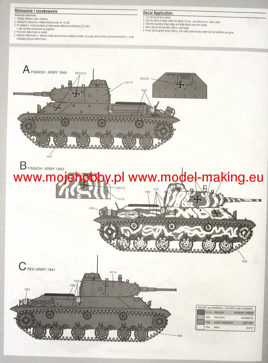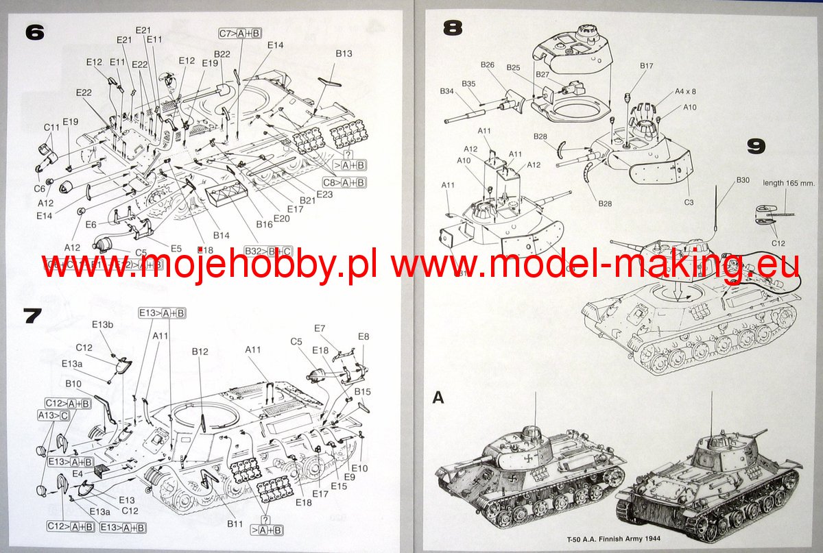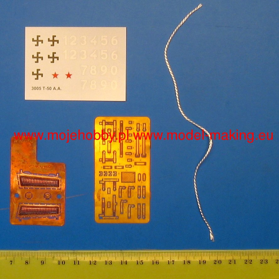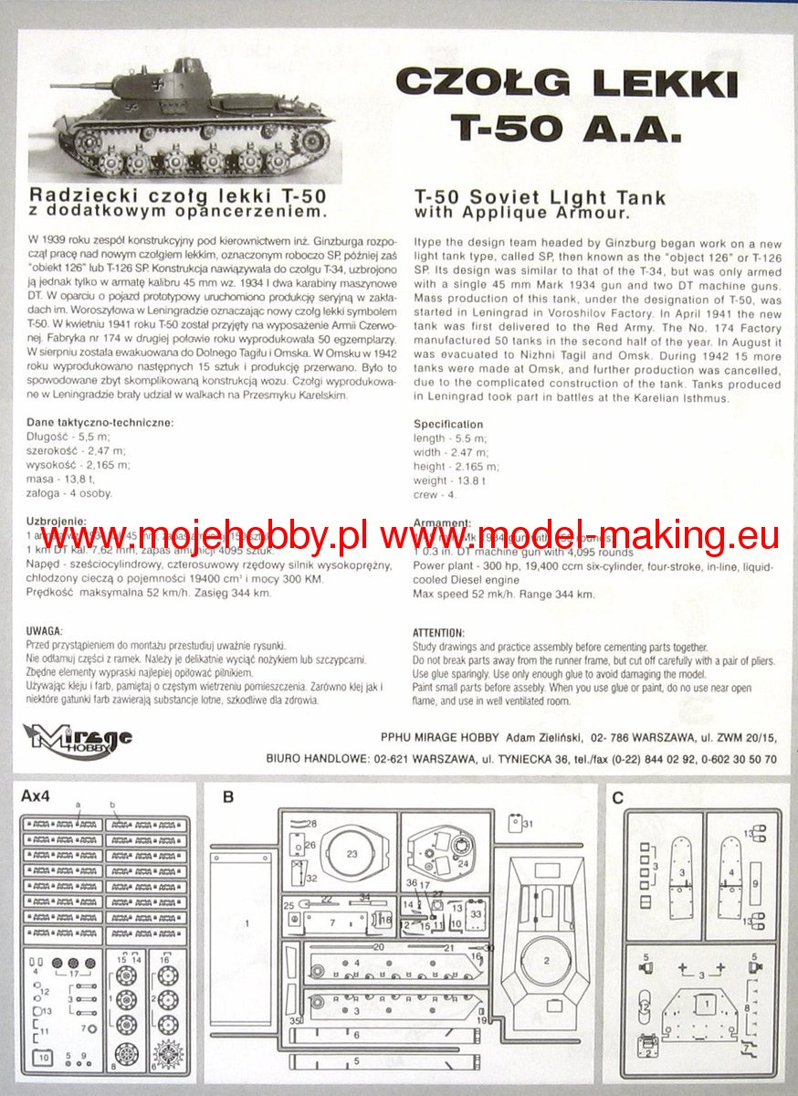 Download Mirage Hobby PDF catalogueThe first prototypes of the T-50 light tank were made in 1941. In the same year, mass production started, which, however, ended in 1942 with the production of only about 60-70 copies. The T-50 tank was powered by a 300hp W-4 engine. Its main armament was a 45 mm tank gun (mounted in a rotating turret), and its auxiliary armament was two 7.62 mm DT machine guns. The T-50 tank was created as a successor to another light tank of the Red Army - the T-26. Work on it began as a result of the disastrous experiences that the Soviets gained in the Winter War with Finland in 1939-1940. The designers of the new car used many solutions and ideas from the T-34 medium tank, e.g. sloped frontal armor. Due to the small mass production, the T-50 tank was used to a marginal extent during the war with the Third Reich. He fought mainly in the Leningrad region, where the Soviet troops also lost all vehicles of this type. Single copies were used by Germany and Finland.