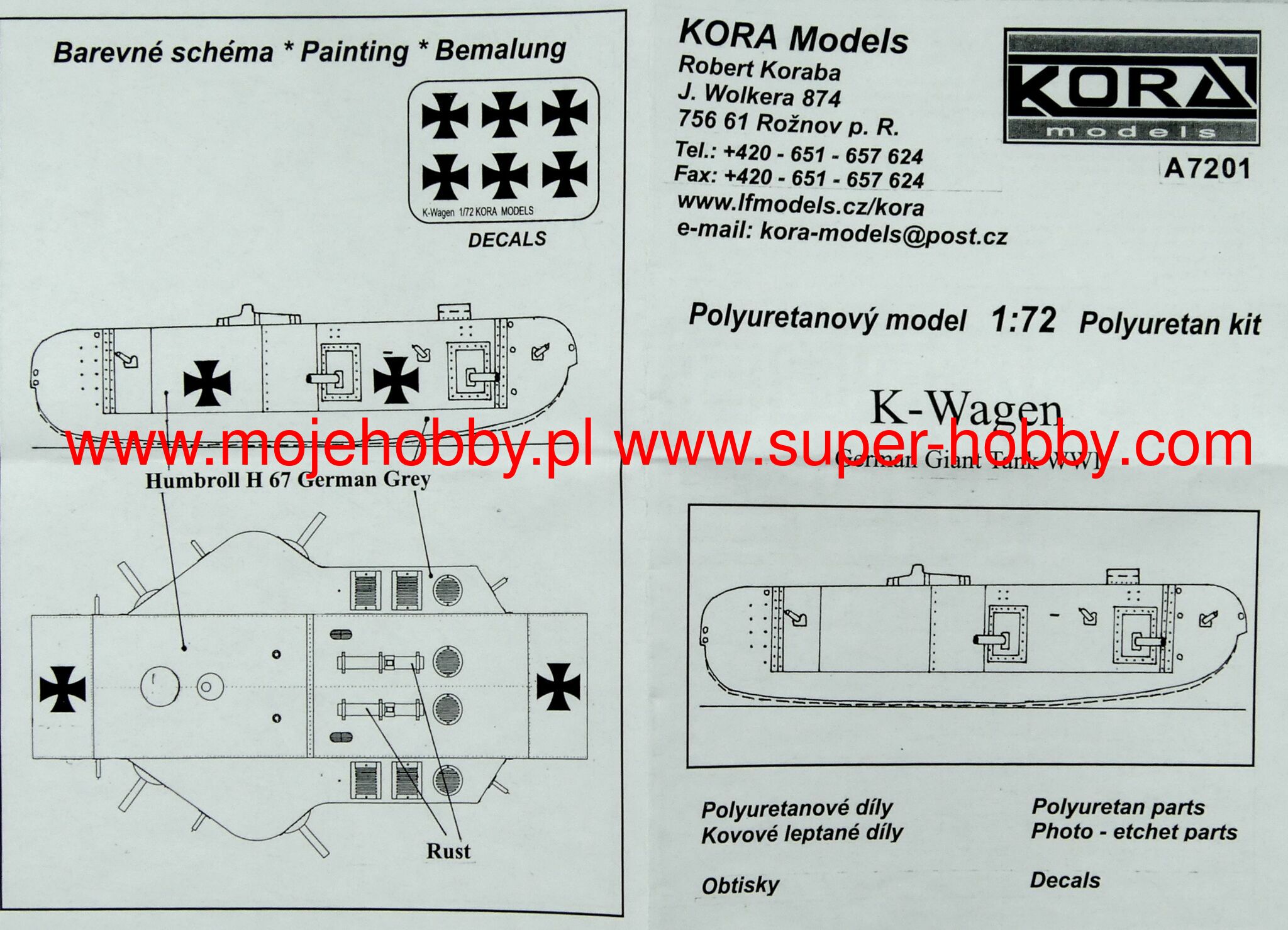 K-Wagen немецкий тяжёлый танк (иногда классифицируемый как сверхтяжёлый танк) времён Первой мировой войны. Первые прототипы машины были построены в 1917 г., а к сентябрю 1918 г. было частично достроено 2 или 3 экземпляра этой машины. Танк был оснащен двумя двигателями Daimler V6 мощностью 650 л.с. Вооружение состояло из 4 77-мм орудий и 7 7,92-мм пулеметов MG08. танк K-Wagen создавался в связи с желанием немецкой армии иметь тяжелый танк, гораздо более тяжелый и лучше вооруженный, чем A7V. Наконец танк достиг веса 120 тонн (изначально он должен был весить целых 165 тонн!), 13 метров в длину и 6 метров в ширину. По меркам Первой мировой войны машина получила очень хорошую броню толщиной до 30 мм. Машина была настолько тяжелой и такой большой, что ее приходилось транспортировать на поле боя по частям, что значительно снижало ее маневренность и боевые возможности. Танки K-Wagen никогда не использовались в боевых действиях.
