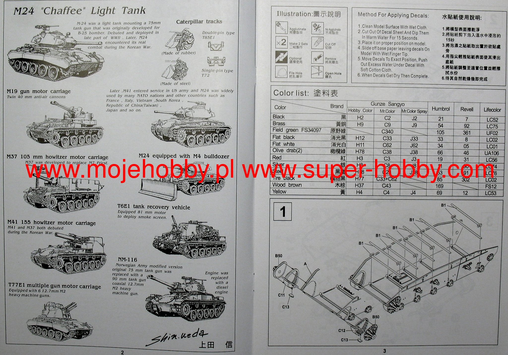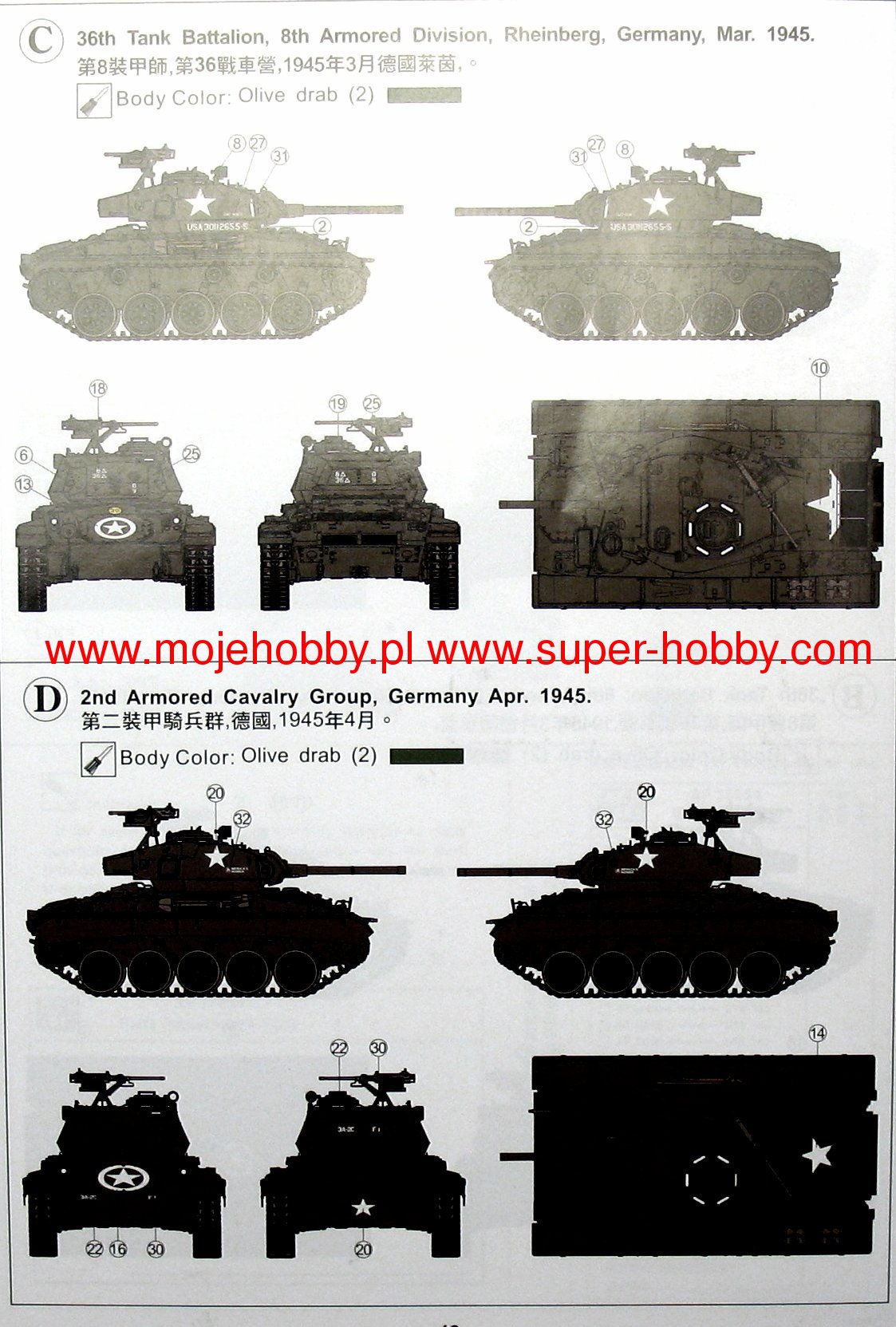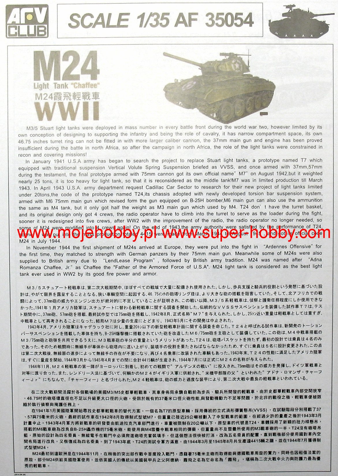 The M24 Chaffee was an American heavy light of the Second World War. The first prototypes were built in 1943, and serial production was carried out in the period 1944-1945. In total, about 4,700 copies of this tank of all versions were built. The M24 Chaffee was powered by a double engine Cadillac Twin 44T24 with a total power of 220 HP . It was armed with a single 75mm M6 cannon, two 7.62mm Browning 1919A4 machine guns and a single 12.7mm Browning M2HB machine gun. The M24 Chaffee was created as the successor to the M3 / M5 Stuart light tank series. In designing it, the emphasis was on stronger main armament (a 75mm gun instead of a 37mm gun), better shaped armor, greater off-road capability, and easier handling - especially in the engine compartment. During World War II, several specialized vehicles were built on the chassis of the M24 tank, including the M19 self-propelled anti-aircraft gun and the M41 Gorilla self-propelled howitzer. The first M24 Chaffee began to hit the line in mid-1944. They took part in the battles in Normandy, France and West Germany (1944-1945), but also in Italy in the period 1944-1945. After 1945, the M24 Chaffee was also exported to many countries, including Austria, Belgium, Chile, France, Greece and Pakistan. M24 took part in several conflicts after the end of World War II, including the Korean War (1950-1953), the war in Algeria (1954-1962) and Indochina (1945-1954).
