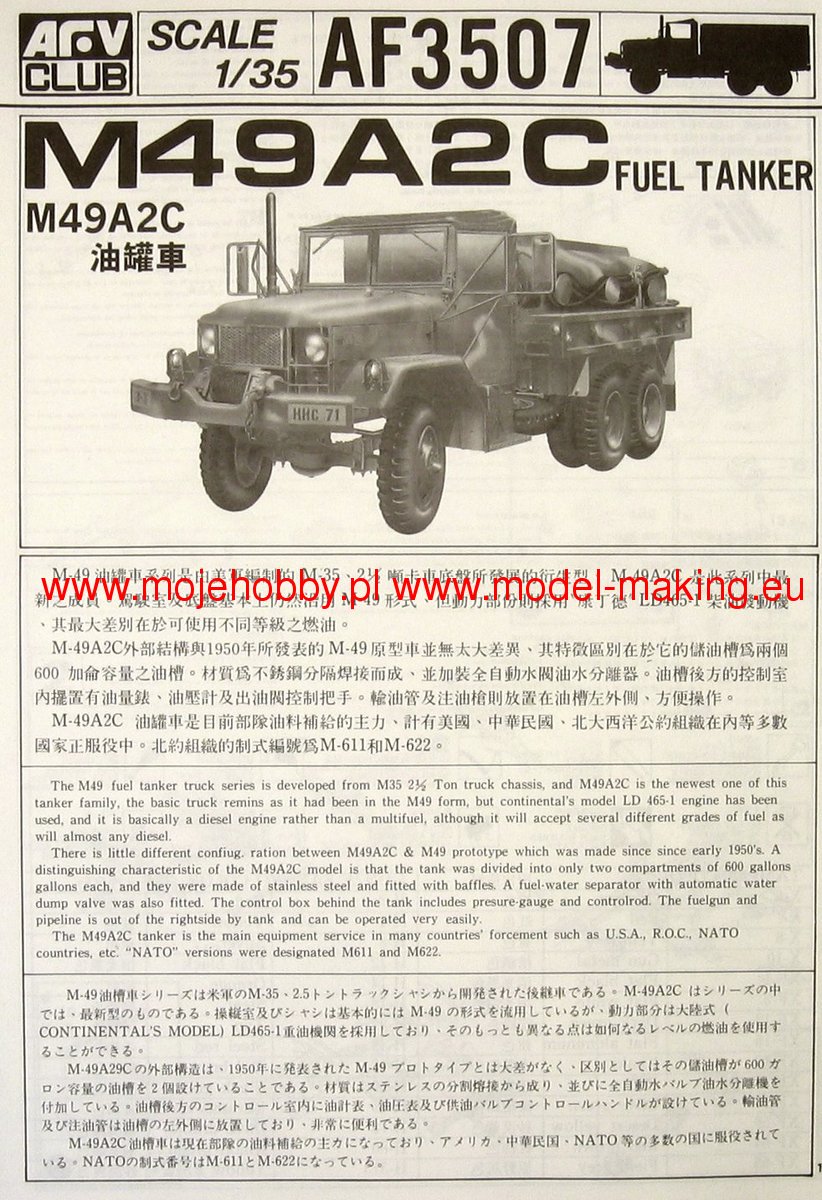 The M49 is an American wheeled tanker from the post-war period. The first vehicles of this type began to enter the line in the 1950s. The drive was provided, depending on the tank version, by a single Continental OA-331, LDS-427 or LDT-465 engine. The maximum speed of the vehicle did not exceed 90 km / h. The M49 tanker was created on the basis of the universal M35 military truck with a capacity of 2.5 tons. Both vehicles had the same chassis, suspension, and driver's cab, but were powered by different, but very similar engines. The M49 also necessarily had a significantly revised shipping section that housed a special tanker with a capacity of approximately 4,550 liters (1,200 gallons). The cistern was divided into 3 containers of different capacity. Several versions of the M49 vehicle appeared in the course of production, among them: the M49 (basic version), M49C1 (version powered by a different engine) or M49C2 (version with a different engine with a tanker divided only into two containers of approx. 2,250 liters). This type of tanker was used extensively by the US armed forces in the 1950s and 1960s. They were also exported to NATO and South Korea.