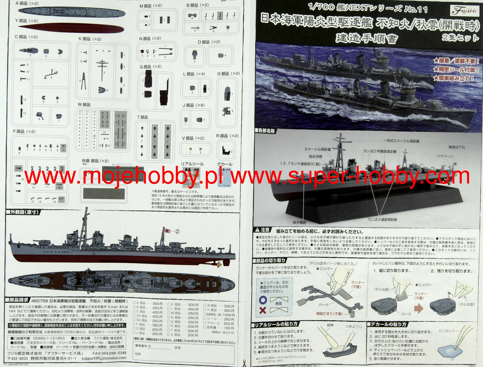 Akigumo was a Japanese destroyer whose keel was laid in 1940, launched in April 1941, and commissioned in the Imperial Japanese Navy in September 1941. The length of the ship at the time of launching was 118.5 m, width 10.8 m, and the actual full displacement - 2,490 tons. The maximum speed of destroyer Akigumo was up to 35 knots. The main armament at the time of the launch was 6 127 mm guns in three twin turrets, and the secondary armament was 4 25 mm cannons, depth charge launchers and eight 610 mm torpedo tubes with eight spare torpedoes. Akigumo was the nineteenth and last Kagero-class destroyer. Units of this type were created as part of the Japanese fleet expansion program of 1937 and 1939. They returned to the use of strong artillery (6 127 mm guns), which had already appeared on the Fubuki-class destroyers in the 1920s. The provisions of the disarmament treaties were also not respected, thanks to the czum the Japanese designers had complete freedom in designing. As a result, ships with strong artillery and torpedo armaments, good sea performance, and especially - unlike the previous Japanese destroyers - had no problems with stability and overall durability of the structure. The only drawback was the weak anti-aircraft armament, which, however, was systematically strengthened during the war in the Pacific. Destroyer Akigumo's combat career began in World War II with the cover of Japanese carriers attacking the Pearl Harbor base in December 1941. From the second half of 1942, Akigumo served in the area of the islands of the Solomon Islands archipelago, fighting in the struggle for Guadalcanal. He became famous there with the serious damage to the USS Hornet aircraft carrier on October 27, 1942. At the turn of 1943-1944, Akigumo was modernized: it received new radars and its anti-aircraft armament was significantly strengthened. After the modernization, the ship returned to service, but on April 11, 1944, she was sunk by the USS Redfin submarine.Shiranui (sometimes known as Shiranuhi) was a Japanese destroyer laid down in 1937, launched in June 1938, and commissioned in the Imperial Japanese Navy in December 1939. At the time of launching, the ship was 118.5 m long, 10.8 m wide, and her standard displacement was about 2,100 tons. Destroyer Shiranui's top speed was up to 35-36 knots. The main armament at the time of the launch was 6 127 mm guns in three twin turrets, and the secondary armament was 4 25 mm cannons, depth charge launchers and eight 610 mm torpedo tubes. Shiranui was the second destroyer in the Kagero-class. Units of this type were created as part of the Japanese fleet expansion program of 1937 and 1939. They returned to the use of strong artillery (6 127 mm guns), which had already appeared on the Fubuki-class destroyers. The provisions of the disarmament treaties were also not respected, thanks to the czum the Japanese designers had complete freedom in designing. As a result, units with strong artillery and torpedo armament, good sea performance, and especially - unlike the previous Japanese destroyers - had no problems with stability and overall durability of the structure. The only drawback was the weak anti-aircraft armament, which, however, was systematically strengthened during the war in the Pacific. Destroyer Shiranui began its participation in World War II by carrying out escort tasks of aircraft carriers on their way to Pearl Harbor. In January 1942, he was still assigned as an aircraft carrier escort and operated in the South Pacific. In March 1942, he also took part in the Japanese fleet's rally to the Indian Ocean. In the summer of 1942, he continued to be at the center of the most important events in the Pacific, as he took part in the Battle of Midway. However, from the end of summer 1942 until the end of 1943, the destroyer was renovated and modernized. After returning to service, he performed mainly convoy and escort tasks. The destroyer Shiranui sank on October 27, 1944 as a result of attacks by US air forces during the Battle of Leyte Bay.