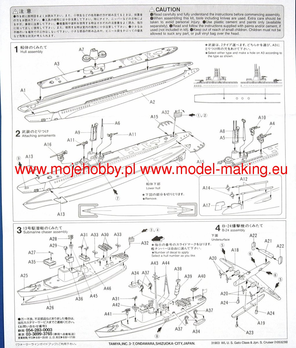 Gato is the name of a class of American diesel-electric fighter submarines (SS) of the Second World War. The first unit of this type was launched in 1940. In total, 77 units of this type were created. The Gato-class ship was 95 m long, 8.3 m wide, and had a displacement of about 2,400 tons. The maximum underwater speed is approx. 9 knots. The ships of this type had ten 533 mm torpedo tubes - including six bow and four stern. The ship's armament also included single 76 mm, 40 mm and 20 mm cannons. The Gato-class ships were developed and put into production as a far-reaching extension of the Tambor-class structure. Compared to their predecessors, they had a much longer swimming range and significantly improved combat capabilities. They also had new, highly reliable and proven diesel engines, which increased the possible patrol time of a single ship. Units of this type also offered - as for the submarines of that time - a good working comfort for the crew. They also had radio and electronic equipment as rich as those times. The Gato-class ships played a gigantic role in World War II, inflicting huge losses on the Japanese merchant navy in 1942-1945. It is worth adding that it was a ship of this class (USS Archerfish) that sank the Japanese carrier Shinano in November 1944. Some ships of this type, after modernization, remained in service with the US Navy until the end of the 1960s.Class No. 13 (jap. Dai 13 Gō-gata Kusentei) is a term for a class of Japanese submarine chasers (ZOP chasers) from World War II. Units of this class were launched in 1939-1944. The length of the ship of this class was 51 m, width 6.7 m, and displacement - approx. 450 tons. The maximum speed was up to 16 knots. The main armament at the beginning of World War II was 1 76.2 mm gun, 2 13.2 mm machine guns and 36 depth charges. Construction of ZOP speeders, class no. 13 was initiated as a result of the expansion of the USSR's submarine fleet in the Far East. And it was the Soviet submarines that were perceived as the main threat to be dealt with by the designed new ZOP speeders. For this reason, they were initially designed as units with a relatively limited autonomy and range of operation, but these parameters were improved during the war in the Pacific. It is worth adding that within one class, a total of 3 subclasses of these units were created, marked as No. 13, No. 28 and No. 60. The units of individual subclasses differed from each other mainly in terms of draft, power units used, the number of the crew and weapons. In fact, of the planned 77 ships, 49 units of all three subclasses were built, of which 35 were lost in the course of combat operations.