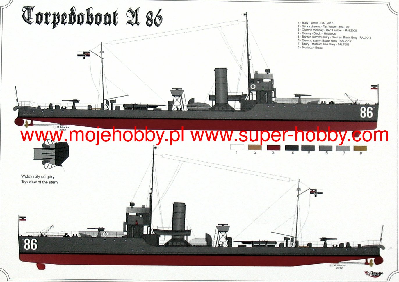 Download Mirage Hobby PDF catalogueThe A86 was a German coastal defense torpedo boat from the First World War. The keel for this unit was laid in February 1918, the launch took place in August 1918. The length of the ship was 60.3 meters and a width of 6.3 meters. Standard displacement was up to 330 tons and maximum speed - up to 26-27 knots. The on-board armament, at the time of launch, consisted of two 88 mm guns, a 450 mm torpedo launcher and a sea mine drop-off point. The A86 was built at the AG Vulcan shipyard in Szczecin. The unit was created as one of the ships belonging to the A / III torpedo boat type, the design of which was developed in 1916. The type A / III ships were a development of the A type torpedo boats, and in relation to them, they had greater displacement, and were also longer and wider. The on-board artillery armament was also strengthened and adapted to the placement of sea mines. Overall, it was a successful type of ship with a decent top speed and decent seaworthiness. Type A / III units operated mainly in the Baltic Sea. Due to the late launching date, the A86 torpedo boat did not play any major role in World War I, and after it ended, it was first in Great Britain, and in 1920 it was transferred to the French Marine Nationale. However, it was sold for scrap shortly after 1920.