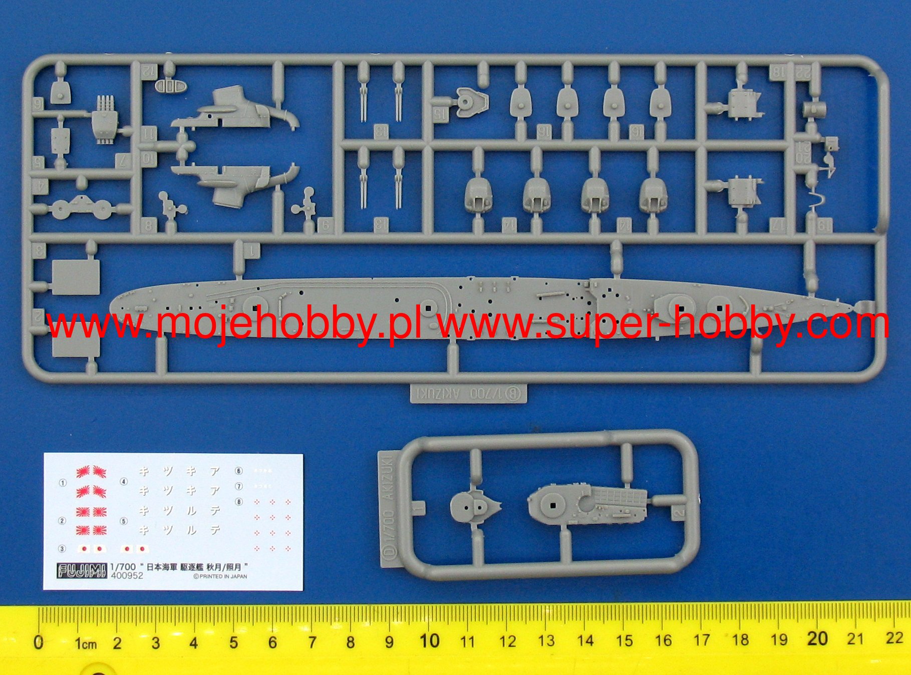 Akizuki był japońskim niszczycielem pod którego stępkę położono w 1940 r., wodowano w lipcu 1941 r., a wcielono do służby w Japońskiej Cesarskiej Marynarce Wojennej w czerwcu 1942 roku. Długość okrętu w chwili wodowania wynosiła 134,2 m, szerokość 11,6 m, a faktyczna wyporność pełna 3.700 ton. Prędkość maksymalna niszczyciela Akizuki dochodziła do 33 węzłów. Główne uzbrojenie w momencie wodowania stanowiło 8 dział 100 mm w czterech podwójnych wieżach, a uzbrojenie dodatkowe to działka 25 mm, miotacze bomb głębinowych oraz cztery wyrzutnie torpedowe kal. 610 mm. Akizuki był pierwszym niszczycielem typu o tej samej nazwie tj. Akizuki. Niszczyciele tego typu były projektowane jako niszczyciele przeciwlotnicze, mające służyć jako osłona szybkich lotniskowców japońskich co zaowocowało uzbrojeniem w artylerię uniwersalną kal. 100 mm oraz słabe jak na standardy japońskie uzbrojenie torpedowe. Wstępnie planowano wodować 55 jednostek tego typu, ale w wyniku problemów z dostawami surowców do służby weszło jedynie 12 niszczycieli klasy Akizuki. Zyskały jednak bardzo pochlebne oceny ze względu na swój duży zasięg, wysoką prędkość, dobrą stateczność i dzielność morską. Były uznawane za jedne z najlepszych niszczycieli II wojny światowej. Niszczyciel Akizuki (numer burtowy 104) od razy po wejściu do służby walczył w rejonie Aleutów w czerwcu 1942 roku. W sierpniu tego samego roku walczył koło Wysp Salomona. Przez dalszą część 1942 roku osłaniał konwoje idące do i z Guadalcanalu stanowiąc istotny element tzw. Tokyo Express. W toku tej wziął udział w boju koło przylądka Esperance (październik 1942 r.). W 1943 roku pełnił przede wszystkim funkcje konwojowe. Akizuki w czerwcu 1944 roku wziął udział w bitwie na Morzu Filipińskim, a w październiku tego samego roku w bitwie w Zatoce Leyte. W toku tej bitwy został zatopiony 25 października 1944 roku. Co oprócz modelu będę potrzebować do jego sklejenia?