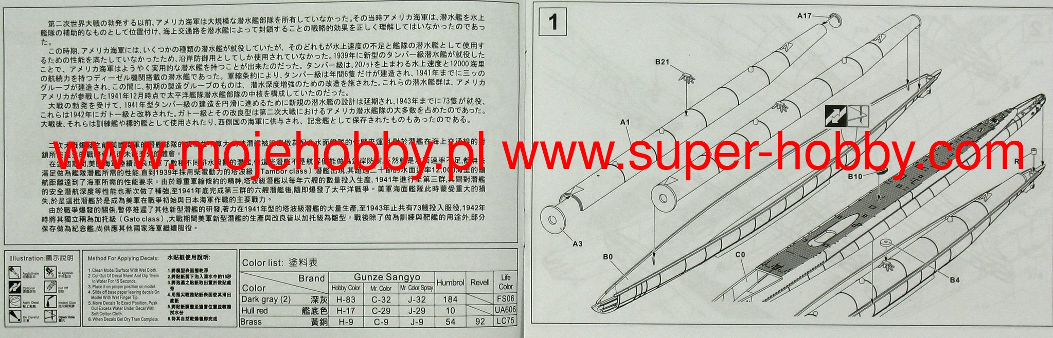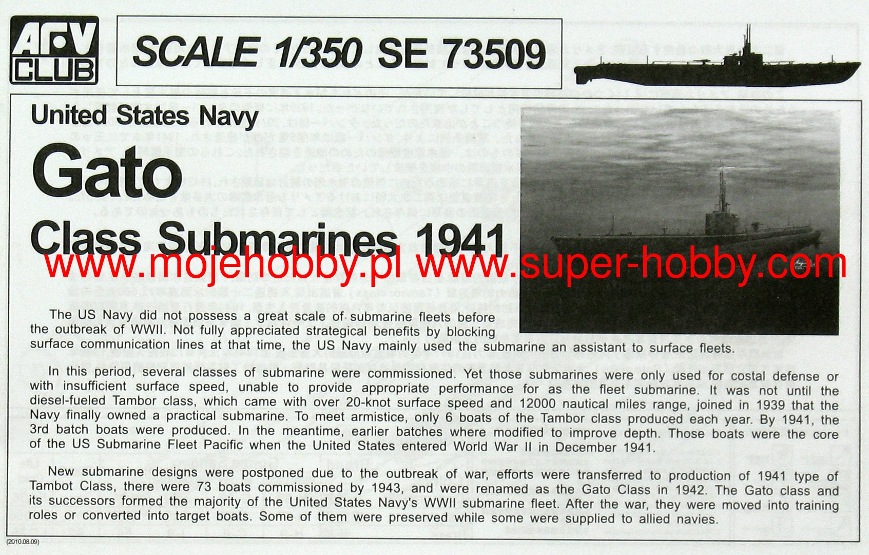 Gato is the name of a class of American diesel-electric fighter submarines (SS) of the Second World War. The first unit of this type was launched in 1940. In total, 77 units of this type were created. The Gato-class ship was 95 m long, 8.3 m wide, and had a displacement of about 2,400 tons. The maximum underwater speed is approx. 9 knots. The ships of this type had ten 533 mm torpedo tubes - including six bow and four stern. The ship's armament also included single 76 mm, 40 mm and 20 mm cannons. The Gato-class ships were developed and put into production as a far-reaching extension of the Tambor-class structure. Compared to their predecessors, they had a much longer swimming range and significantly improved combat capabilities. They also had new, highly reliable and proven diesel engines, which increased the possible patrol time of a single ship. Units of this type also offered - as for the submarines of that time - a good working comfort for the crew. They also had radio and electronic equipment as rich as those times. The Gato-class ships played a gigantic role in World War II, inflicting huge losses on the Japanese merchant navy in 1942-1945. It is worth adding that it was a ship of this class (USS Archerfish) that sank the Japanese carrier Shinano in November 1944. Some ships of this type, after modernization, remained in service with the US Navy until the end of the 1960s.