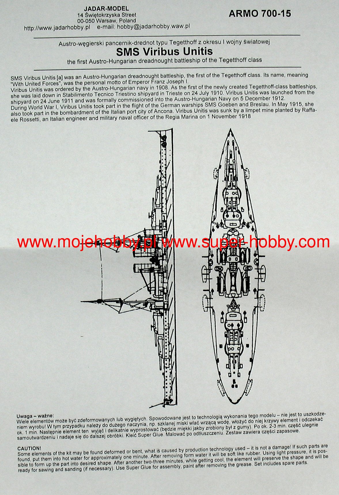 SMS Viribus Unitis was an Austro-Hungarian battleship (so-called dreadnought) from the end of World War I. The keel for this unit was laid in 1910, the launch took place in June 1911, and the entry into service in the Kaiserliche und Königliche Kriegsmarine - in 1912. The length of the ship was 152.2 meters and a width of 27.3 meters. Full displacement reached approx. 21,600 tons, and maximum speed - approx. 20 knots. The deck armament, at the time of the launch, consisted of, among others: 12 305 mm guns placed in four turrets of three guns, 12 150 mm guns and 18 70 mm guns. SMS Viribus Unitis was one of four Tegethoff-class battleships. Units of this type were the first and the last dreadnoughts that served in the Austro-Hungarian Navy. Units of this type had three-barreled towers, modern for those times, with high-quality Skoda cannons. Also, their armor and general combat properties were similar to the potential enemy, i.e. the Italian battleship of the Dante Allighieri type. However, they were clearly inferior to the speed of Italian dreadnoughts of the Conte di Cavour type. One of the battleships of this type was SMS Viribus Unitis, which was built at the shipyard in Stabilimento Tecnico Triestino in Trieste. The unit, shortly before the outbreak of World War I, covered the escape of the German units SMS Goebben and SMS Breslau to Turkey. In 1915, the unit took part in the bombing of Ancona, and then - until June 1918 - remained in the port of Pula. In June 1918, the unit attempted to break the blockade on the Strait of Otranto - it was his last combat operation during the war. The vessel was sunk on the night of October 31 to November 1, 1918, by Italian divers, when the ship was already formally handed over to the state of Serbs, Croats and Slovenes.