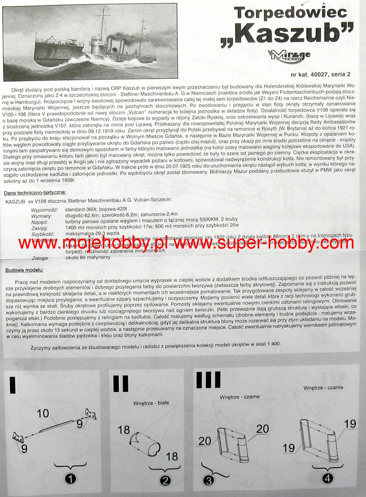 Download Mirage Hobby PDF catalogueORP Kaszub was a German and later Polish torpedo boat from the First World War and the interwar period. The keel for this unit was laid in 1913, the launch took place in December 1914, and entry into service in Kaiserliche Marine took place in 1915. The length of the ship was 62.6 meters and a width of 6.2 meters. Full displacement reached approx. 420 tons, and maximum speed - approx. 28-29 knots. In 1925, it was armed with two 75 mm guns, two 450 mm torpedo tubes and two machine guns. ORP Kaszub was originally called V-108 and was built for the Dutch Navy at the AG Vulcan shipyard in Szczecin. However, at the outbreak of World War I, it was taken over by the German Kaiserliche Marine. After entering service, the unit performed active service in the Baltic Sea, including: taking part in the battle of Liepaja in May 1915. In 1916, she was reclassified as a training ship and survived in this role until the end of World War I. After the war, the ship first found its way to Great Britain, from where it came to Poland. It entered the Polish Navy in 1921. Unfortunately, in July 1925, an explosion took place at ORP Kaszub, as a result of which the unit broke in two and sank
