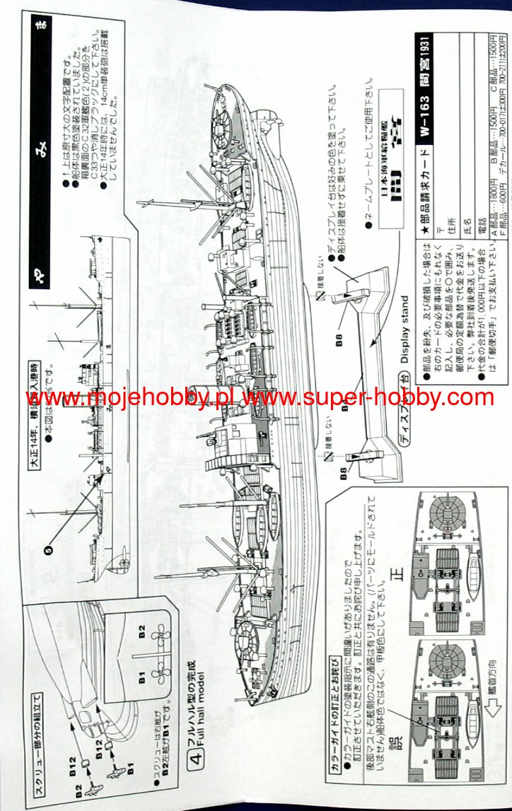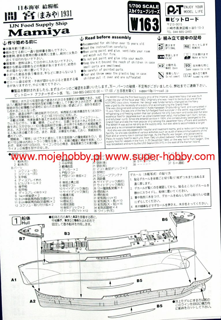 Mamiya była japońskim okrętem zaopatrzeniowym z okresu międzywojennego oraz II wojny światowej. Położenie stępki pod tę jednostkę miało miejsce w 1922 r., wodowanie nastąpiło w październiku 1923 r., a wejście do służby - w lipcu 1924 roku. Długość całkowita okrętu wynosiła 144,8 m, przy szerokości 18,6 metrów. Wyporność standardowa dochodziła do 15.800 ton, a maksymalna prędkość - do ok.19-20 węzłów. Na uzbrojenie pokładowe jednostki w chwili wodowania składały się 2 działa kal. 140 mm oraz 2 działa przeciwlotnicze kal. 76,2 mm. Mamiya została zbudowana w stoczni należącej do koncernu Kawasaki i pierwotnie zakładano, że będzie okrętem transportowym ogólnego przeznaczenia. Jednak w toku służby była odpowiedzialna przede wszystkim za przewożenie żywności i do takiej roli została, krótko po wejściu do służby dostosowano. Była w stanie przewieźć porcje jedzenia dla 18.000 ludzi na 3 tygodnie, wraz z odpowiednią ilością kuchni polowych. Jednostka wzięła udział w wojnie na Pacyfiku, ale ze względu na swój charakter nie uczestniczyła w działaniach bojowych. Mamiya została zatopiona 21 grudnia 1944 r. przez amerykański okręt podwodny USS Sealion. Co oprócz modelu będę potrzebować do jego sklejenia?