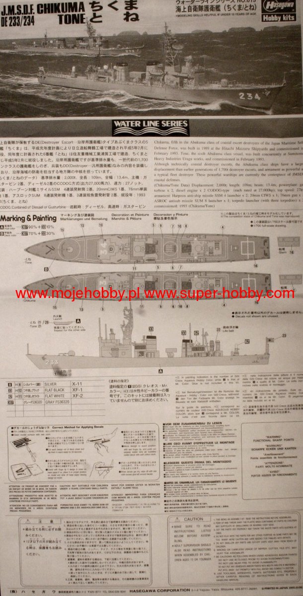 Chikuma (DE-233) is a modern Japanese escort destroyer, also classified as a corvette. The keel for this unit was laid in February 1991, the launch took place in January 1992, and entry into service took place in February 1993. The ship is 109 meters long, 13 meters wide and has a draft of 3.7 meters. Full displacement comes to approx. 2,550 tons, and maximum speed - to approx. 27-28 knots. The armament includes: a single 76mm OTO Melara cannon, a single ASROC missile launcher, 8 Harpoon missile launchers or a single 20mm Vulcan Phalanx CIWS set. Chikuma (DE-233) is the fifth of six Abukuma-class escort destroyers built. The Abukuma-class ships were designed and built to complement and later replace the Yubari-class destroyers. Compared to their predecessors, they have received numerous improvements - both in terms of design and equipment. First of all, they are slightly longer and wider and have significantly greater displacement. They also have a quite clearly more powerful gym in the CODOG configuration (similar to the Yubari class), which allows them to achieve a higher maximum speed. Abukuma-class destroyers also have clearly stronger weapons - especially those dedicated to ZOP (anti-submarine combat) activities. Abukuma-class units, including, of course, the Chikuma (DE-223) also received significantly better electronic equipment (e.g. fire control and information exchange systems). It is often indicated that Abukum class units are the first in the JSDMF to possess some stealth characteristics. It is worth adding that Chikuma (DE-233) got its name after the Japanese cruiser from World War II.
