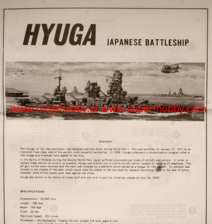 Хьюга японский линкор, заложенный под киль в 1915 году, спущенный на воду в январе 1917 года и вошедший в состав Императорского флота Японии в апреле 1918 года. Корабль имел длину 219 м, ширину 33,8 м и полное водоизмещение 38 800 тонн. Максимальная скорость линкора Хюга была около 21-23 узлов, а после модернизации достигла 25 узлов. Основное вооружение на момент спуска составляло 12 356-мм орудий в шести башнях по два орудия в каждой, а дополнительное вооружение в основном составляло 20 140-мм орудий. Хьюга был вторым и последним линкором класса Исэ. Во время Первой мировой войны он не подвергался серьезной модернизации, а в 1926-1928 и 1934-1936 годах подвергся крупным реконструкциям. В первую очередь было значительно усилено бронирование, добавлены катапульты для гидросамолетов и зенитная артиллерия. Весь тренажерный зал также был модернизирован. Несмотря на это, Хюга в начале Второй мировой войны сильно отличался от других японских или американских линкоров и считался довольно устаревшим. Поэтому, когда Япония потеряла 4 авианосца в битве за Мидуэй, было принято решение переоборудовать Huyga в гибридный линкор-авианосец. Реконструкция длилась с мая по октябрь 1943 года, но оказалась совершенно неверной идеей! После восстановления Хьюга сражался в битве при Лейте. В июле 1945 г. сильно поврежден на базе в Куре в результате атаки американских бортовых самолетов. Экипаж принял решение самостоятельно потопить корабль. После войны Хьюга был списан в 1947 году.