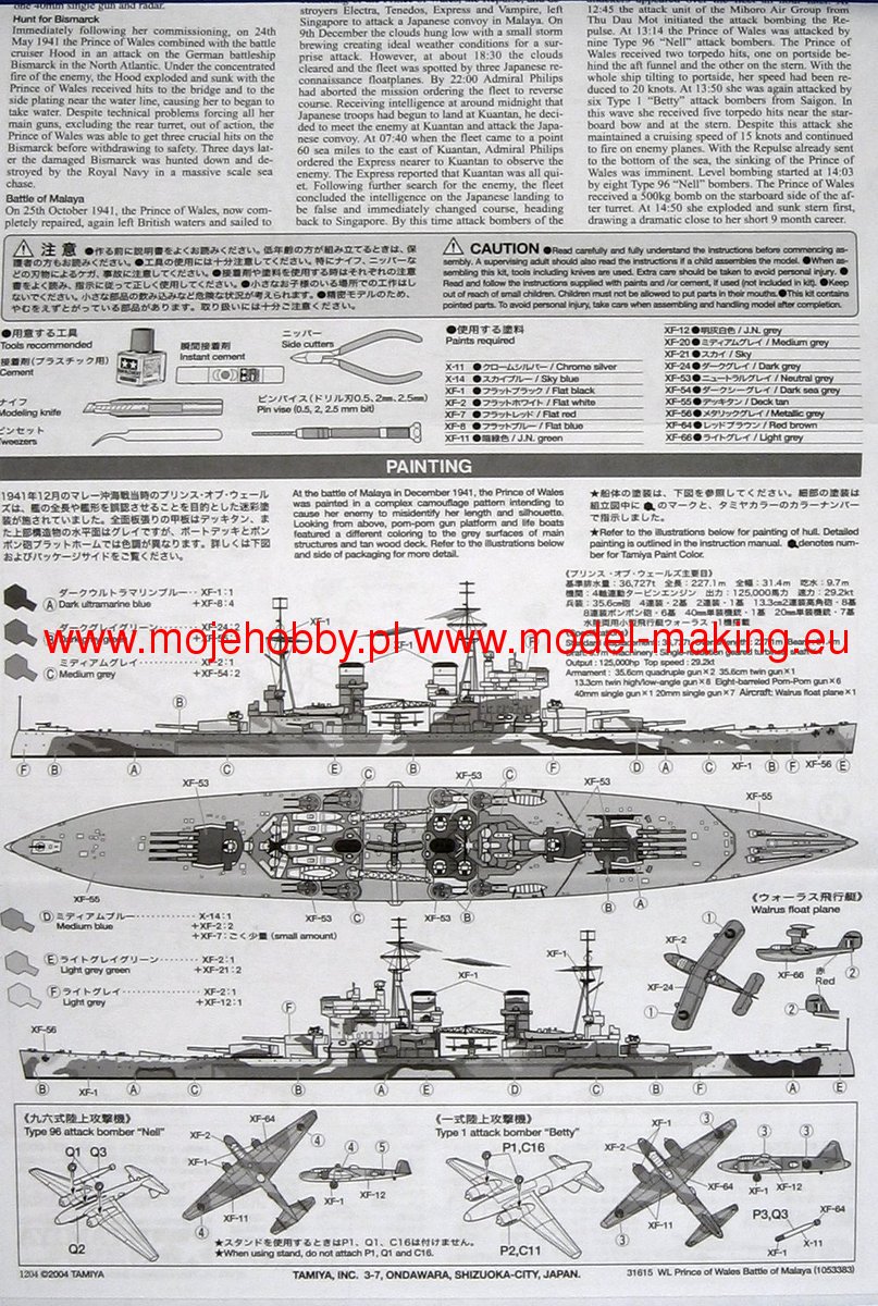 HMS Prince of Wales was a British battleship laid down in 1937, launched in May 1939, and commissioned in the Royal Navy in March 1941. The total length of the ship was 227 m, width 31.5 m, and full displacement - 42,100 tons. The maximum speed of the battleship Prince of Wales was around 28 knots. The main armament at the time of the launch was 10 356 mm guns in two turrets with four guns and one twin turret. The secondary armament consists of 16 133 mm guns, 49 40 mm AA cannons and 7 20 mm cannons. HMS Prince of Wales was the second of five King George V-class battleships. Battleships of this type were the first, after 1918, in which British designers no longer had to pay attention to disarmament routes, especially the London route of 1930. They were also built for planned clashes with Italian battleships in the Mediterranean Sea, German battleships in the North Sea and - especially - Japanese battleships in the Far East. As a result, ships with strong artillery armament, especially medium artillery, and above all with powerful armor, were created. HMS Prince of Wales battleship was built at the Cammell-Laird shipyard in Birkenhead. Almost immediately after its commissioning, it was sent to fight the German battleship Bismarck in May 1941 - during the battle with this ship in the Danish Strait, it suffered serious damage. After renovation, it returned to the Home Fleet depot with a base in Scapa Flow. In August 1941, he played a role in diplomacy by ferrying Prime Minister Winston Churchill to North America to meet US President Franklin D. Roosevelt. It was on board HMS Prince of Wales that the Atlantic Charter was signed on August 14, 1941. After returning to Great Britain, she was briefly dispatched to the Mediterranean Sea and later to the Far East with the battleship HMS Repulse. On December 10, 1941, both ships were sunk by the Japanese air force in the South China Sea.The sea battle of Kuantanam was fought on December 10, 1941 in the South China Sea, in the south-eastern part of the Peninsula. Malay. The antagonists in this battle were the British Royal Navy and the Japanese naval aviation operating - interestingly - primarily from land bases. It was the first British-Japanese clash of such a scale in World War II. The genesis of the Battle of Kuantanam dates back to the decision of the British Prime Minister in October 1941 to strengthen the Royal Navy in the Far East by moving a strong fleet team to this area. The team originally was to consist of the airport HMS Indomitable and the battleships HMS Prince of Wales and HMS Repulse. However, in the end, only battleships (the so-called Team Z) were sent to the Malaya region, which later also received a destroyer escort. A cardinal error, as it turned out later, was the insufficient anti-aircraft defense of the team. Immediately after the information about the attack on Pearl Harbor and the information about the approach of the Japanese convoy to Malaya, the commander of the team (adm. Philips) decided to meet him, with the intention of waging a sea battle. However, as soon as he realized the loss of the element of surprise, he decided to return to the British base in Singapore on the night of December 9-10, 1941. However, it was detected by the Japanese submarine I-58, which passed the information to the Japanese command, and this decided to attack the British battleships with its aviation. The Battle of Kuantanam began around 10.00 am on December 10, 1941. It was a thoroughly unequal battle in which about 100 Japanese planes fought a total of six British ships (two battleships and four destroyers). The battle lasted only about 2 clock hours and led to the sinking of HMS Prince of Wales and HMS Repulse! The Japanese side, with the loss of about 30 aircraft, achieved a gigantic success, gaining complete freedom of operation in Malaya, as well as once again proving the power of sea aviation.