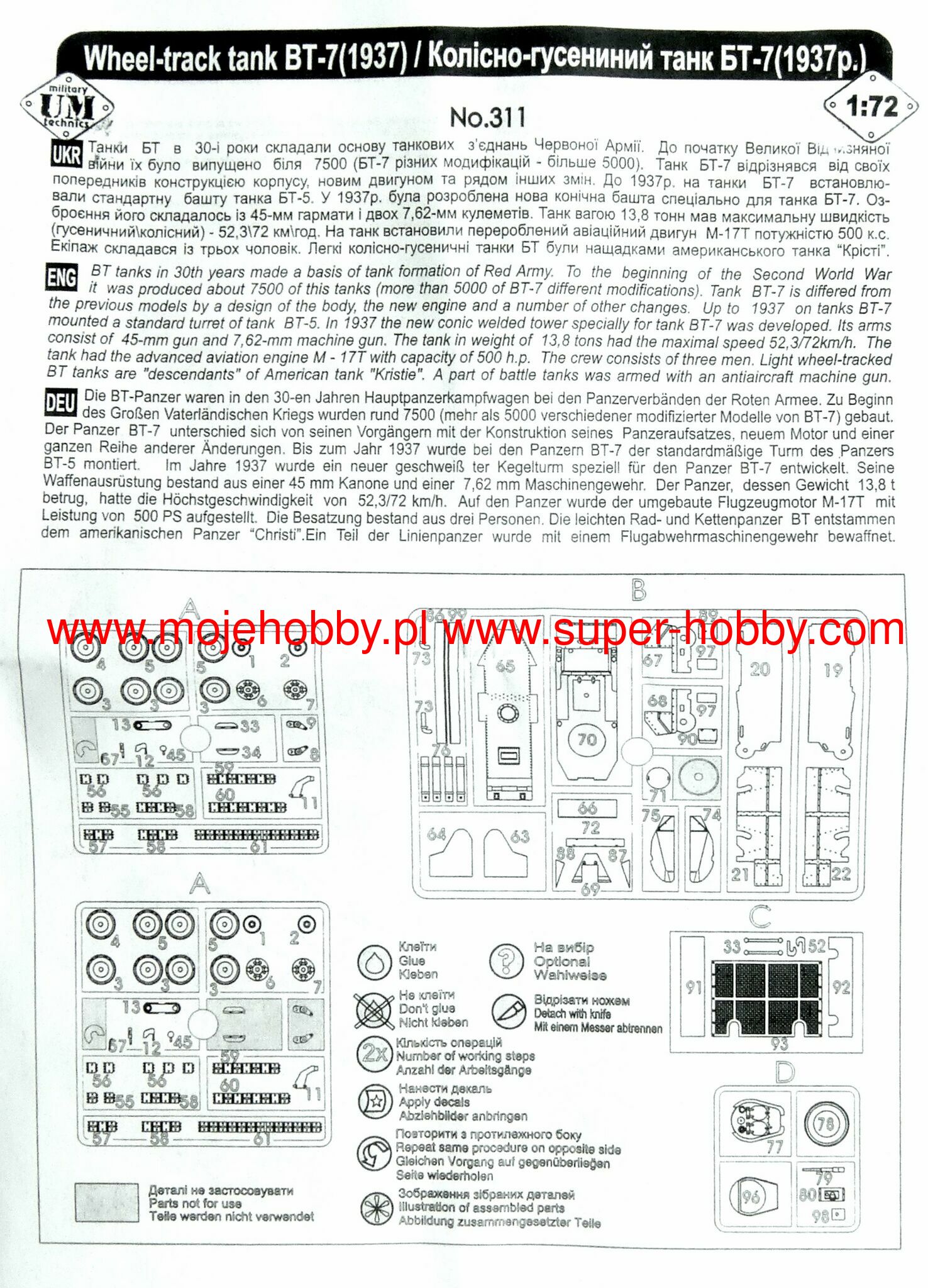 The BT-7 is a Soviet light tank from the interwar period and from the initial phase of World War II. The first prototypes of this vehicle were created in the early 1930s, and serial production lasted from 1935 to 1940. Probably around 5,300-5,500 vehicles of this type were created in its course. In the basic version (BT-7), the drive was provided by a single M-17T engine with a capacity of 450 HP. The basic armament consisted of a 1932 model gun caliber 45 mm and 1 machine gun DT 7.62 mm. The BT-7 belonged to the family of high-speed (high-speed) tanks developed in the USSR based on the imported chassis and suspension of Walter Christie. It allowed these tanks to move on both tracks and wheels. Of course, when driving on the road, the maximum speed of the BT family cars was very high - far exceeding the capabilities of tracked cars. The BT-7 tank also had this option. It was created as an evolutionary development of the BT-5 car. However, it had a larger hull than its predecessor. From 1937, a new turret was installed on it, the suspension was also strengthened and the drive train was improved. In late 1939, the BT-7M model, powered by the more powerful W-2 engine and a completely new turret, entered production. The BT-7 tanks were used in combat during the aggression against Poland in September 1939, as well as in the initial phase of the German-Soviet war in 1941.