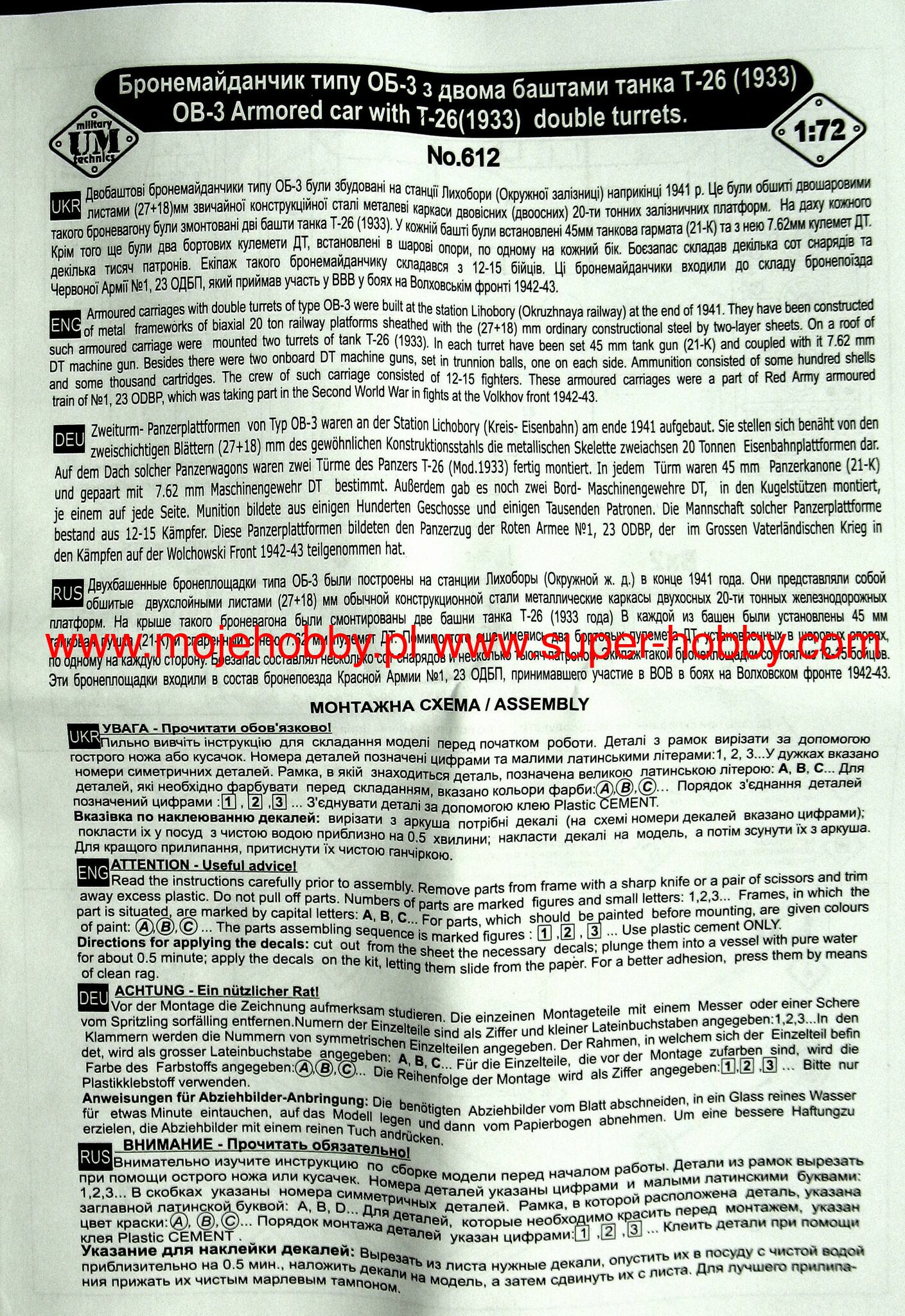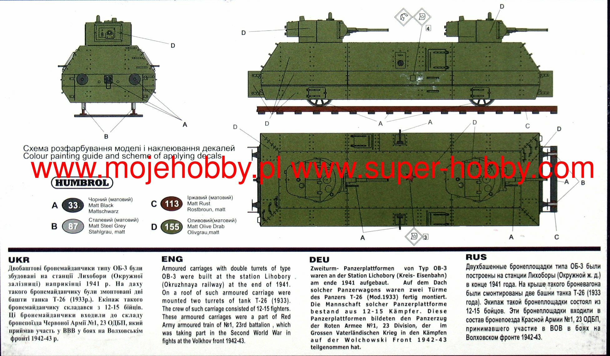 OB-3 is a Soviet armored draisine from the interwar period and World War II. Serial production started in the second half of the 1930s. The armament consisted of one or two 45mm guns mounted in rotating turrets and 5-6 DT 7.62mm machine guns. The crew consisted of 10 to 12 people. The OB-3 draisine was constructed on the basis of a two-axle goods wagon with a load capacity. Armor plates with a thickness of 30 to 40 mm and - depending on the version - one or two towers for the main armament of the draisine were added to the wagon. It is worth adding that it was placed in the same turrets that were mounted on the T-26 mod. 1933. OB-3 draisines took an intensive part in the beginning of the German-Soviet war of 1941-1945, and their production at that time took place, among others, in Leningrad and Moscow.
