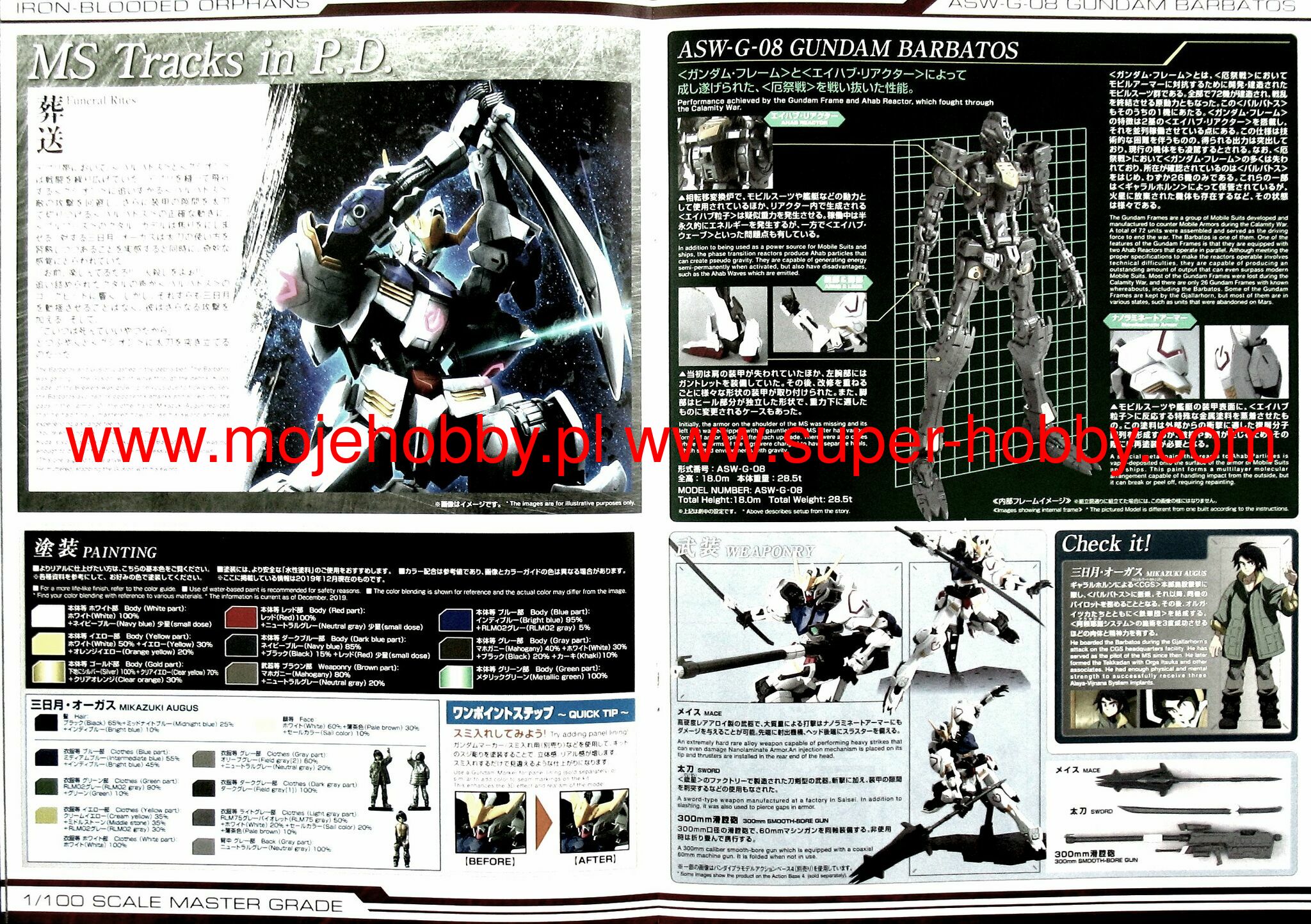 MG - Master Grade The next level is designated as Master Grade, production of which began in 1995. And it is only offered in 1:100 scale. This series is made of the highest quality plastic. These models have many more elements than the other series, which is why the model is more complicated and its assembly takes a long time. The MG series models have the greatest possible range of motion (e.g. movable fingers) compared to the lower series due to the internal skeleton. High quality translates into an amazing look and attention to detail, but nothing stands in the way of using paints to enhance the model. Assembly Difficulty: Hard Number of elements: over 250+ Size: 18cm Contents of the package GUNPLA Model Assembly instructions Short instruction manual in Polish stand* Stickers to enhance the model *Not all models include a stand Special features of the MG series: Scale 1/100, model size 180 mm, more than 260 elements to assemble, difficult level.