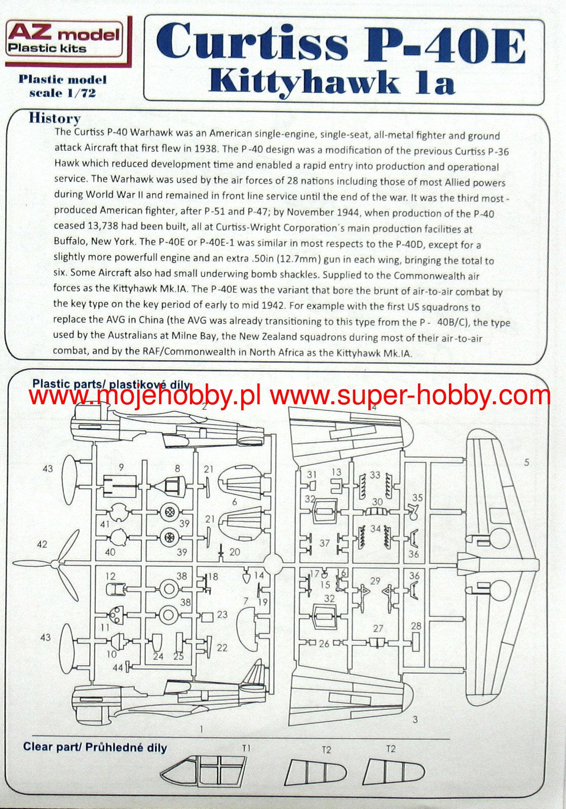 The Curtiss P-40 Warhawk is an American, single-engine, metal fighter-attack aircraft in a low wing configuration with a classic tail. The flight of the prototype took place in 1938, and serial production was carried out in the years 1938-1944. The last of the Hawk family of planes - the Curtiss P-40 Warhawk was, apart from the Republic P-47 and the North American P-51 Mustang, the most widely built American fighter. At the end of production in December 1944, the number of machines exceeded 15,000. The development of the design began in 1937, when the prototype airframe of version 75 was adapted to the installation of the 1167HP Allison V-1710-11 in-line engine. The plane became the first American construction capable of flying at speeds over 483 km / h. The version for the RAF was called the Tomahawk Mk IIA. The planes had self-sealing fuel tanks and two wing-mounted 7.7mm machine guns. The Tomahawk MkIIB were equipped with American radio hardware and armed with six 7.7mm machine guns. Some American P-40s were modernized in 1941 for reconnaissance tasks. They received the designation RP-40. Meanwhile, work on the Hawk 81-A was underway at the Curtiss facility. The changes included the installation of the Allison V-1710-39 engine with a capacity of 1167KM, providing constant power up to a height of 3563 meters, adaptation for installation in the wing of four 12.7mm machine guns and the installation of a fuselage node that could carry one bomb weighing 227 kg or thrown back additional fuel tank. The US Army placed an order for these machines in September 1940, awarding them the designation P-40D. Over the next three years, Curtiss made every effort to expand the application possibilities of the P-40, creating numerous new versions of the aircraft. Despite these efforts, Warhawk's performance was lower than that of contemporary Allied and Axis fighters. Technical data (P-40E version): length: 9.66m, wingspan: 11.38m, height: 3.76m, maximum speed: 580km / h, rate of climb: 11m / s, maximum range: 1100km, practical ceiling: 8800m, armament: fixed - 6 M2 machine guns, caliber 12.7 mm, suspended - up to 900 kg of cargo.