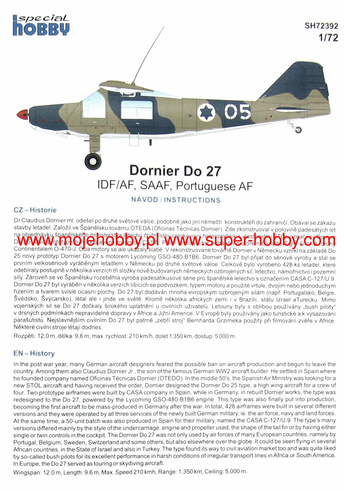 The Dornier Do 27 is a German civilian multi-role, metal-structure high-wing aircraft. The drive is provided by a single Avro-Lycoming GO-480-B1A6 engine with 274 HP. The flight of the prototype took place in 1955, and serial production began in the same year and continued in 1965, ending with the production of over 600 copies of this aircraft. The Dornier Do 27, was originally designed as the successor to the Do 25 for the Spanish Air Force as a new light multi-role reconnaissance aircraft. However, Dornier quickly saw the possibility of offering the Do 27 to other military customers as well. This was due to the very solid structure of the machine, its good performance, the possibility of a short take-off and landing (STOL) and low minimum speed. Finally, the Do 27 was sent to the air forces of Spain, Germany and Portugal. Especially the latter user used it intensively during the fighting in his then colonies in Angola and Mozambique in the 1960s and 1970s. It is worth noting that the Do 27 was the first mass-produced aircraft in West Germany after 1945.