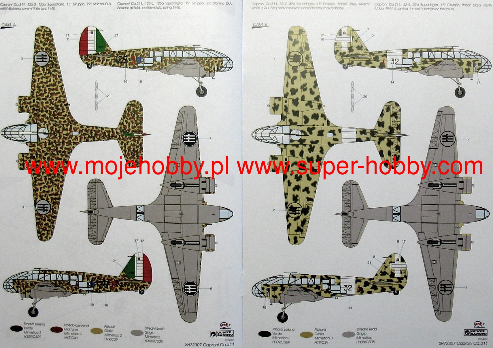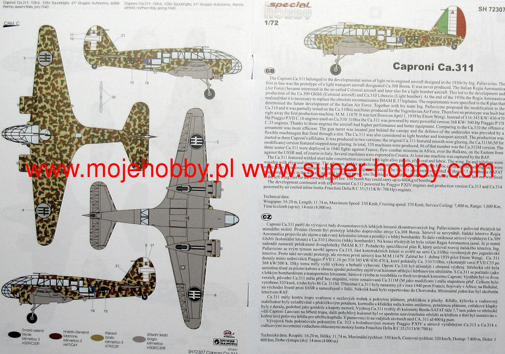 The Caproni CA-311 is an Italian light transport and bomber plane from the Second World War with a metal structure. The drive was made of two Piaggio P VII C.35 radial engines with a power of 470HP. The plane was distinguished by great visibility from the highly glazed nose part, which also led to the use of the CA-311 as a reconnaissance aircraft. The flight of the prototype took place in 1939, and the machine entered service in North Africa in 1940. It quickly "showed" high unreliability and definitely too low engine power. Despite its weakness, it was used in combat in North Africa, the Balkans and the USSR. At the end of the war, it was systematically transferred to training units. Only 335 CA-311s were built. Technical data: Maximum speed: 347 km / h, maximum ceiling 7,400 m, maximum range: 1,700 km, armament: fixed - 3 machine guns caliber 7.7 mm suspended - up to 400 kg of bombs.