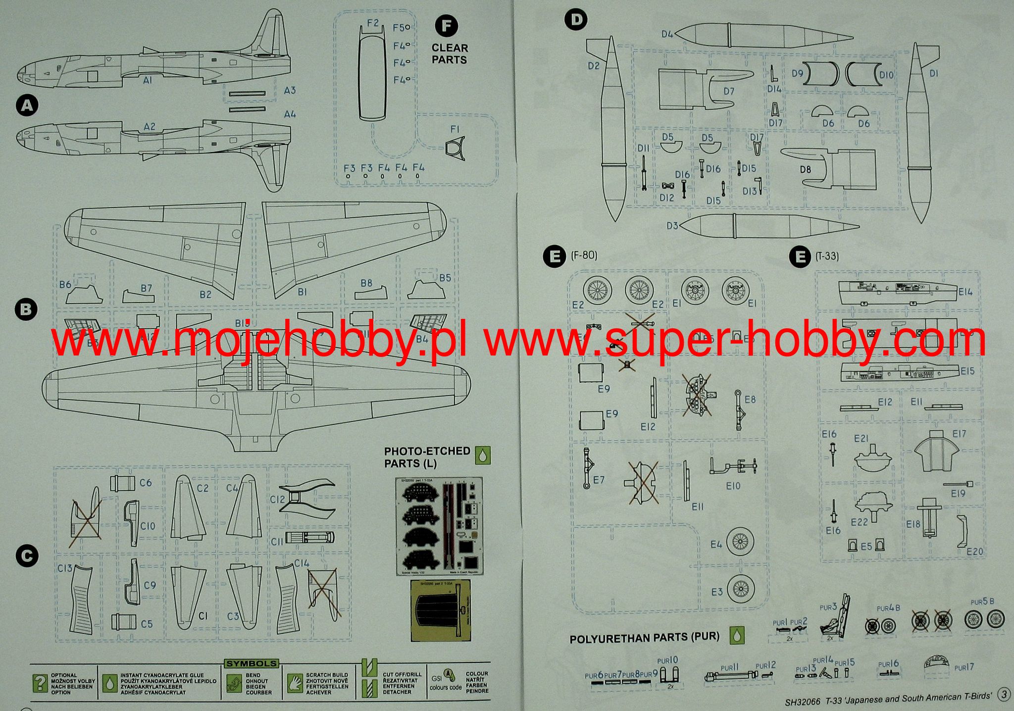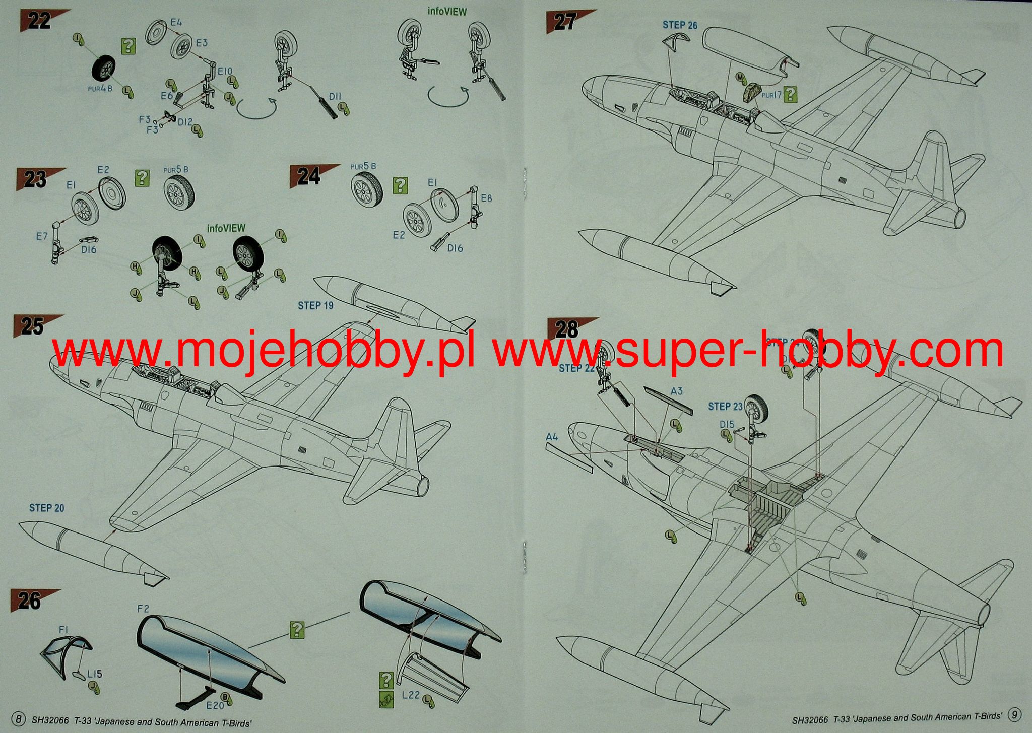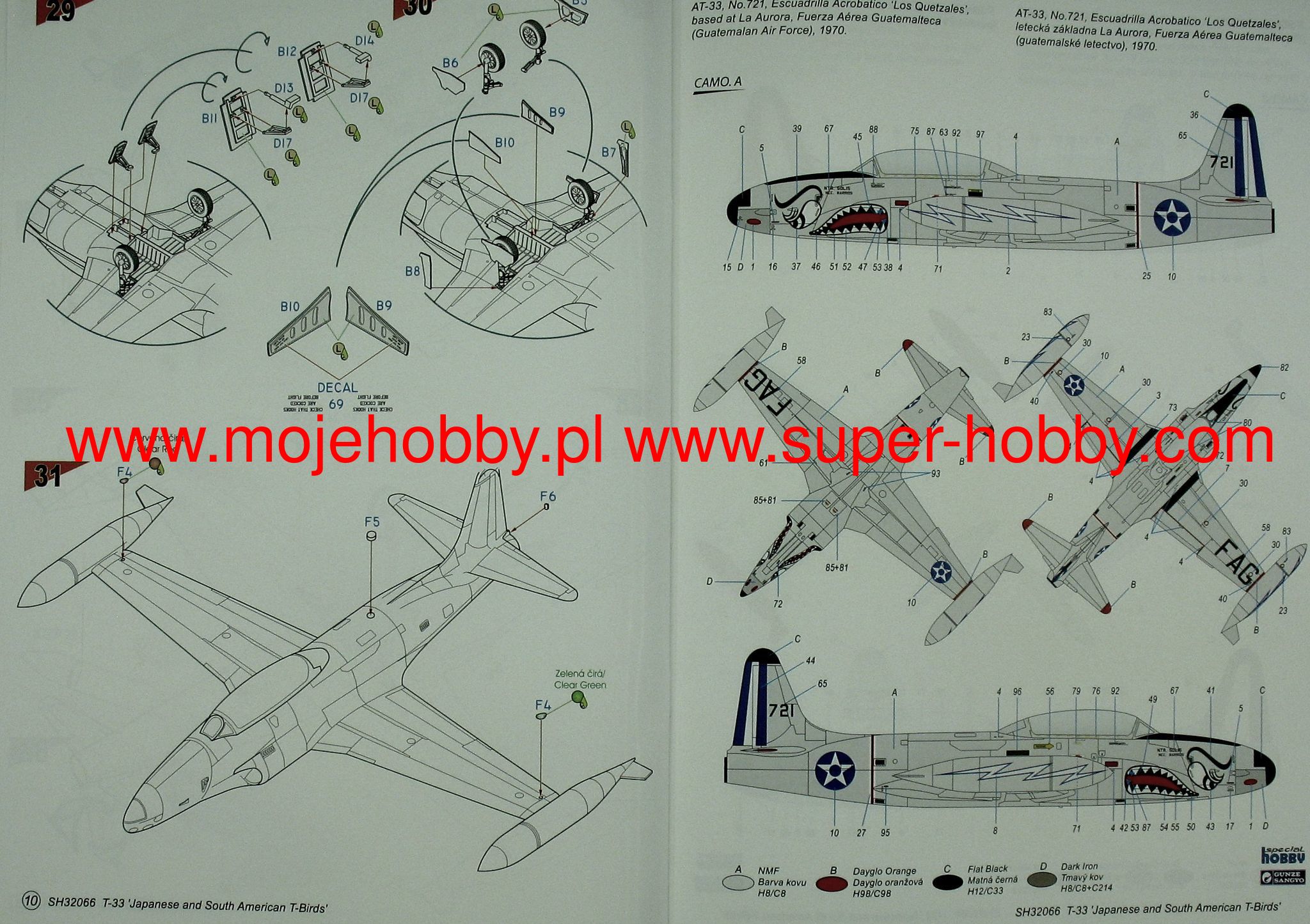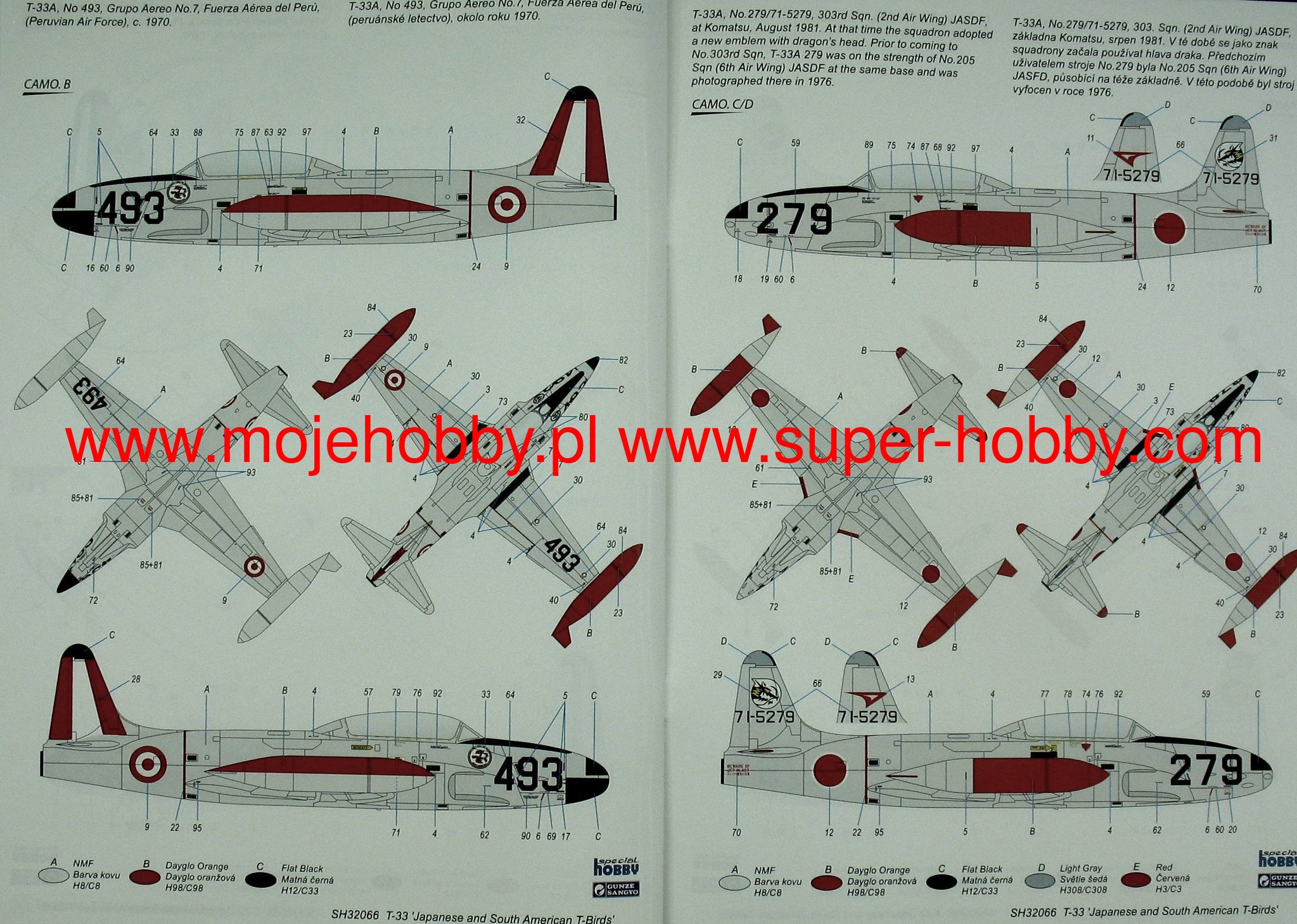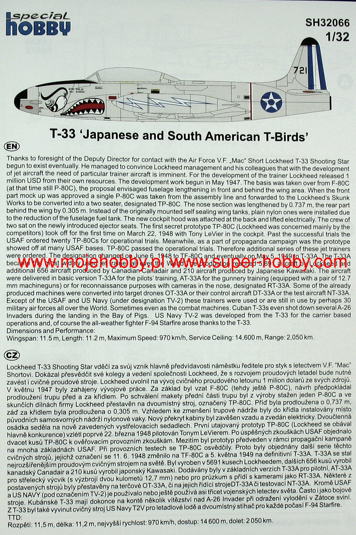 The Lockheed T-33 Shooting Star is an American, single-engine, full-metal low-wing training aircraft. The T-33 was created on the basis of the F-80 by remodeling the internal surface and adding a second pilot's seat. The first T-33 took off in March 1948. and production ended in 1959. 5,691 aircraft of this type were built. The T-33 was also used as a shield towing plane during shooting training. The RT-33A version was produced as a reconnaissance aircraft with a camera in the nose of the plane. The T-33 was widely exported to 39 countries around the world, including Germany, France, Belgium, Brazil and Canada. Technical data: length: 11.49 m, wingspan: 11.86 m, height: 3.57 m, maximum speed: 970 km / h, practical ceiling: 14 600 m, maximum range: 2050 km, armament: fixed - 2 M3 12 machine guns , 7mm, suspended - up to 907 kg of bombs.