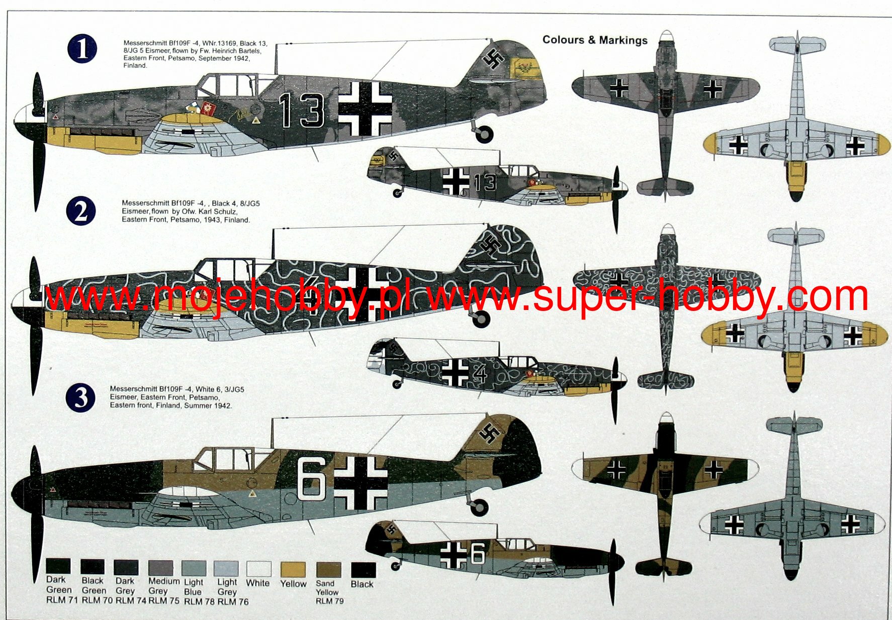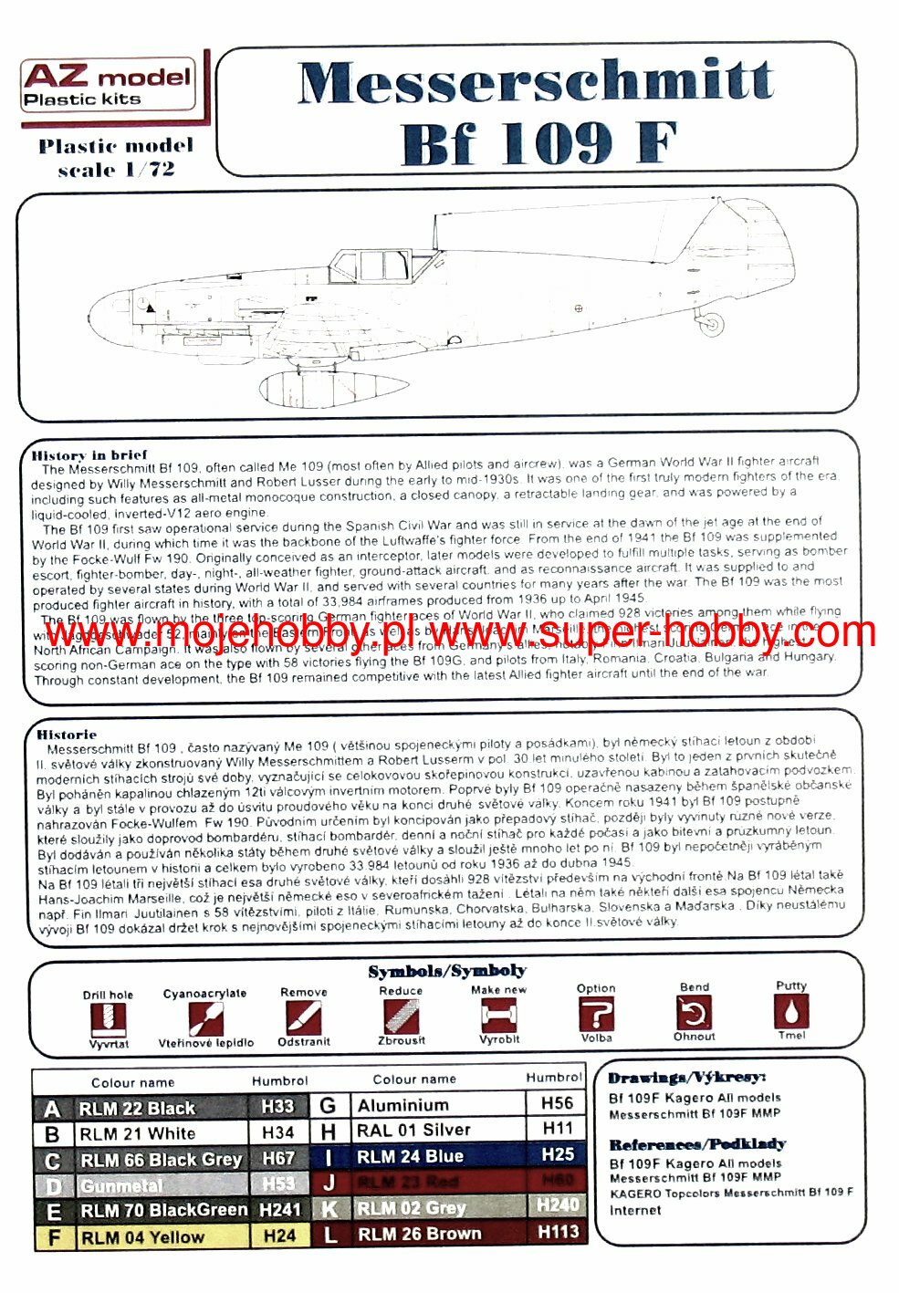 The Messerschmitt Bf-109 is a German metal-structure single-engine fighter in a low wing configuration with a classic tail. It turned out to be the basic and most produced Luftwaffe fighter during World War II. The flight of the prototype took place on May 29, 1935, and serial production continued in the years 1936-1945. In total, it is estimated that a total of about 35,000 Messerschmitt Bf-109 fighters of all varieties were produced, many of which ended up in the Czech and Israeli air forces after the war. The roots of the Bf-109 go back to the competition announced in 1933 by the Luftwaffe for a new fighter plane. In competition with the He-112, the Bf-109 project initially lost, but thanks to Willie Messerschmitt's intrigues, the project could continue and eventually he was the winner of the competition, becoming the Luftwaffe's primary fighter. Several main variants of the Bf-109 were developed in the course of production. The first pre-production series was the Bf-109B (Berta) with different versions of the Junkers Jumo 210 (A or Da) engine. They were tested in Spain from 1937 during the Civil War. The next version is the Bf-109C (Caesar). They had a different engine than the B version, and extensive armament consisting of two 20mm and 2 HP 7.92mm cannons. These machines also fought in the skies of Spain. The third version is the Bf-109D (Dora) with the Junkers Jumo 210 Da or Daimler-Benz DB 600 engine. It fought in the September campaign, but at the turn of 1939/1940 it was replaced by the E version. The most famous model was the Bf-109E (Emil) with a Daimler-Benz 601A or N engine. It was the first to use a three-blade, not a two-blade propeller. Bf-109E fought in the French campaign, over England, and in North Africa and on the Eastern Front. The ace who started his career on the Bf-109E was the famous Adolf Galland. The next version is the Bf-109F (Friedrich), which, according to the German pilots, was the most aerodynamically perfect. It sowed the changed shape of the fuselage, wings, cabin fairings, but no new engine was used. It was put into service at the turn of 1940/1941. As part of the development of the design, further Bf-109 specifications were developed, of which the G (Gustav) version was produced in the largest number of copies. The most important change increasing the machine's performance was the installation of a new 12-cylinder Daimler-Benz DB605A engine with 1475HP. The armament of the Bf-109G was a pair of 13mm machine guns located in the fuselage in front of the cockpit fairing, and the MG151 20mm or heavier MK108 30mm cannon. The last mass-produced version was the Bf-109K (Kurfirst), which production started in October 1944. A Daimler-Benz DB 605DB or DC unit was used as the engine. The Bf-109K was the fastest version produced during World War II, reaching up to 730 km / h. Apart from that, two versions were created - H and Z, but they were rather experimental versions and their mass production did not start. Subsequent improvements in propulsion and armament made the Messerschmitt Bf-109 one of the most dangerous fighters of World War II, and at the same time showed the great potential of the slightly angular airframe created by Willi Messerschmitt. Technical data (version Bf-109 G-6): length: 8.95 m, wingspan: 9.92 m, height: 2.6 m, maximum speed: 640 km / h, rate of climb: 17 m / s, maximum range: 850 km, maximum ceiling 12000m, armament: fixed - 2 MG131 13mm machine guns and 1 MG151 20mm cannon, suspended - 250 kg bombs, or 2 Wfr missile launchers. Gr. 21.
