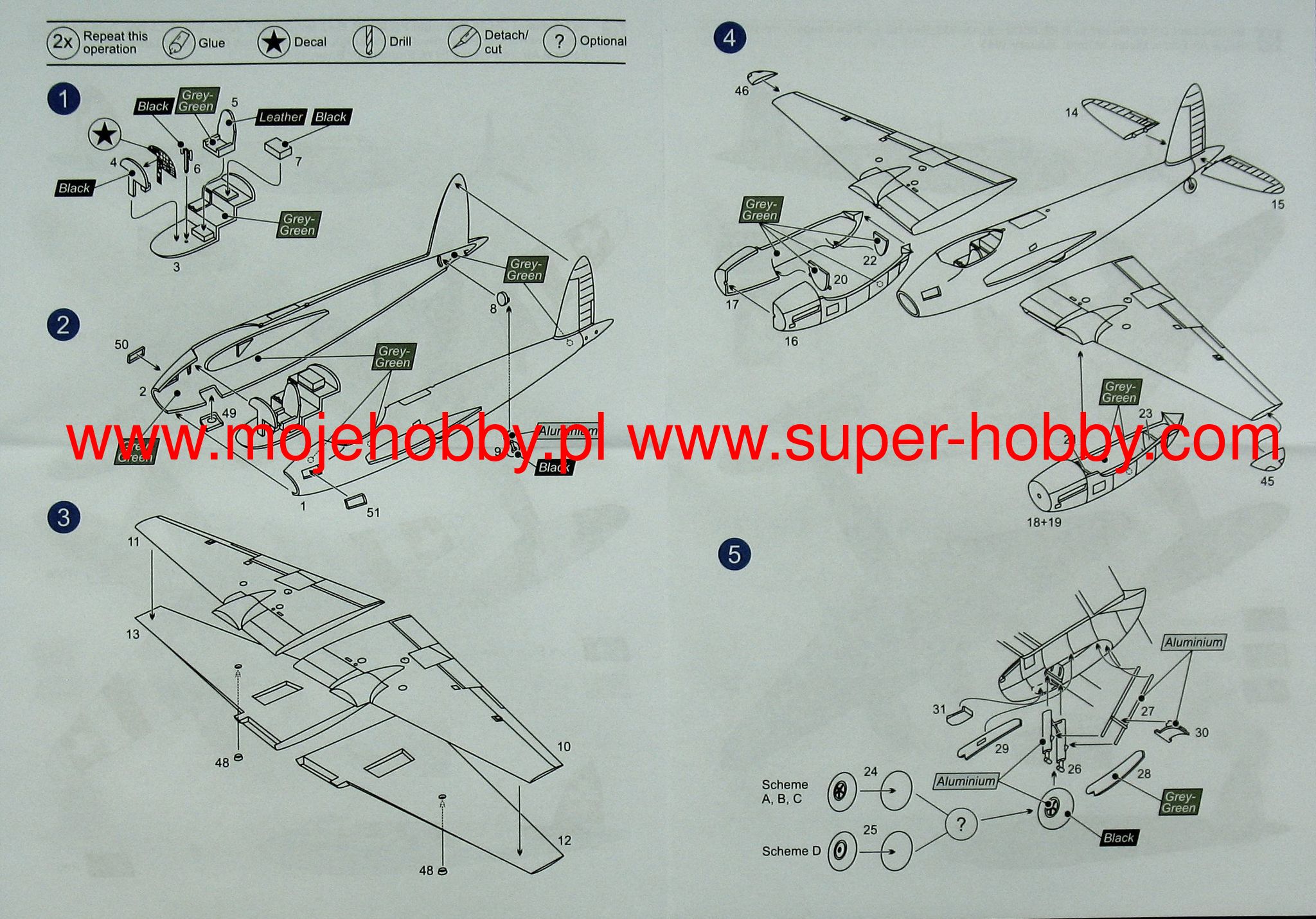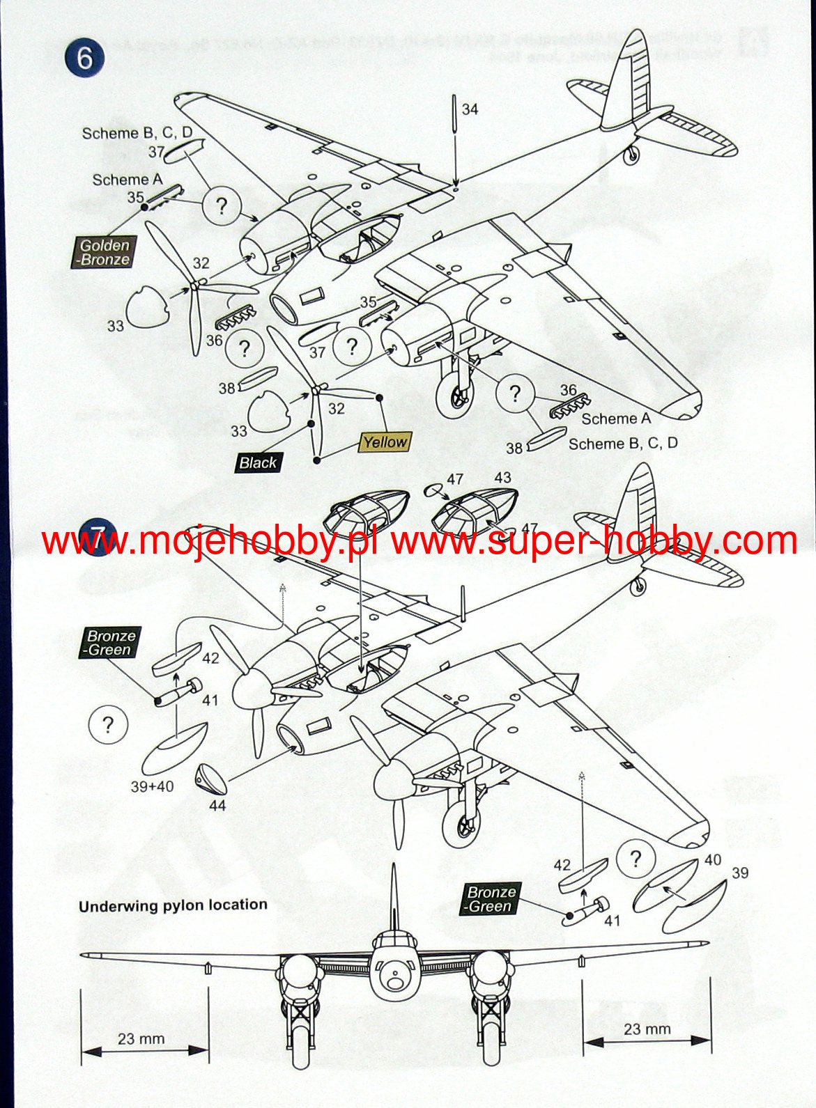 The De Havilland Mosquito is a British, twin-engine, multi-role aircraft with a mixed structure, mainly wooden, with a classic tail. The flight of the prototype took place on November 25, 1940, and the first machines entered the line units in July 1941. The machine was largely made of wooden elements glued with casein glues, and later with synthetic ones. Thanks to this, the machine was very light and showed great aerodynamic properties. Interestingly, it also turned out to be quite resistant to anti-aircraft fire. For this reason, the Mosquito quickly earned the nickname "wooden miracles". Two Rolls-Royce Merlin engines of different variants with power from 1460KM to 1680KM were used as the drive. During the war, a dozen or so versions of this very successful plane were created. The most important of them are, among others Mosquito PR.IX (reconnaissance version), B.IV series I and II (bomb version), F.II (hunting version), NF.II (night fighter with AI.IV radar), one of the most widely produced - FB.VI (fighter-bomber version). Mosquito planes performed numerous functions in the RAF, but the fighter-bomber and bomber versions were the most famous, which made daring raids on German public facilities (e.g. police or Gestapo headquarters) in occupied Europe, often with surgical precision. Technical data (Mosquito F. Mk.II): length: 13.57m, wingspan: 16.52m, height: 5.3m, maximum speed: 610km / h, climb speed: 8.8m / s, maximum range: 1500km , maximum ceiling 8,800m, armament: fixed - 4 7.7mm machine guns and 4 20mm Hispano Mk II cannons.