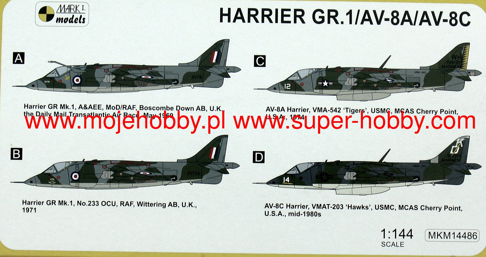 The BAe Harrier is a British single-seat V / STOL fighter, attack and reconnaissance aircraft with a duralumin, half-shell structure. The origins of Harrier's construction can be found in 1957, when Lord Sydney Camm of Hawker Aircraft and Dr. Stanley Hooker of Bristol Siddeley Engines started the construction of a tactical aircraft using the latest turbo-fan engine from Bristol plants, then known as BS.53. It was specially adapted to the vertical thrust vector ensuring the vertical take-off of a fixed-wing aircraft. Engine exhaust gases were directed to four staggered nozzles placed in pairs at the front and rear of the fuselage. The range of rotation of the nozzles exceeded 90 degrees, which allowed the exhaust gases to be directed directly rearward in normal flight, vertically downward for take-off and landing, or to any angle during the transition phase. Around the engine, Camm constructed a compact, conventional, high-wing metal airframe. In the forward part of the fuselage there was a one-person cabin, next to which there were two fixed, stationary air inlets for engines with a semicircular cross-section. The two-wheeled main and one-wheeled undercarriages are built in tandem in the central axis of the fuselage. The first of the six prototypes took off for the first time on October 21, 1960. After less than a year, a complete transition was made from vertical climb to horizontal flight and hover again. In February 1965, the UK government ordered six test aircraft. These were the first examples to be given the name Harrier. Apart from Great Britain, the only user of the standard Harrier aircraft is the Spanish Navy, where the aircraft are known as the Matador. To date, a dozen or so versions of the Harrier aircraft have been produced. Chronologically, the first was the Harrier GR.1 (an attack aircraft that entered service in 1969). Version T.3 was created quickly, i.e. a two-person school version of Harrier GR.1. The next version is the Harrier GR.3, which is the most modern assault version of this aircraft equipped with Pegasus 11 Mk 103 engines. Since 1978, the version marked as Sea Harrier has also been produced, the FRS.MK.1 model of which distinguished itself during the Falklands war. in 1982 as a fighter attack aircraft. As a result of the experience gained from this war, the FA.2 version was created, which has better avionics, including a great Blue Vixen radar, greater payload and can use a wider range of weapons. Technical data (GR.3 version): length: 14.37m, wingspan: 7.6m, height: 3.42m, maximum speed: 1185km / h, maximum climb speed: 254m / s, combat radius: 420km, armament : fixed - not equipped, suspended - up to 3176 kg of load.The McDonnell-Douglas / BAe AV-8B Harrier II is a single-seat, V / STOL fighter-attack aircraft with a half-shell, duralumin structure. The roots of the Harrier II aircraft date back to 1973, when McDonnell-Douglas and BAe collaborated to create a new, significantly improved Harrier. The recipients were to be the American US Marine Corps as well as the British RAF and Royal Navy. However, due to the high cost of a new engine for Harrier (Pegasus 15) in 1975, the British government and thus BAe withdrew from cooperation. As a result, only the McDonnell-Douglas concern remained on the "battlefield". Taking into account the costs, the American label decided to make only a far-reaching modification of Harrier, using newer avionics, a different wing and large-scale composites. The first prototype, the YAV-8B, took off in 1978. In 1980, the British side decided to join the project again. The first built from scratch AV-8B flew in 1981 and entered the line in 1983. US Marine Corps units use the AV-8B, T AV-8B, AV-8B (NA) and AV-8B + versions. The first of them is the basic version of the aircraft, serving as a fighter-attacker. It has greater lifting capacity and range than the AV-8A, as well as is more maneuverable and has a more modern avionics and engine. The latter, on the other hand, was commissioned by Italy and Spain and is used on aircraft carriers of these countries. The RAF uses the versions GR.5, GR.5A, GR.7, GR.7A, GR.9, GR.9A, and T.10, T.11 and T.12. Airplanes marked as GR are fighter-attack versions, while T are two-seater training machines. AV8B / Harrier II took part in Operation Desert Storm (1991) and in the war with Iraq (2003) and Afghanistan (2006-2008). Technical data (version Harrier AV-8B): length: 14.12m, wingspan: 9.25m, height: 3.56m, maximum speed: 1085km / h, combat radius: 1205km, armament: GAU-12U fixed cannon caliber 25 mm, suspended - up to 3748 kg of cargo.