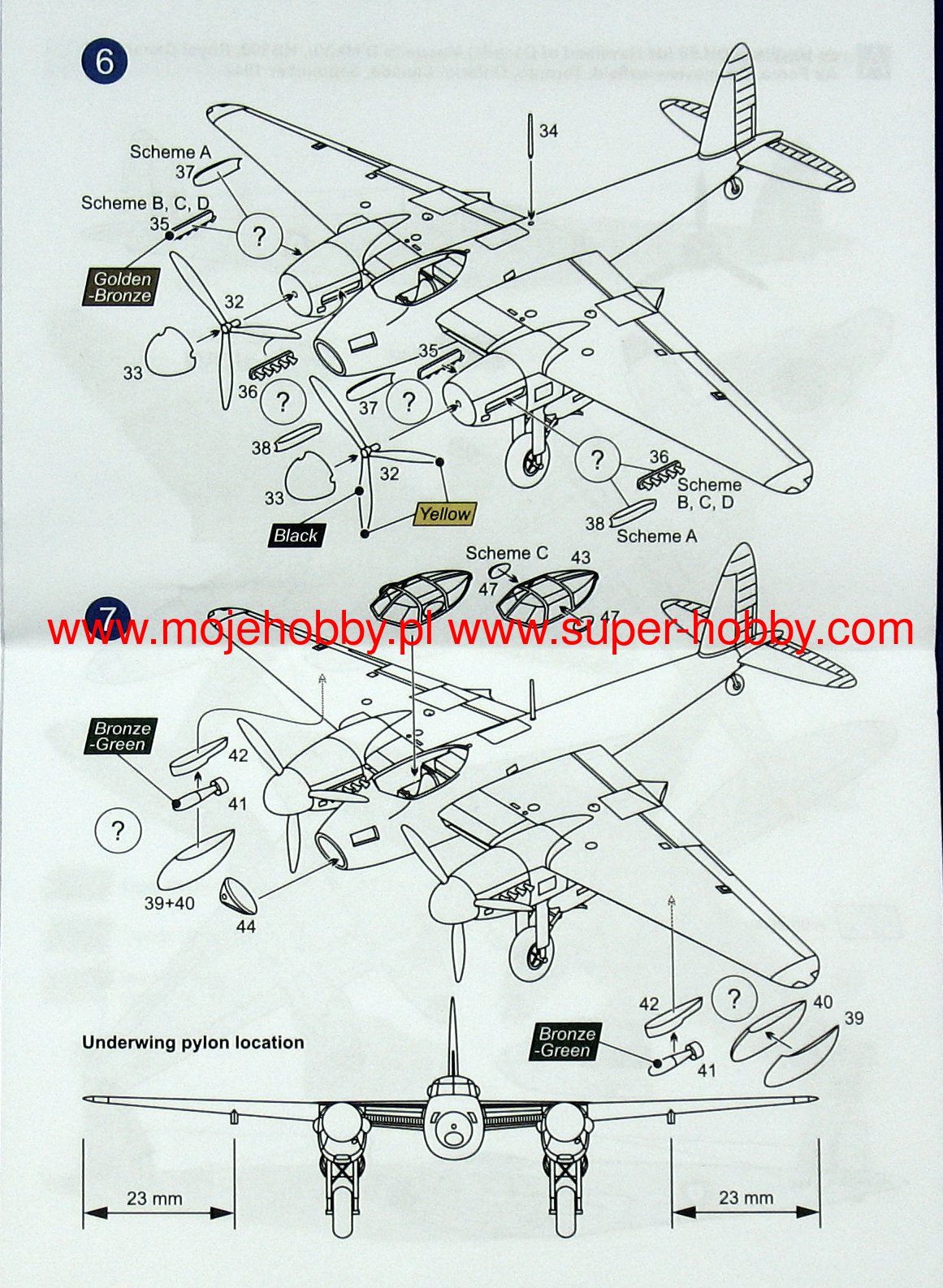 The De Havilland Mosquito is a British, twin-engine, multi-role aircraft with a mixed structure, mainly wooden, with a classic tail. The flight of the prototype took place on November 25, 1940, and the first machines entered the line units in July 1941. The machine was largely made of wooden elements glued with casein glues, and later with synthetic ones. Thanks to this, the machine was very light and showed great aerodynamic properties. Interestingly, it also turned out to be quite resistant to anti-aircraft fire. For this reason, the Mosquito quickly earned the nickname "wooden miracles". Two Rolls-Royce Merlin engines of different variants with power from 1460KM to 1680KM were used as the drive. During the war, a dozen or so versions of this very successful plane were created. The most important of them are, among others Mosquito PR.IX (reconnaissance version), B.IV series I and II (bomb version), F.II (hunting version), NF.II (night fighter with AI.IV radar), one of the most widely produced - FB.VI (fighter-bomber version). Mosquito planes performed numerous functions in the RAF, but the fighter-bomber and bomber versions were the most famous, which made daring raids on German public facilities (e.g. police or Gestapo headquarters) in occupied Europe, often with surgical precision. Technical data (Mosquito F. Mk.II): length: 13.57m, wingspan: 16.52m, height: 5.3m, maximum speed: 610km / h, climb speed: 8.8m / s, maximum range: 1500km , maximum ceiling 8,800m, armament: fixed - 4 7.7mm machine guns and 4 20mm Hispano Mk II cannons.