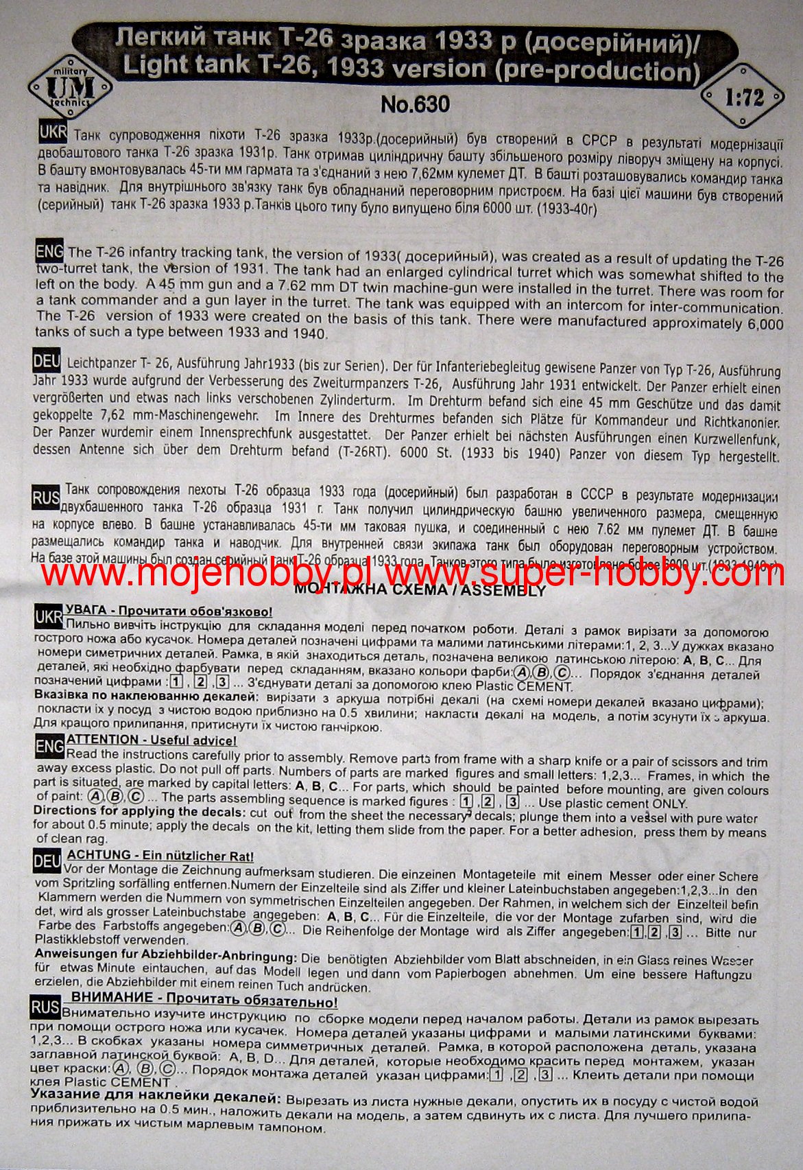 Т-26 советский лёгкий танк межвоенного периода и Великой Отечественной войны. Первые опытные образцы этой машины были изготовлены в 1931 году, а на вооружение машина поступила в 1931-1932 годах. За время производства было выпущено около 12 000 автомобилей этого типа, а также производные версии и специализированные автомобили! Боевая масса танка Т-26 в базовой версии составляла до 8,2 т. Привод обеспечивался одним 12-цилиндровым карбюраторным двигателем ГАЗ мощностью 90-91 л.с. Основное вооружение состояло из одной 45-мм пушки wz.1932 или wz.1934 и от 1 до 3 7,62-мм пулеметов ДТ. По сути, Т-26 был далеко идущим развитием британского Vickers 6-Ton. Машина также была основной советской машиной поддержки пехоты в 1930-х годах и в начале Второй мировой войны. Также стоит помнить, что первые прототипы машины и первые серийные партии имели две башни (Т-26 образца 1931 и 1932 годов), только с 1933 года танк выпускался в однобашенном варианте с 45-мм пушкой в качестве основного вооружение. В ходе производства было создано несколько вариантов Т-26 и специализированных модификаций, в том числе: Т-26 обр. 1938 г. (вариант с новой башней, с наклонными стенками), ЧТ-130 и ЧТ-133 (специализированные машины с огнеметы) и вагон СТ-26 (мостовой танк). Машины Т-26 принимали участие в многочисленных конфликтах 1930-х годов, включая пограничные инциденты в Маньчжурии в 1934-1945 годах и гражданскую войну в Испании (1936-1939 годы). Танки этого типа в значительных масштабах применялись также во время агрессии против Польши в сентябре 1939 г., в ходе Зимней войны (1939-1940 гг.), а также в войне с Японией 1939-1940 гг. Они также широко использовались на начальном этапе германо-советской войны в 1941 году. Стоит отметить, что существуют мнения о том, что последние модификации Т-26 (например, образца 1938 или 1939 года) мало чем уступали немецким танкам во время операций Барбаросса или Тайфун.