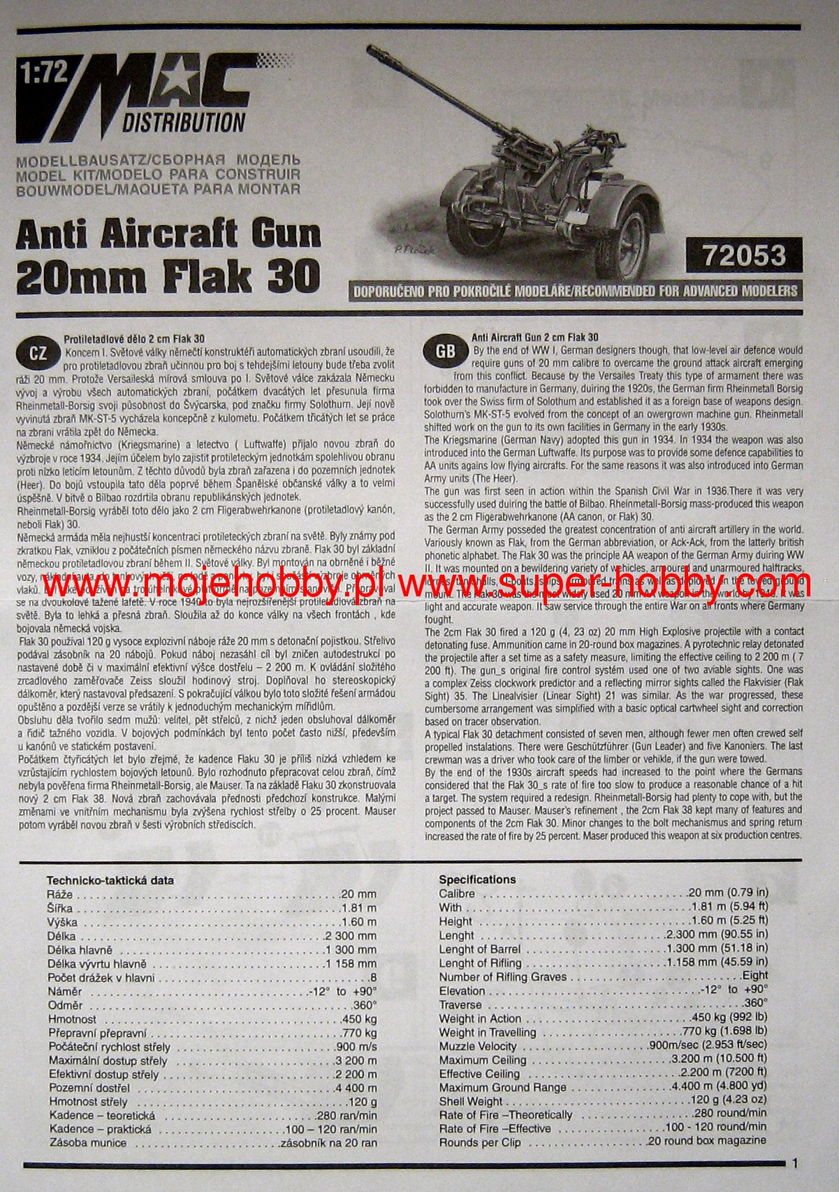 The 20mm Fliegerabwehrkanone 30 (Flak 30) is a German towed automatic anti-aircraft gun. The gun entered service in 1934 and was manufactured by Rheinmetall-Borsig and Mauser. It was a development of the Swiss Solothurn ST-5 cannon. The Flak 30 was "operated" by box magazines with 20 rounds each, which resulted in a low theoretical and actual rate of fire. Given the frequent jamming of this weapon and numerous failures, from 1940 it was replaced by the Flak 38 cannon, but in some units it survived until the end of World War II. Flak 30 was exported to China and the Netherlands. Technical data: range: horizontal - 4800 m, vertical - 3700 m, caliber: 20 mm, combat weight: 450 kg, rate of fire: 120 rounds / min, projectile speed: 830-900 m / s (depending on the missile).