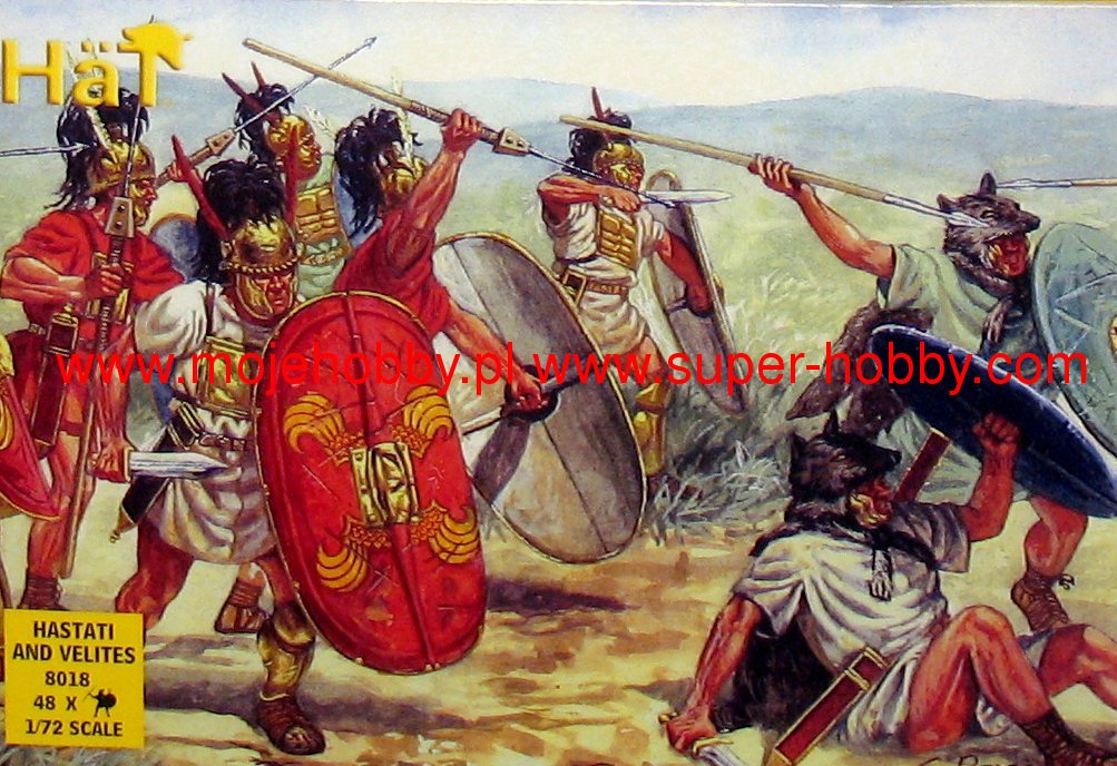 Welici (łac. Velites) to rzymska piechota lekkozbrojna z okresu Republiki (509 r. pne 31 r. pne), która formalnie funkcjonowała aż do reform konsula Mariusza przeprowadzonych ok. 100 r. pne. W formacji tej walczyli najczęściej najmłodsi i najmniej doświadczeni żołnierze, a zapewne także Ci, którzy wywodzili się z najuboższych warstw społecznych. Rola rzymskich Welitów na polu walki sprowadzała się do inicjowania harcowniczych potyczek z przeciwnikiem, osłaniania rozwijania się rzymskich legionów, jak również nękania przeciwnika. Pojedynczy żołnierz tej formacji był bardzo lekko uzbrojony. Główny oręż defensywny stanowiła okrągła tarcza (łac. parma) o średnicy rzadko przekraczającej 1 metr, natomiast na głowie posiadał lekki skórzany hełm. Bardo często Velites przywdziewali skóry dzikich zwierząt zwłaszcza wilków, nawiązując w ten sposób być może do mitu o Wilczycy Kapitolińskiej. Jako broń ofensywną stosowali przede wszystkim krótkie oszczepy o długości od 1 do 1,2 metra, a jako broni bocznej używali krótkich mieczy.Hastati (l. pojedyncza: Hastatus) to rzymska piechota z okresu Republiki (509 r. pne 31 r. pne), która formalnie funkcjonowała aż do reform konsula Mariusza przeprowadzonych ok. 100 r. pne. W formacji tej, podobnie jak w szeregach Principes, walczyli żołnierze o pewnym doświadczeniu bojowym, wywodzący się zapewne ze średniozamożnych warstw rzymskiego społeczeństwa. Hastati, wraz z Principes, stanowili trzon i główną siłę uderzeniową rzymskiego legionu. Stanowili też najliczniejszy rodzaj piechoty w legionie doby Republiki. To ich postawa najczęściej przesądzała o zwycięstwie lub porażce w bitwie. Pojedynczy żołnierz tej formacji jako uzbrojenie defensywne posiadał sporą, drewnianą tarczą (łac. scutum), która pośrodku posiadała wzmocnienie z żelaza (łac. umbo). Przyjmuje się, że taka tarcza weszła na uzbrojenie armii rzymskiej najpewniej w toku wojen samnickich (343-290 r. pne). Do tego dochodził metalowy napierśnik (łac. phylax), najczęściej jedna nagolenica oraz hełm z brązu często typu Montefortino. Jako broń boczną stosowano krótki miecz o nazwie gladius, a głównym orężem były dwa oszczepy o nazwie pilum. Tak uzbrojeni Hastati walczyli między innymi w toku wojen punickich (264-146 pne) czy w czasie wojen Rzymu z Macedonią i Państwem Seleukidów na początku II w. pne. Co oprócz modelu będę potrzebować do jego sklejenia?