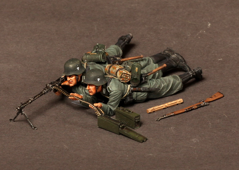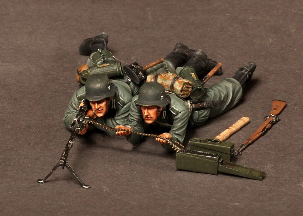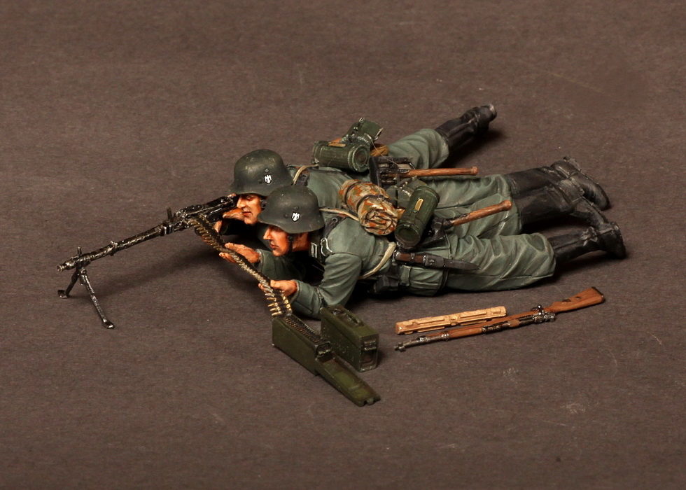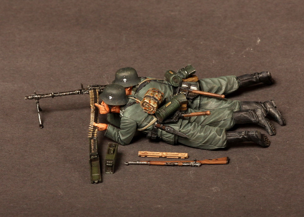 The MG34 (German: Maschinengewehr 34) is a German 7.92mm light machine gun from the Second World War. The first prototypes of this weapon were made in 1934, and serial production began in 1934 and continued until 1945. The initial velocity of the missile was up to 755 m / s, and the theoretical rate of fire - 900 rounds per minute. Scooters firing range from a gun mounted on a tripod was up to 1,800 meters. The weight of the weapon without a base or tripod is 11.5 kilograms. The MG34 was developed by the Mauser company as a new, universal, light machine gun of the German army, intended to replace the MG 08 and the LMG 08/15 from the World War I times. The work on the weapon progressed very quickly and already in 1934, i.e. a few months after its commencement, it was completed. As a result, however, a highly innovative weapon was created that could be fed with ammunition from both a drum magazine and an ammunition belt, could be mounted on a tripod (acting as a heavy machine gun), and be used based on a bipod. What's more - the MG34 could fire both single and continuous fire. In terms of performance, reliability and ballistic properties, it was one of the best weapons in its class in the world, but it was also time-consuming to manufacture and required careful handling. Hence, the MG42 rifle was developed, which was largely based on the MG34, but was simpler to use and manufacture, and cheaper. The MG34 machine gun was the staple rifle of the German army from the beginning of World War II, and despite being put into production in 1943, the MG42 was still manufactured and used as a secondary weapon on German armored vehicles and tanks.Based on the experience of World War I, the German army paid a lot of attention to the development of both light and heavy infantry machine weapons in the interwar period. The result of these efforts was the introduction into service in 1934 of the very successful MG34 machine gun, which replaced the less handy and much heavier MG08 or leMG 08/15 rifles. During World War II, another, equally successful, but cheaper to produce design was introduced - the MG42. Both of these rifles were de facto the basic machine weapons of the German infantry and armored grenadiers during World War II. Their very high rate of fire and high ballistic parameters meant that they were perceived as the basic support weapon at the level of a platoon or company, and often even a team. Interestingly, thanks to the relatively low weight, they could be successfully used both in offensive and in defense. Very often, in the course of combat operations, the soldier responsible for servicing the MG34 or MG42 was assigned from 2 to 3 ammunition to ensure that the rest of the team was firing machine guns uninterruptedly.