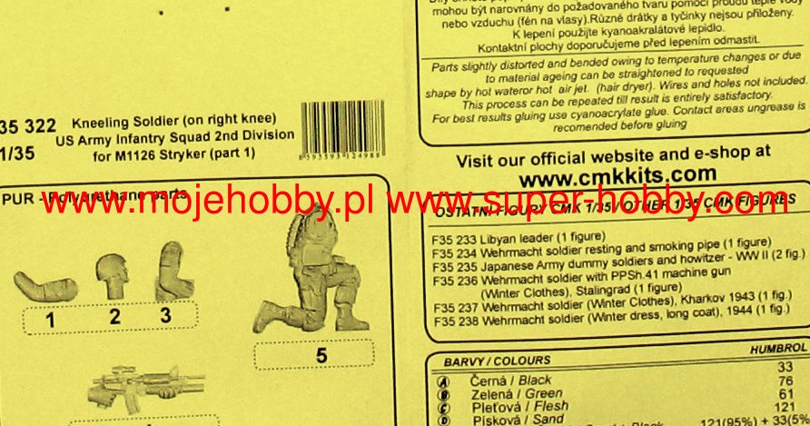 Amerykańska 2 Dywizja Piechoty (ang. 2nd Infantry Division) nazywana potocznie “The Indianhead” została sformowana w 1917 roku. Jednostka wzięła aktywny udział w I wojnie światowej, biorąc między innymi udział w bitwie pod Belleau Wood. W toku II wojny światowej została w 1943 r. przerzucona do Wielkiej Brytanii i poddano je intensywnemu szkoleniu pod kątem wykorzystania jednostki w toku działań w Normandii, w których faktycznie wzięła udział od 7 czerwca 1944 roku, a zatem dzień po D-Day. W latach 1944-1945 dywizja prowadziła operacje na terenie Normandii, północnej Francji oraz w Niemczech. Zasłużyła się szczególnie w czasie wojny koreańskiej (1950-1953). W latach 50. XX wieku dywizja przechodziła reorganizacje i planowano ją rozwiązać, ale finalnie porzucono te plany. Jednostka wzięła bardzo aktywny udział w działaniach stabilizacyjnych na terenie Iraku, począwszy od końca 2003 roku. Dywizja była w toku swego pobytu w Iraku odpowiedzialna za wiele zadań, wśród których można wskazać zadania patrolowe, stabilizacyjne, szkolenie oddziałów prorządowych oddziałów irackich czy działania de facto antyterrorystyczne. W 2009 r. część żołnierzy dywizji została skierowana do Afganistanu. W 2017 r. dywizja była złożona z dwóch Stryker Brigade Combat Team (SBCT), jednej brygady zmechanizowanej, brygady śmigłowcowej oraz innych jednostek wsparcia przede wszystkim artylerii i saperów. Obecnie, znaczna część dywizja stacjonuje na terenie Korei Południowej. Siły Zbrojne Stanów Zjednoczonych (ang. United States Armed Forces) to w chwili obecnej najpotężniejsze i najsilniejsze wojska na świecie, których aktywny personel wynosi ok.1,36 miliona ludzi oraz które w 2018 r. dysponowały budżetem na poziomie rzędu 686 miliardów dolarów. Jednym z ich najistotniejszych komponentów są wojska lądowe, czyli Armia Stanów Zjednoczonych (ang. United States Army), w których w 2017 r. służyło 476.000 żołnierzy w linii. Najliczniejszym rodzajem wojska występującym w siłach lądowych jest rzecz jasna piechota przede wszystkim zmotoryzowana oraz zmechanizowana. Jest ona przydzielana teoretycznie do dywizji, ale w praktyce bardzo często działa w ramach Brygadowych Zespołów Bojowych (ang. Brigade Combat Team). Dla jednostek piechoty stosuje się podział na klasyczną brygadę piechoty (ang. Infantry Brigade Combat Team) złożoną między innymi z trzech batalionów piechoty oraz jednostek wsparcia. W 2014 r. liczyła ona ok. 4400 ludzi oraz brygadę piechoty na wozach Stryker (ang. Stryker Brigade Combat Team) opartą na trzech batalionach piechoty zmotoryzowanej oraz jednostkach wsparcia. W 2014 r. liczyła ona ok. 4500 żołnierzy oraz 307 wozów Styker w różnych wersjach. Amerykańska piechota służy również w brygadach pancernych (ang. Armoured Brigade Combat Team), w kompaniach i batalionach piechoty zmechanizowanej. Podstawową bronią strzelecką amerykańskiego piechura są karabiny z rodziny M16 i M4 kal. 5,56 mm. W ramach ciekawostki, można podać, że szeregowy (Private E1) US Army zarabia rocznie ok.20.200 dolarów, natomiast sierżant (Sergeant E5) z 2-letnim doświadczeniem już ok.28.700 dolarów. Są to uposażenia podstawowe - bez dodatków i bonusów. Co oprócz modelu będę potrzebować do jego sklejenia?