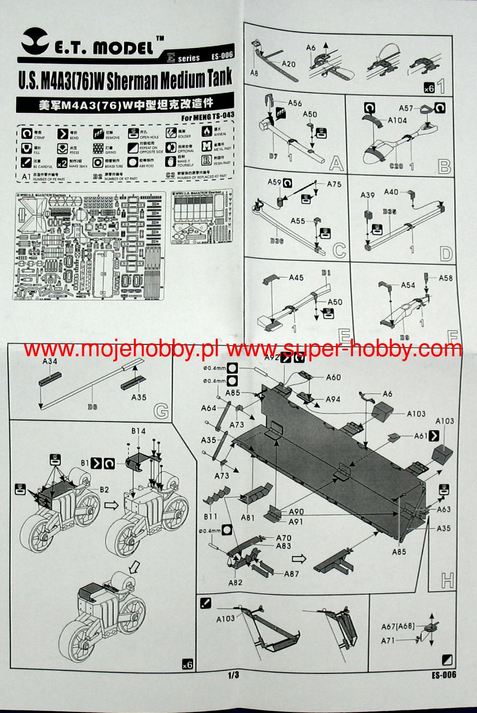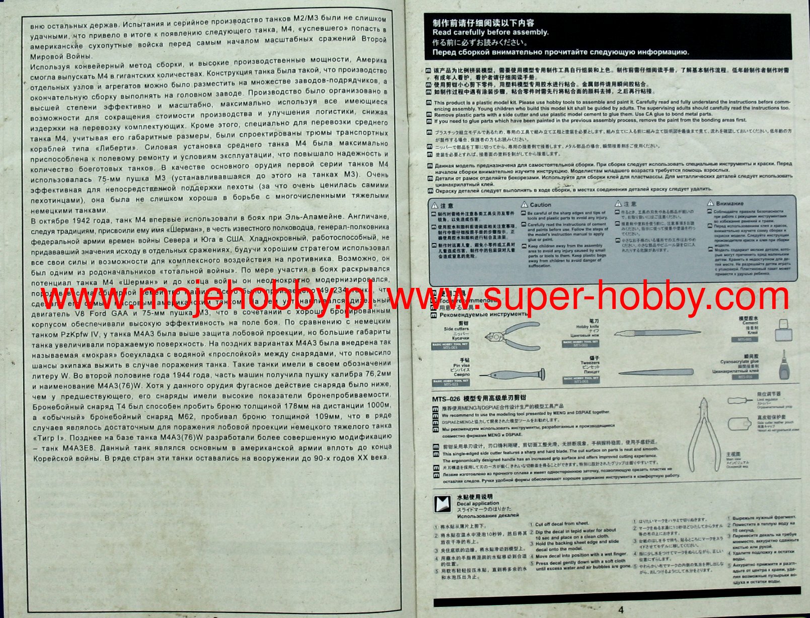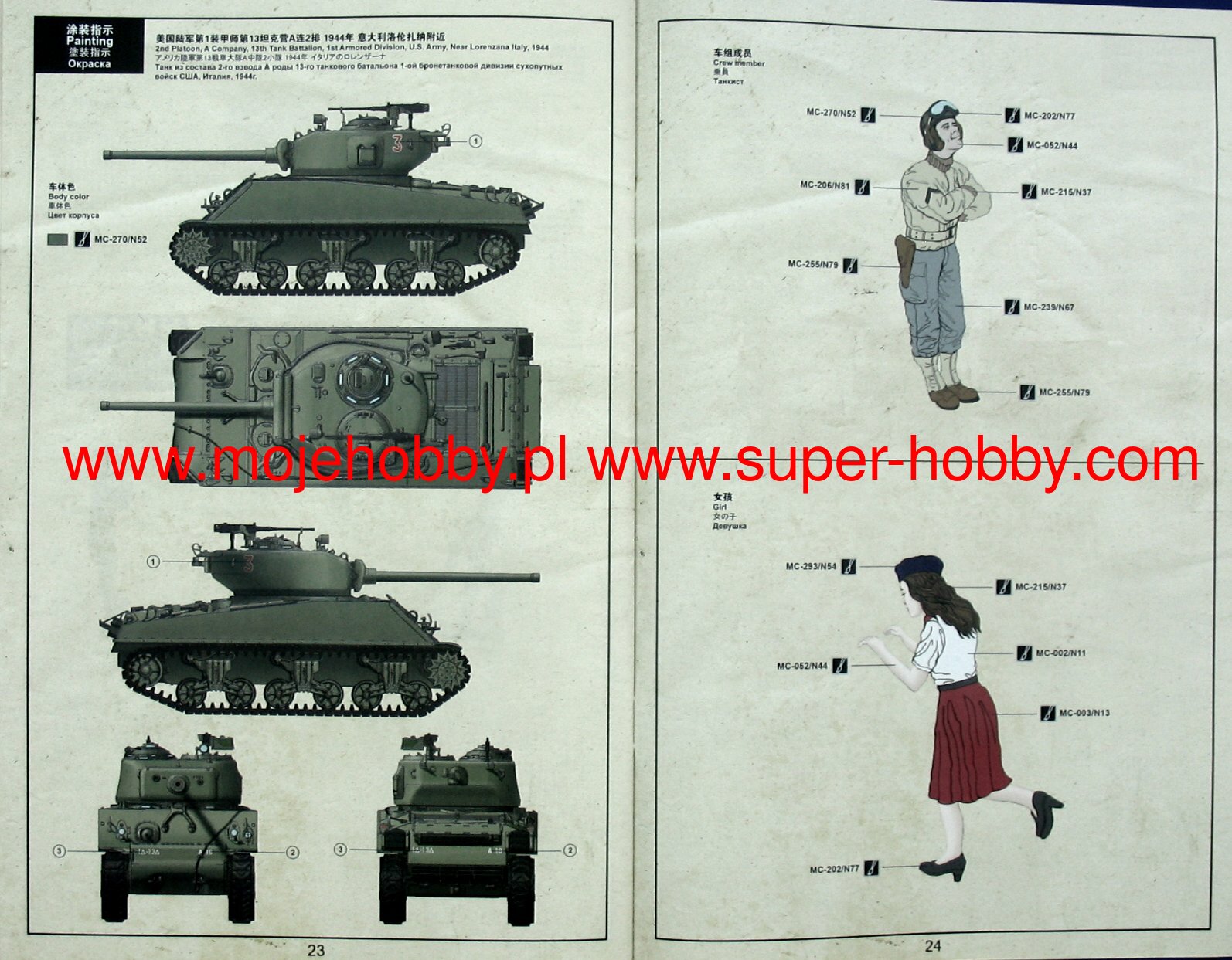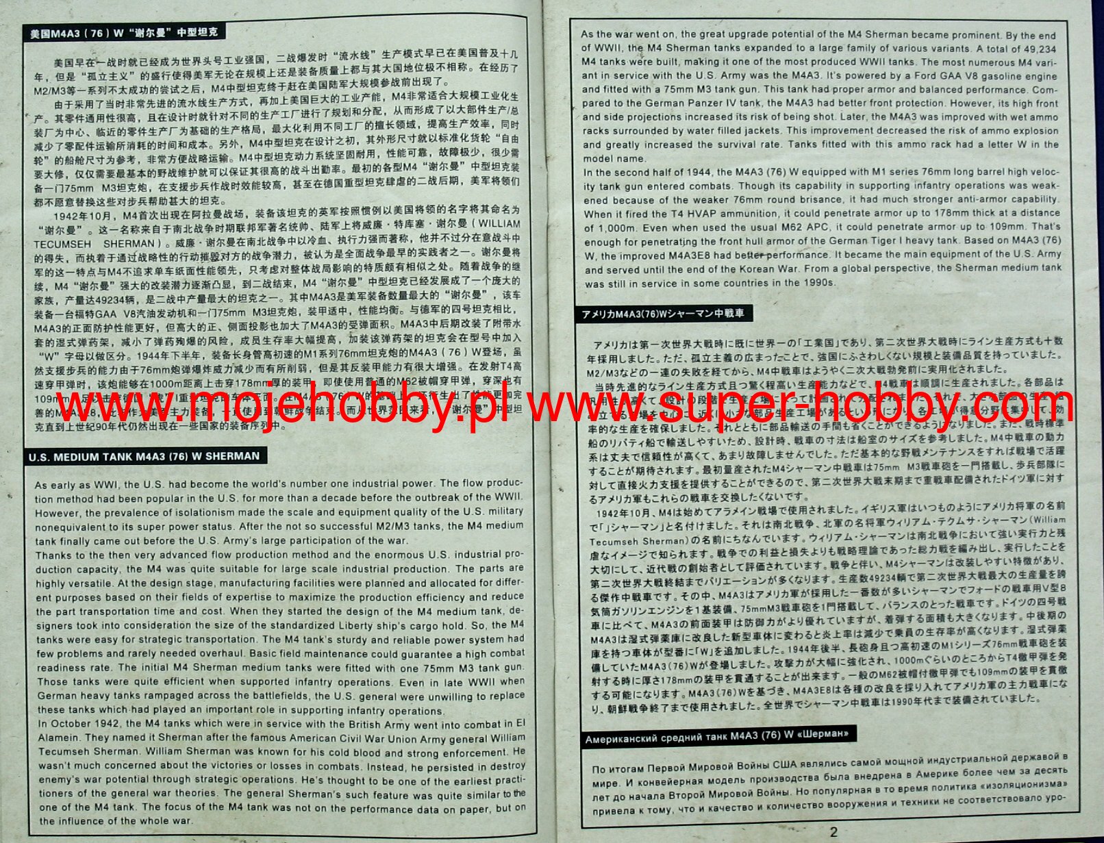 The M4 Sherman was an American medium tank from the Second World War. The first prototypes were built in 1941, and serial production was carried out in the period 1942-1945. In total, about 49,000 copies of this tank of all versions were created, which makes it one of the most produced tanks of the Second World War and the most important tank in the equipment of the Allied armies during this conflict. The M4 Sherman was powered by a single engine version of the M4A1 Continental R 975 C4 with a power of 400 hp . The vehicle was armed with - depending on the version - a single 75mm M3 cannon or a 76mm M1 cannon or a 105mm M4 howitzer and two 7.62mm Browning1919A machine guns. The M4 Sherman was developed as the successor to the M2 and M3 tanks, although it used many of the latter's components. First of all, it only used a slightly changed chassis of the M3 Lee car. When designing the M4 Sherman, the emphasis was primarily on playing the role of an infantry support vehicle, and not fighting enemy tanks - this was the role of American tank destroyers. Only possible clashes with the carts were assumed Pz.Kpfw III and Pz.Kpfw IV. A significant role was also played in the mass production of the new tank and the lowest possible production costs. The result was a tank with good armament for 1942 and early 1943, average armor, but with a tilted front plate, but also with poor maneuverability and - especially in the first versions - very susceptible to fire as a result of hitting the engine compartment . At the same time, however, a tank was created that could be truly large-scale production and had a significant modernization potential. Many development versions were created in the course of serial production M4 Sherman. Chronologically the first was the M4A1 version that already had a cast armor. Another - M4A2 - had welded armor and a new General Motors 6460 engine with 375-410hp, but much less prone to fire. A version of the M4A3 also appeared, armed with a 105 mm howitzer and powered by a Ford GAA engine with a capacity of 450 HP. Based on the M4A3 version, two sub-versions were created: the M4A3E2 Jumbo with reinforced armor and the M4A3E8 with the HVSS and 76mm gun. An interesting development version was also the T34 Calliope with mounted missiles not guided on the turret. The M4 Sherman was also supplied in huge numbers to the British and Red Army. The former developed a version of the Firefly based on it, with a great 17-pounder anti-tank gun. During World War II, M4 Sherman tanks fought in North Africa (1942-1943), Italy (1943-1945), during the battles in Normandy, France and West Germany (1944-1945), but also in the Pacific or in the ranks The Red Army on the Eastern Front. After World War II, the M4 Sherman was used in many countries, including Argentina, Belgium, India, Israel, Japan, Pakistan and Turkey. He also took part in many post-1945 conflicts, including the Indo-Pakistani War of 1965 and the Six-Day War of 1967.Already after the first experiences of fighting in North Africa at the turn of 1942-1943, the US Army changed the position of the American armored division. From 1943, the full-time armored division consisted of three armored battalions, three mechanized infantry battalions, three artillery battalions and many support units. The exception was the 2nd and 3rd Panzer Divisions, which retained the structure with two armored regiments, three armored battalions each. For this reason, they were often called heavy armored divisions. The armored battalion of other divisions than the 2nd and 3rd consisted of three armored companies - three of medium tanks (M4 Sherman) and one of light tanks (M3 / M5 Stuart). In turn, the mechanized infantry battalion consisted of three infantry companies, a service company and a staff sub-unit. The American armored division also had, like the infantry division, a very strong artillery component, consisting of self-propelled artillery - most often M7 Priest howitzers, of which there were 54 full-time units in the division. In total, the American armored division consisted of, among others: approx. 11,000 men, approx. 250 tanks and approx. 500 M2 / M3 armored personnel carriers.
