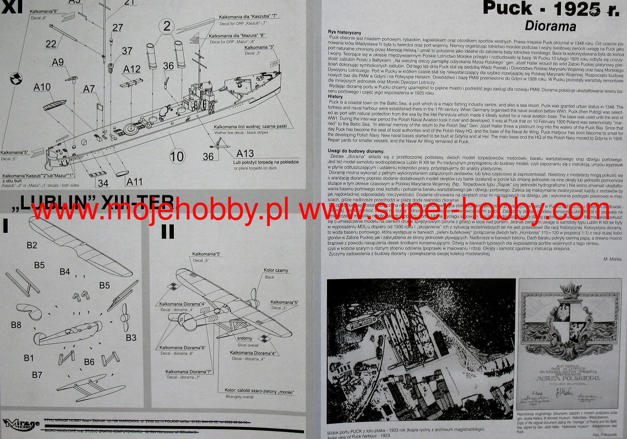 Download Mirage Hobby PDF catalogueORP Nurek was a Polish diving base ship from the interwar period and World War II. The keel for this unit was laid in 1935, and the launch took place in 1936. The displacement of the unit reached 110 tons. The total length of the ship at the time of launching was 29 meters and 6 meters wide. The maximum speed did not exceed 10 knots. The armament at the time of the launch consisted of two 7.92 mm Maxim wz. 08 machine guns. The quantitative development of the Polish Navy in the 1930s, as well as the acquisition of three Wilk-type submarines, made it necessary to have appropriate facilities, especially a rescue ship, which would also be a diving base. Such tasks were to be fulfilled by ORP Nurek, which was built by the Navy Port Workshops in Gdynia. A modernized engine, known from the Jaskółka-type minesweepers, was used as the drive. At ORP Nurek, there is also a specialized Polish-made decompression chamber. In the years 1936-1939, the unit performed various side and auxiliary tasks. Unfortunately, ORP Nurek was sunk on September 1, 1939 as a result of an air raid by the Luftwaffe on the Oksywie military port.Despite the fact that Puck is a city much smaller than Szczecin, Gdańsk or Gdynia, it has played a significant role in the history of Polish maritime affairs. First of all, in this noble city (town privileges were granted in the 14th century), a military port and a fortress operated from the first half of the 17th century. The favorable location of Puck (German: Putzig) was also noticed by the Germans, who during World War I (1914-1918) had their seaplane base here. Considering the above, it is not surprising that after regaining independence in 1918, the Polish Navy (PMW for short) very quickly became interested in Puck as a potential base and - before Gdynia was established - located here its main command and the command of the Naval Aviation Squadron. However, in 1926 the main command of the PMW was moved to Gdynia, leaving only the Air Squadron in Puck with its command and facilities. It is also worth adding that it was in Puck in 1920 that the ceremony of Poland's wedding to the sea was held by General Haller.