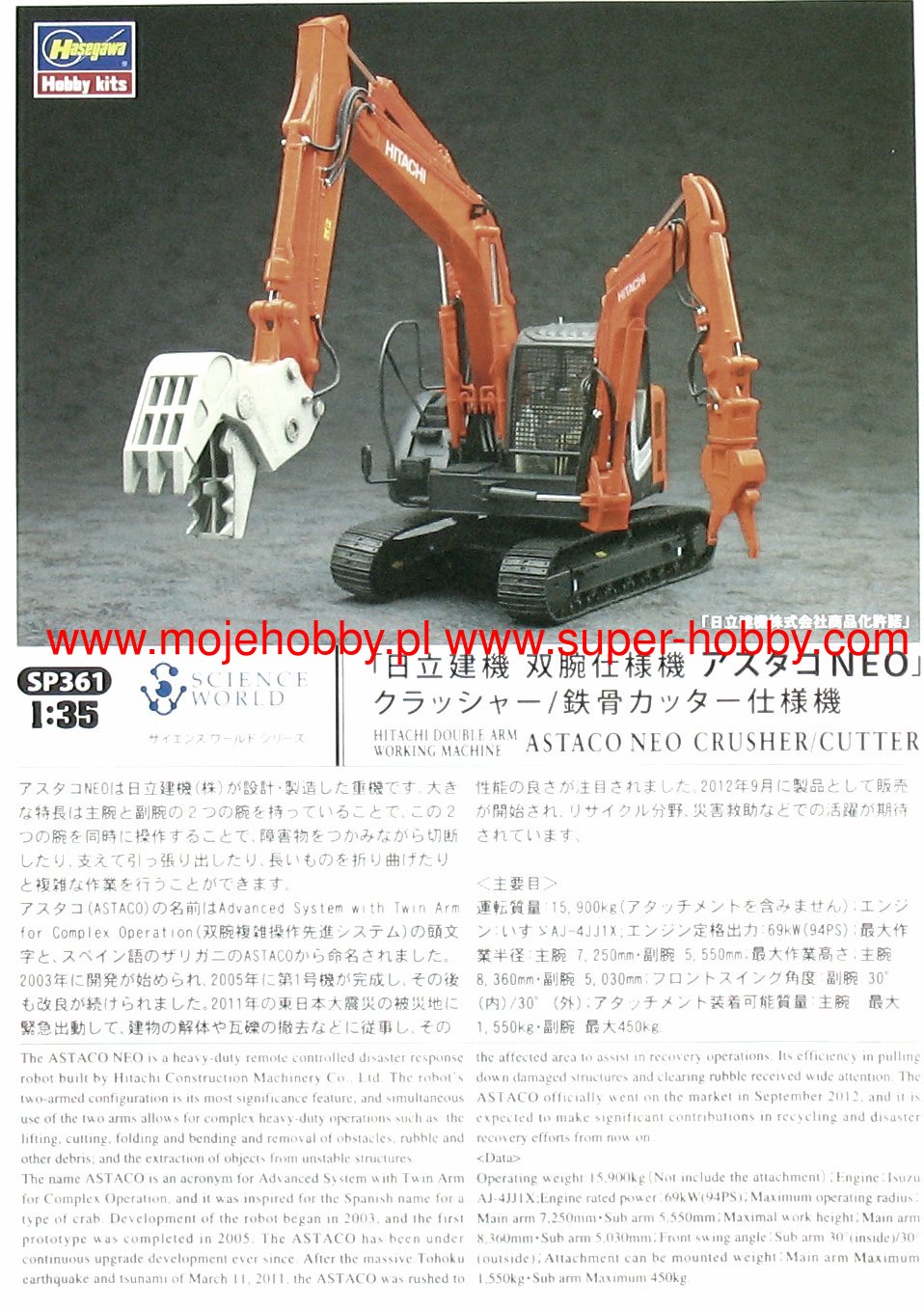 The Hitachi Astaco Neo is a modern, specialized construction and engineering machine with a tracked chassis. The total weight of the vehicle in working order is 15.9 tons. The drive is provided by a single Isuzu engine and 94 HP. The total length of the main arm is approximately 7.3 meters, and the secondary arm is approximately 5.6 meters. The maximum load of the first one is nearly 1.6 tons, and the second one - 450 kilograms. Hitachi concern (actually: Share Company Hitachi Manufacturing Plant ) was founded in 1910 and operates to this day, specializing in such industries as, for example, advanced computer systems, high-speed railways, automotive electronics and construction machinery. The presented Hitachi Astaco Neo machine is an example of the company's operation in the latter area. Design work on this machine started in 2003, and the first prototype was ready two years later. Shortly thereafter, the machine entered serial production and the market. The main purpose of Hitachi Astaco Neo is to repair the damage caused by natural disasters. Thus, when designing this machine, the highest reliability and durability of the structure, as well as the possibility of simultaneous operation of both of its arms, were taken into account. It is worth adding that the Hitachi Astaco Neo machine was used to repair the damage caused by the earthquake and tsunami wave in Tohoku Prefecture in 2011.